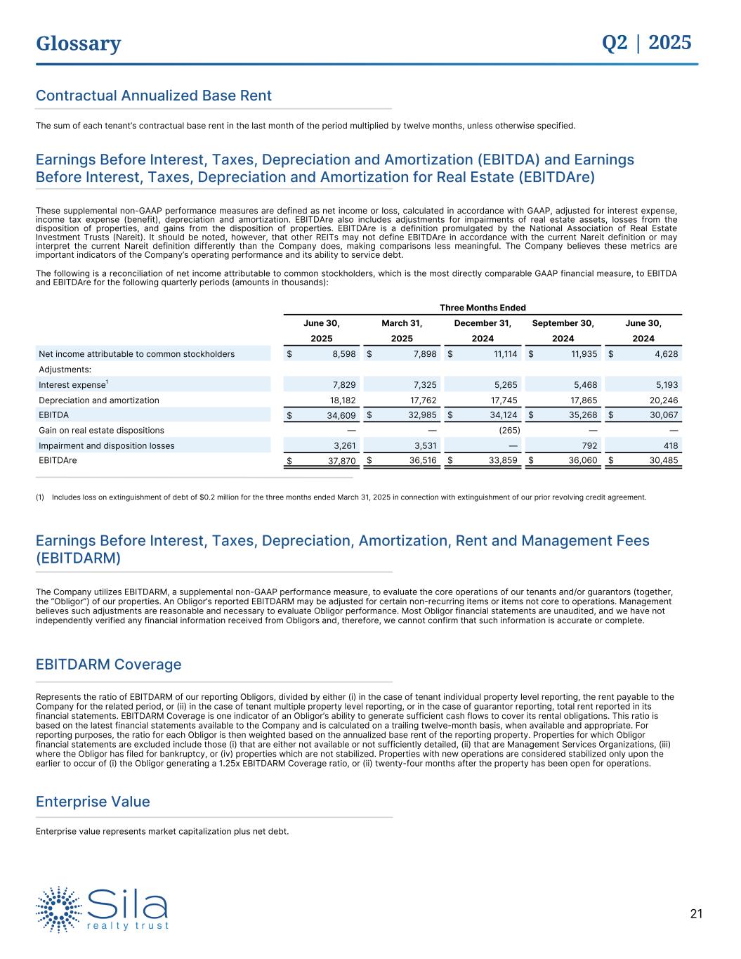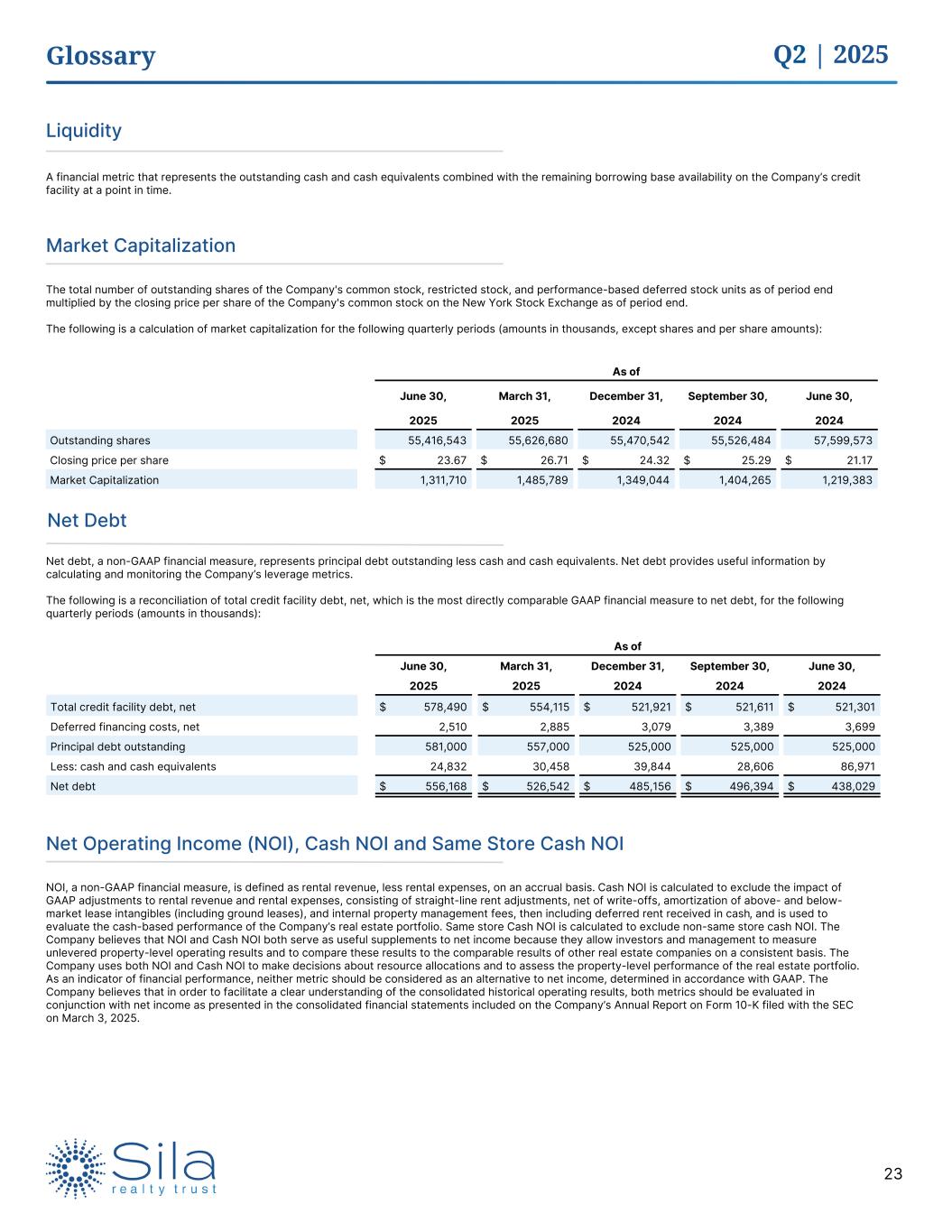 Q2 | 2025 4 Three Months Ended Interest Coverage Ratio June 30, March 31, December 31, September 30, June 30, 2025 2025 2024 2024 2024 Interest expense $ 7,829 $ 7,325 $ 5,265 $ 5,468 $ 5,193 EBITDAre 37,870 36,516 33,859 36,060 30,485 Interest coverage ratio 4.8 x 5.0 x 6.4 x 6.6 x 5.9 x As of Net Debt Ratios June 30, March 31, December 31, September 30, June 30, 2025 2025 2024 2024 2024 Principal debt outstanding $ 581,000 $ 557,000 $ 525,000 $ 525,000 $ 525,000 Less: cash and cash equivalents 24,832 30,458 39,844 28,606 86,971 Net debt 556,168 526,542 485,156 496,394 438,029 EBITDAre annualized1 153,432 149,712 148,080 143,292 142,680 Net debt to EBITDAre ratio 3.6 x 3.5 x 3.3 x 3.5 x 3.1 x Net debt $ 556,168 $ 526,542 $ 485,156 $ 496,394 $ 438,029 Market capitalization 1,311,710 1,485,789 1,349,044 1,404,265 1,219,383 Enterprise value 1,867,878 2,012,331 1,834,200 1,900,659 1,657,412 Net debt to enterprise value 29.8 % 26.2 % 26.5 % 26.1 % 26.4 % Financial Statistics and Ratios (dollars in thousands, except per share amounts) See the glossary for a description of the Company's non-GAAP financial and operating metrics. Financial Metrics June 30, 2025 Other Key Metrics June 30, 2025 Net debt enterprise value 29.8 % Total real estate investments at cost $ 2,300,141 Net debt to EBITDAre ratio 3.6 x Common stock (NYSE: SILA) price per share $ 23.67 Interest coverage ratio 4.8 x Annualized distribution per share3 $ 1.60 Liquidity2 $ 568,832 (1) EBITDAre is annualized by taking the current month amount, removing lease termination income and items that are not a result of normal operations, and multiplying by twelve months. (2) Liquidity represents cash and cash equivalents of $24.8 million and borrowing base availability on the Company’s credit facility of $544.0 million as of June 30, 2025. (3) Represents annualized amount of distributions paid during the quarter ended June 30, 2025.