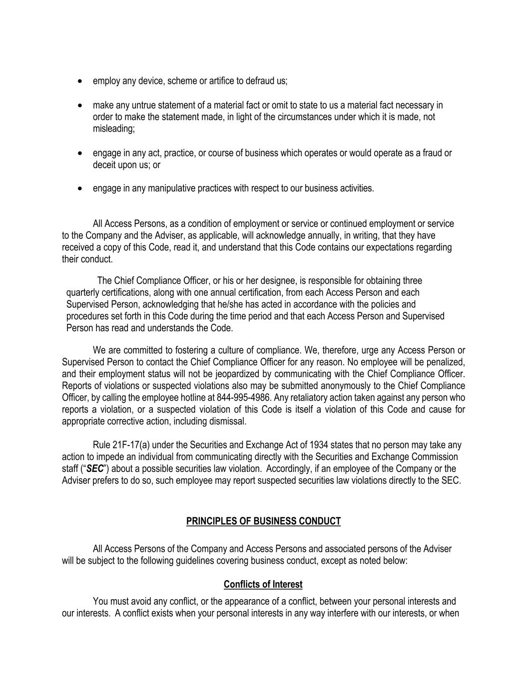 • employ any device, scheme or artifice to defraud us; • make any untrue statement of a material fact or omit to state to us a material fact necessary in order to make the statement made, in light of the circumstances under which it is made, not misleading; • engage in any act, practice, or course of business which operates or would operate as a fraud or deceit upon us; or • engage in any manipulative practices with respect to our business activities. All Access Persons, as a condition of employment or service or continued employment or service to the Company and the Adviser, as applicable, will acknowledge annually, in writing, that they have received a copy of this Code, read it, and understand that this Code contains our expectations regarding their conduct. The Chief Compliance Officer, or his or her designee, is responsible for obtaining three quarterly certifications, along with one annual certification, from each Access Person and each Supervised Person, acknowledging that he/she has acted in accordance with the policies and procedures set forth in this Code during the time period and that each Access Person and Supervised Person has read and understands the Code. We are committed to fostering a culture of compliance. We, therefore, urge any Access Person or Supervised Person to contact the Chief Compliance Officer for any reason. No employee will be penalized, and their employment status will not be jeopardized by communicating with the Chief Compliance Officer. Reports of violations or suspected violations also may be submitted anonymously to the Chief Compliance Officer, by calling the employee hotline at 844-995-4986. Any retaliatory action taken against any person who reports a violation, or a suspected violation of this Code is itself a violation of this Code and cause for appropriate corrective action, including dismissal. Rule 21F-17(a) under the Securities and Exchange Act of 1934 states that no person may take any action to impede an individual from communicating directly with the Securities and Exchange Commission staff (“SEC”) about a possible securities law violation. Accordingly, if an employee of the Company or the Adviser prefers to do so, such employee may report suspected securities law violations directly to the SEC. PRINCIPLES OF BUSINESS CONDUCT All Access Persons of the Company and Access Persons and associated persons of the Adviser will be subject to the following guidelines covering business conduct, except as noted below: Conflicts of Interest You must avoid any conflict, or the appearance of a conflict, between your personal interests and our interests. A conflict exists when your personal interests in any way interfere with our interests, or when