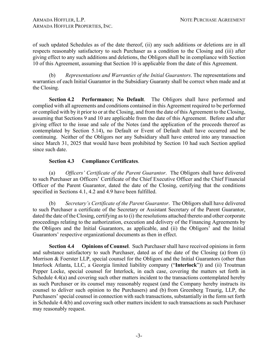 ARMADA HOFFLER, L.P. NOTE PURCHASE AGREEMENT ARMADA HOFFLER PROPERTIES, INC. -3- of such updated Schedules as of the date thereof, (ii) any such additions or deletions are in all respects reasonably satisfactory to such Purchaser as a condition to the Closing and (iii) after giving effect to any such additions and deletions, the Obligors shall be in compliance with Section 10 of this Agreement, assuming that Section 10 is applicable from the date of this Agreement. (b) Representations and Warranties of the Initial Guarantors. The representations and warranties of each Initial Guarantor in the Subsidiary Guaranty shall be correct when made and at the Closing. Section 4.2 Performance; No Default. The Obligors shall have performed and complied with all agreements and conditions contained in this Agreement required to be performed or complied with by it prior to or at the Closing, and from the date of this Agreement to the Closing, assuming that Sections 9 and 10 are applicable from the date of this Agreement. Before and after giving effect to the issue and sale of the Notes (and the application of the proceeds thereof as contemplated by Section 5.14), no Default or Event of Default shall have occurred and be continuing. Neither of the Obligors nor any Subsidiary shall have entered into any transaction since March 31, 2025 that would have been prohibited by Section 10 had such Section applied since such date. Section 4.3 Compliance Certificates. (a) Officers’ Certificate of the Parent Guarantor. The Obligors shall have delivered to such Purchaser an Officers’ Certificate of the Chief Executive Officer and the Chief Financial Officer of the Parent Guarantor, dated the date of the Closing, certifying that the conditions specified in Sections 4.1, 4.2 and 4.9 have been fulfilled. (b) Secretary’s Certificate of the Parent Guarantor. The Obligors shall have delivered to such Purchaser a certificate of the Secretary or Assistant Secretary of the Parent Guarantor, dated the date of the Closing, certifying as to (i) the resolutions attached thereto and other corporate proceedings relating to the authorization, execution and delivery of the Financing Agreements by the Obligors and the Initial Guarantors, as applicable, and (ii) the Obligors’ and the Initial Guarantors’ respective organizational documents as then in effect. Section 4.4 Opinions of Counsel. Such Purchaser shall have received opinions in form and substance satisfactory to such Purchaser, dated as of the date of the Closing (a) from (i) Morrison & Foerster LLP, special counsel for the Obligors and the Initial Guarantors (other than Interlock Atlanta, LLC, a Georgia limited liability company (“Interlock”)) and (ii) Troutman Pepper Locke, special counsel for Interlock, in each case, covering the matters set forth in Schedule 4.4(a) and covering such other matters incident to the transactions contemplated hereby as such Purchaser or its counsel may reasonably request (and the Company hereby instructs its counsel to deliver such opinion to the Purchasers) and (b) from Greenberg Traurig, LLP, the Purchasers’ special counsel in connection with such transactions, substantially in the form set forth in Schedule 4.4(b) and covering such other matters incident to such transactions as such Purchaser may reasonably request.