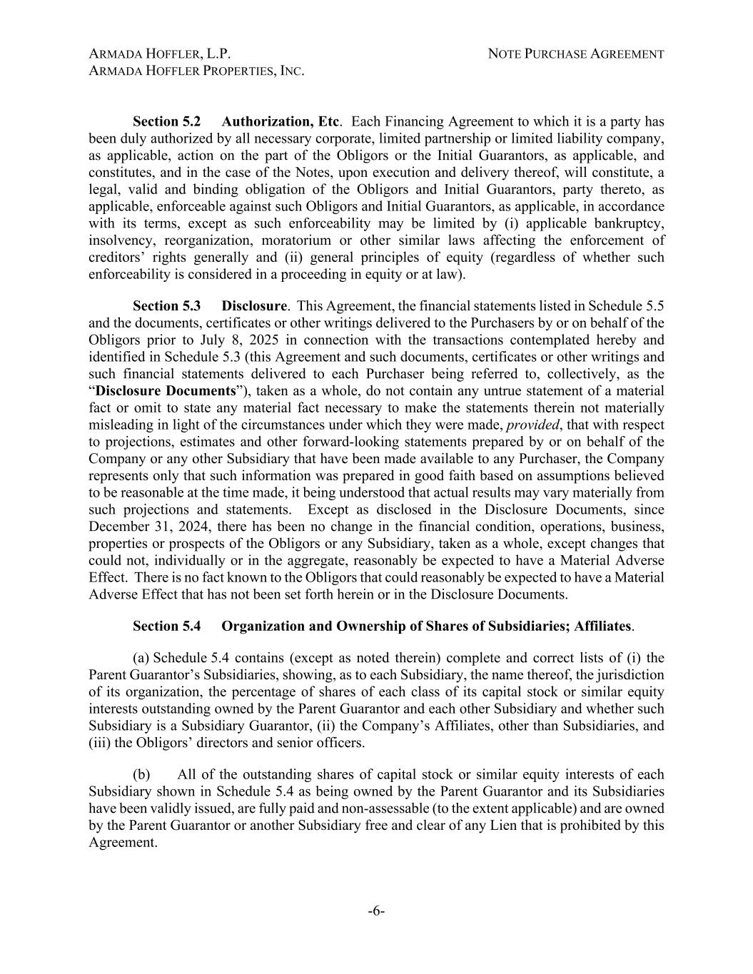 ARMADA HOFFLER, L.P. NOTE PURCHASE AGREEMENT ARMADA HOFFLER PROPERTIES, INC. -6- Section 5.2 Authorization, Etc. Each Financing Agreement to which it is a party has been duly authorized by all necessary corporate, limited partnership or limited liability company, as applicable, action on the part of the Obligors or the Initial Guarantors, as applicable, and constitutes, and in the case of the Notes, upon execution and delivery thereof, will constitute, a legal, valid and binding obligation of the Obligors and Initial Guarantors, party thereto, as applicable, enforceable against such Obligors and Initial Guarantors, as applicable, in accordance with its terms, except as such enforceability may be limited by (i) applicable bankruptcy, insolvency, reorganization, moratorium or other similar laws affecting the enforcement of creditors’ rights generally and (ii) general principles of equity (regardless of whether such enforceability is considered in a proceeding in equity or at law). Section 5.3 Disclosure. This Agreement, the financial statements listed in Schedule 5.5 and the documents, certificates or other writings delivered to the Purchasers by or on behalf of the Obligors prior to July 8, 2025 in connection with the transactions contemplated hereby and identified in Schedule 5.3 (this Agreement and such documents, certificates or other writings and such financial statements delivered to each Purchaser being referred to, collectively, as the “Disclosure Documents”), taken as a whole, do not contain any untrue statement of a material fact or omit to state any material fact necessary to make the statements therein not materially misleading in light of the circumstances under which they were made, provided, that with respect to projections, estimates and other forward-looking statements prepared by or on behalf of the Company or any other Subsidiary that have been made available to any Purchaser, the Company represents only that such information was prepared in good faith based on assumptions believed to be reasonable at the time made, it being understood that actual results may vary materially from such projections and statements. Except as disclosed in the Disclosure Documents, since December 31, 2024, there has been no change in the financial condition, operations, business, properties or prospects of the Obligors or any Subsidiary, taken as a whole, except changes that could not, individually or in the aggregate, reasonably be expected to have a Material Adverse Effect. There is no fact known to the Obligors that could reasonably be expected to have a Material Adverse Effect that has not been set forth herein or in the Disclosure Documents. Section 5.4 Organization and Ownership of Shares of Subsidiaries; Affiliates. (a) Schedule 5.4 contains (except as noted therein) complete and correct lists of (i) the Parent Guarantor’s Subsidiaries, showing, as to each Subsidiary, the name thereof, the jurisdiction of its organization, the percentage of shares of each class of its capital stock or similar equity interests outstanding owned by the Parent Guarantor and each other Subsidiary and whether such Subsidiary is a Subsidiary Guarantor, (ii) the Company’s Affiliates, other than Subsidiaries, and (iii) the Obligors’ directors and senior officers. (b) All of the outstanding shares of capital stock or similar equity interests of each Subsidiary shown in Schedule 5.4 as being owned by the Parent Guarantor and its Subsidiaries have been validly issued, are fully paid and non-assessable (to the extent applicable) and are owned by the Parent Guarantor or another Subsidiary free and clear of any Lien that is prohibited by this Agreement.