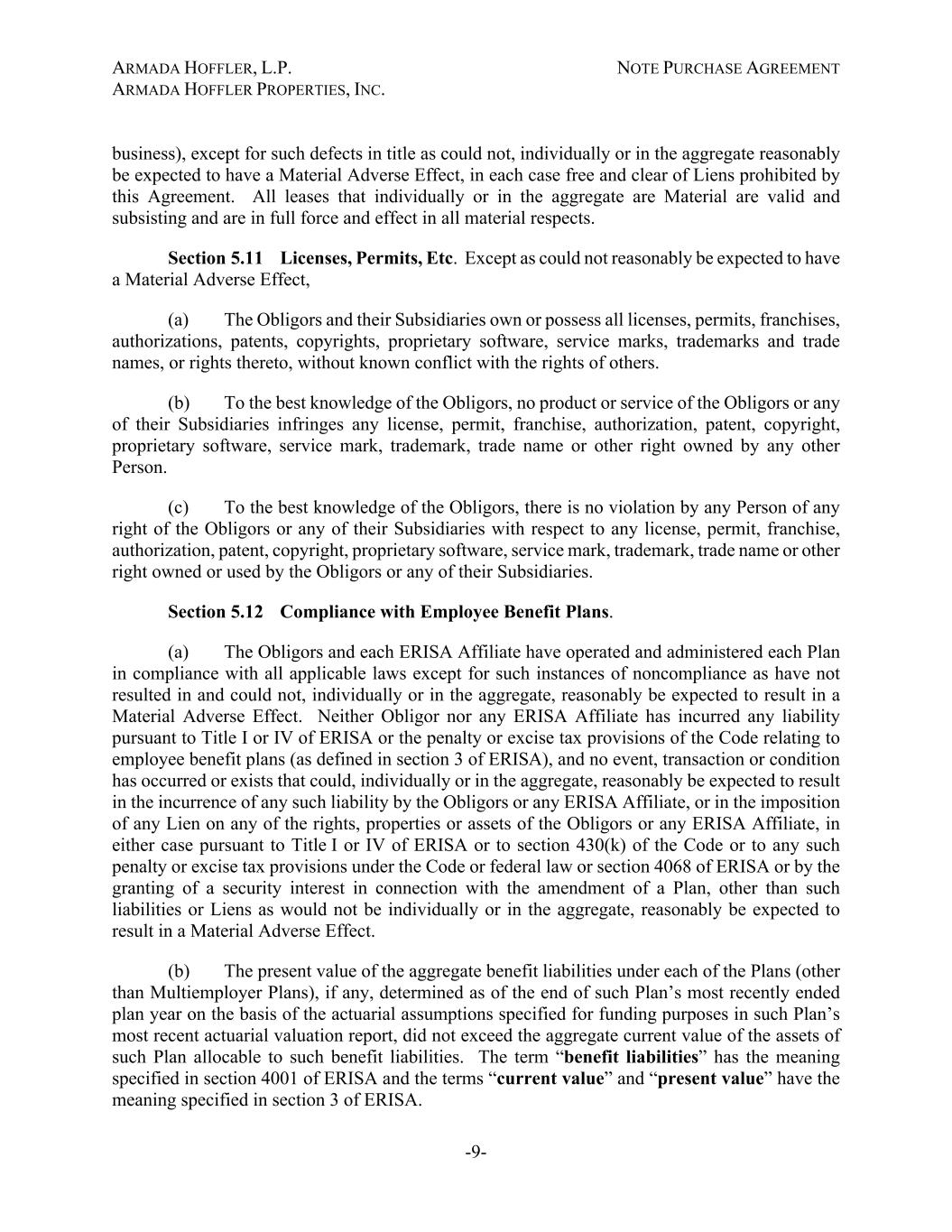 ARMADA HOFFLER, L.P. NOTE PURCHASE AGREEMENT ARMADA HOFFLER PROPERTIES, INC. -9- business), except for such defects in title as could not, individually or in the aggregate reasonably be expected to have a Material Adverse Effect, in each case free and clear of Liens prohibited by this Agreement. All leases that individually or in the aggregate are Material are valid and subsisting and are in full force and effect in all material respects. Section 5.11 Licenses, Permits, Etc. Except as could not reasonably be expected to have a Material Adverse Effect, (a) The Obligors and their Subsidiaries own or possess all licenses, permits, franchises, authorizations, patents, copyrights, proprietary software, service marks, trademarks and trade names, or rights thereto, without known conflict with the rights of others. (b) To the best knowledge of the Obligors, no product or service of the Obligors or any of their Subsidiaries infringes any license, permit, franchise, authorization, patent, copyright, proprietary software, service mark, trademark, trade name or other right owned by any other Person. (c) To the best knowledge of the Obligors, there is no violation by any Person of any right of the Obligors or any of their Subsidiaries with respect to any license, permit, franchise, authorization, patent, copyright, proprietary software, service mark, trademark, trade name or other right owned or used by the Obligors or any of their Subsidiaries. Section 5.12 Compliance with Employee Benefit Plans. (a) The Obligors and each ERISA Affiliate have operated and administered each Plan in compliance with all applicable laws except for such instances of noncompliance as have not resulted in and could not, individually or in the aggregate, reasonably be expected to result in a Material Adverse Effect. Neither Obligor nor any ERISA Affiliate has incurred any liability pursuant to Title I or IV of ERISA or the penalty or excise tax provisions of the Code relating to employee benefit plans (as defined in section 3 of ERISA), and no event, transaction or condition has occurred or exists that could, individually or in the aggregate, reasonably be expected to result in the incurrence of any such liability by the Obligors or any ERISA Affiliate, or in the imposition of any Lien on any of the rights, properties or assets of the Obligors or any ERISA Affiliate, in either case pursuant to Title I or IV of ERISA or to section 430(k) of the Code or to any such penalty or excise tax provisions under the Code or federal law or section 4068 of ERISA or by the granting of a security interest in connection with the amendment of a Plan, other than such liabilities or Liens as would not be individually or in the aggregate, reasonably be expected to result in a Material Adverse Effect. (b) The present value of the aggregate benefit liabilities under each of the Plans (other than Multiemployer Plans), if any, determined as of the end of such Plan’s most recently ended plan year on the basis of the actuarial assumptions specified for funding purposes in such Plan’s most recent actuarial valuation report, did not exceed the aggregate current value of the assets of such Plan allocable to such benefit liabilities. The term “benefit liabilities” has the meaning specified in section 4001 of ERISA and the terms “current value” and “present value” have the meaning specified in section 3 of ERISA.