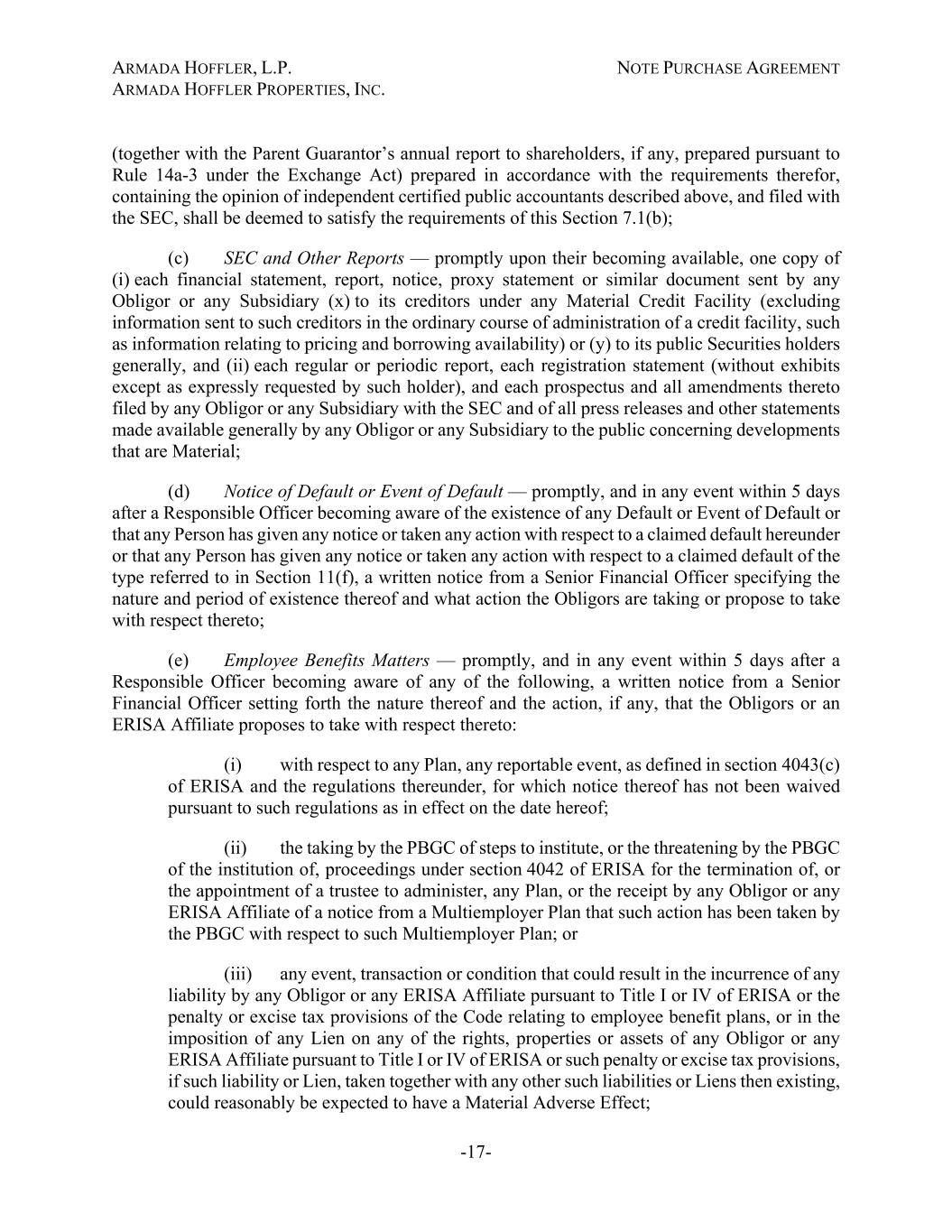ARMADA HOFFLER, L.P. NOTE PURCHASE AGREEMENT ARMADA HOFFLER PROPERTIES, INC. -17- (together with the Parent Guarantor’s annual report to shareholders, if any, prepared pursuant to Rule 14a-3 under the Exchange Act) prepared in accordance with the requirements therefor, containing the opinion of independent certified public accountants described above, and filed with the SEC, shall be deemed to satisfy the requirements of this Section 7.1(b); (c) SEC and Other Reports — promptly upon their becoming available, one copy of (i) each financial statement, report, notice, proxy statement or similar document sent by any Obligor or any Subsidiary (x) to its creditors under any Material Credit Facility (excluding information sent to such creditors in the ordinary course of administration of a credit facility, such as information relating to pricing and borrowing availability) or (y) to its public Securities holders generally, and (ii) each regular or periodic report, each registration statement (without exhibits except as expressly requested by such holder), and each prospectus and all amendments thereto filed by any Obligor or any Subsidiary with the SEC and of all press releases and other statements made available generally by any Obligor or any Subsidiary to the public concerning developments that are Material; (d) Notice of Default or Event of Default — promptly, and in any event within 5 days after a Responsible Officer becoming aware of the existence of any Default or Event of Default or that any Person has given any notice or taken any action with respect to a claimed default hereunder or that any Person has given any notice or taken any action with respect to a claimed default of the type referred to in Section 11(f), a written notice from a Senior Financial Officer specifying the nature and period of existence thereof and what action the Obligors are taking or propose to take with respect thereto; (e) Employee Benefits Matters — promptly, and in any event within 5 days after a Responsible Officer becoming aware of any of the following, a written notice from a Senior Financial Officer setting forth the nature thereof and the action, if any, that the Obligors or an ERISA Affiliate proposes to take with respect thereto: (i) with respect to any Plan, any reportable event, as defined in section 4043(c) of ERISA and the regulations thereunder, for which notice thereof has not been waived pursuant to such regulations as in effect on the date hereof; (ii) the taking by the PBGC of steps to institute, or the threatening by the PBGC of the institution of, proceedings under section 4042 of ERISA for the termination of, or the appointment of a trustee to administer, any Plan, or the receipt by any Obligor or any ERISA Affiliate of a notice from a Multiemployer Plan that such action has been taken by the PBGC with respect to such Multiemployer Plan; or (iii) any event, transaction or condition that could result in the incurrence of any liability by any Obligor or any ERISA Affiliate pursuant to Title I or IV of ERISA or the penalty or excise tax provisions of the Code relating to employee benefit plans, or in the imposition of any Lien on any of the rights, properties or assets of any Obligor or any ERISA Affiliate pursuant to Title I or IV of ERISA or such penalty or excise tax provisions, if such liability or Lien, taken together with any other such liabilities or Liens then existing, could reasonably be expected to have a Material Adverse Effect;