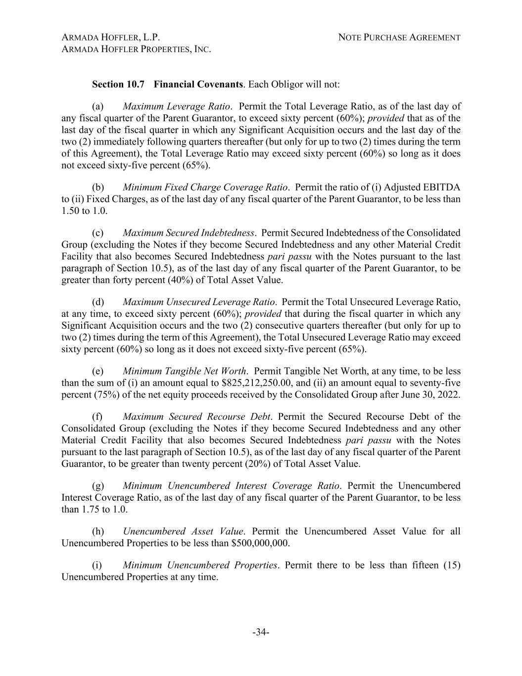 ARMADA HOFFLER, L.P. NOTE PURCHASE AGREEMENT ARMADA HOFFLER PROPERTIES, INC. -34- Section 10.7 Financial Covenants. Each Obligor will not: (a) Maximum Leverage Ratio. Permit the Total Leverage Ratio, as of the last day of any fiscal quarter of the Parent Guarantor, to exceed sixty percent (60%); provided that as of the last day of the fiscal quarter in which any Significant Acquisition occurs and the last day of the two (2) immediately following quarters thereafter (but only for up to two (2) times during the term of this Agreement), the Total Leverage Ratio may exceed sixty percent (60%) so long as it does not exceed sixty‑five percent (65%). (b) Minimum Fixed Charge Coverage Ratio. Permit the ratio of (i) Adjusted EBITDA to (ii) Fixed Charges, as of the last day of any fiscal quarter of the Parent Guarantor, to be less than 1.50 to 1.0. (c) Maximum Secured Indebtedness. Permit Secured Indebtedness of the Consolidated Group (excluding the Notes if they become Secured Indebtedness and any other Material Credit Facility that also becomes Secured Indebtedness pari passu with the Notes pursuant to the last paragraph of Section 10.5), as of the last day of any fiscal quarter of the Parent Guarantor, to be greater than forty percent (40%) of Total Asset Value. (d) Maximum Unsecured Leverage Ratio. Permit the Total Unsecured Leverage Ratio, at any time, to exceed sixty percent (60%); provided that during the fiscal quarter in which any Significant Acquisition occurs and the two (2) consecutive quarters thereafter (but only for up to two (2) times during the term of this Agreement), the Total Unsecured Leverage Ratio may exceed sixty percent (60%) so long as it does not exceed sixty‑five percent (65%). (e) Minimum Tangible Net Worth. Permit Tangible Net Worth, at any time, to be less than the sum of (i) an amount equal to $825,212,250.00, and (ii) an amount equal to seventy‑five percent (75%) of the net equity proceeds received by the Consolidated Group after June 30, 2022. (f) Maximum Secured Recourse Debt. Permit the Secured Recourse Debt of the Consolidated Group (excluding the Notes if they become Secured Indebtedness and any other Material Credit Facility that also becomes Secured Indebtedness pari passu with the Notes pursuant to the last paragraph of Section 10.5), as of the last day of any fiscal quarter of the Parent Guarantor, to be greater than twenty percent (20%) of Total Asset Value. (g) Minimum Unencumbered Interest Coverage Ratio. Permit the Unencumbered Interest Coverage Ratio, as of the last day of any fiscal quarter of the Parent Guarantor, to be less than 1.75 to 1.0. (h) Unencumbered Asset Value. Permit the Unencumbered Asset Value for all Unencumbered Properties to be less than $500,000,000. (i) Minimum Unencumbered Properties. Permit there to be less than fifteen (15) Unencumbered Properties at any time.