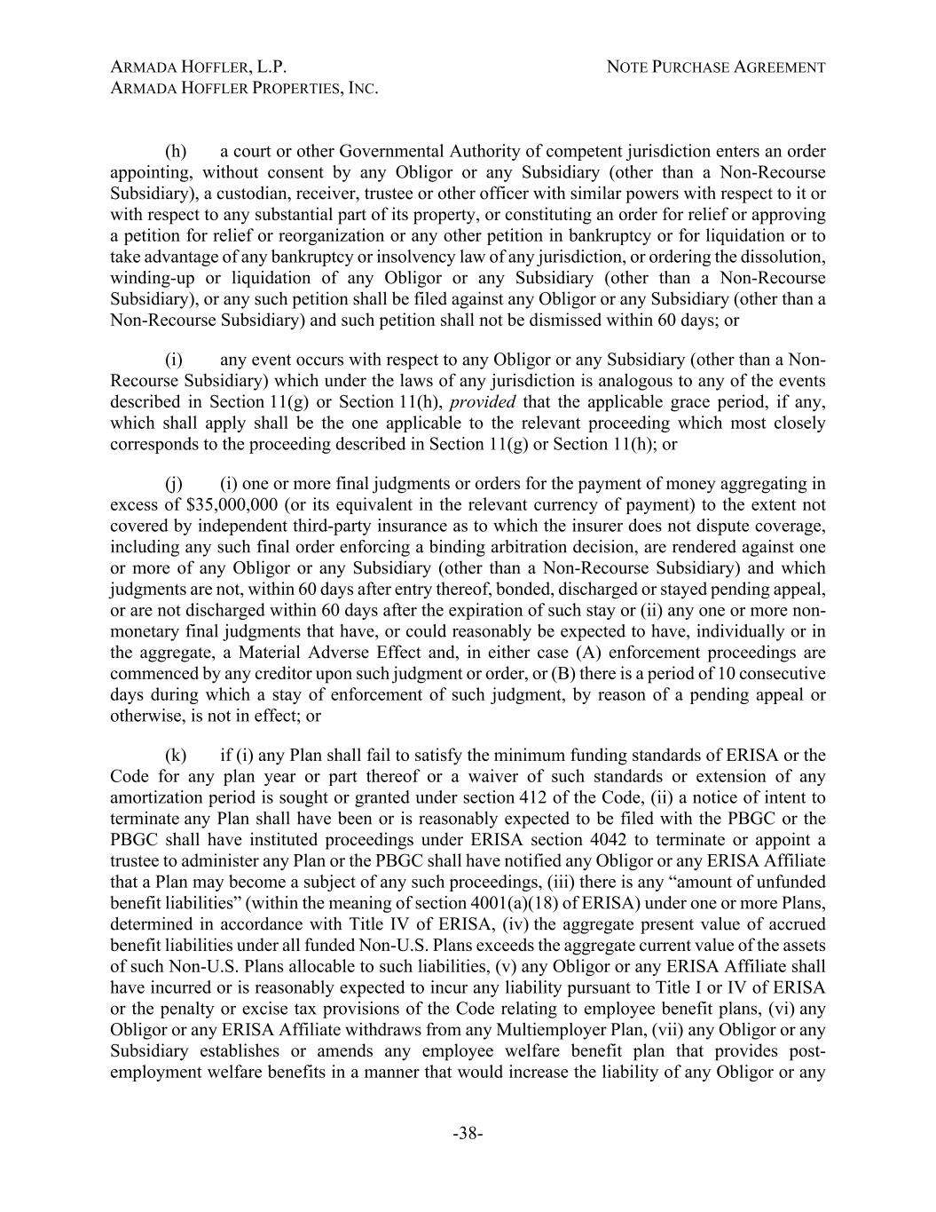 ARMADA HOFFLER, L.P. NOTE PURCHASE AGREEMENT ARMADA HOFFLER PROPERTIES, INC. -38- (h) a court or other Governmental Authority of competent jurisdiction enters an order appointing, without consent by any Obligor or any Subsidiary (other than a Non-Recourse Subsidiary), a custodian, receiver, trustee or other officer with similar powers with respect to it or with respect to any substantial part of its property, or constituting an order for relief or approving a petition for relief or reorganization or any other petition in bankruptcy or for liquidation or to take advantage of any bankruptcy or insolvency law of any jurisdiction, or ordering the dissolution, winding-up or liquidation of any Obligor or any Subsidiary (other than a Non-Recourse Subsidiary), or any such petition shall be filed against any Obligor or any Subsidiary (other than a Non-Recourse Subsidiary) and such petition shall not be dismissed within 60 days; or (i) any event occurs with respect to any Obligor or any Subsidiary (other than a Non- Recourse Subsidiary) which under the laws of any jurisdiction is analogous to any of the events described in Section 11(g) or Section 11(h), provided that the applicable grace period, if any, which shall apply shall be the one applicable to the relevant proceeding which most closely corresponds to the proceeding described in Section 11(g) or Section 11(h); or (j) (i) one or more final judgments or orders for the payment of money aggregating in excess of $35,000,000 (or its equivalent in the relevant currency of payment) to the extent not covered by independent third-party insurance as to which the insurer does not dispute coverage, including any such final order enforcing a binding arbitration decision, are rendered against one or more of any Obligor or any Subsidiary (other than a Non-Recourse Subsidiary) and which judgments are not, within 60 days after entry thereof, bonded, discharged or stayed pending appeal, or are not discharged within 60 days after the expiration of such stay or (ii) any one or more non- monetary final judgments that have, or could reasonably be expected to have, individually or in the aggregate, a Material Adverse Effect and, in either case (A) enforcement proceedings are commenced by any creditor upon such judgment or order, or (B) there is a period of 10 consecutive days during which a stay of enforcement of such judgment, by reason of a pending appeal or otherwise, is not in effect; or (k) if (i) any Plan shall fail to satisfy the minimum funding standards of ERISA or the Code for any plan year or part thereof or a waiver of such standards or extension of any amortization period is sought or granted under section 412 of the Code, (ii) a notice of intent to terminate any Plan shall have been or is reasonably expected to be filed with the PBGC or the PBGC shall have instituted proceedings under ERISA section 4042 to terminate or appoint a trustee to administer any Plan or the PBGC shall have notified any Obligor or any ERISA Affiliate that a Plan may become a subject of any such proceedings, (iii) there is any “amount of unfunded benefit liabilities” (within the meaning of section 4001(a)(18) of ERISA) under one or more Plans, determined in accordance with Title IV of ERISA, (iv) the aggregate present value of accrued benefit liabilities under all funded Non-U.S. Plans exceeds the aggregate current value of the assets of such Non-U.S. Plans allocable to such liabilities, (v) any Obligor or any ERISA Affiliate shall have incurred or is reasonably expected to incur any liability pursuant to Title I or IV of ERISA or the penalty or excise tax provisions of the Code relating to employee benefit plans, (vi) any Obligor or any ERISA Affiliate withdraws from any Multiemployer Plan, (vii) any Obligor or any Subsidiary establishes or amends any employee welfare benefit plan that provides post- employment welfare benefits in a manner that would increase the liability of any Obligor or any