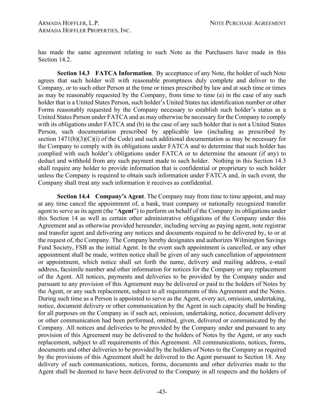 ARMADA HOFFLER, L.P. NOTE PURCHASE AGREEMENT ARMADA HOFFLER PROPERTIES, INC. -43- has made the same agreement relating to such Note as the Purchasers have made in this Section 14.2. Section 14.3 FATCA Information. By acceptance of any Note, the holder of such Note agrees that such holder will with reasonable promptness duly complete and deliver to the Company, or to such other Person at the time or times prescribed by law and at such time or times as may be reasonably requested by the Company, from time to time (a) in the case of any such holder that is a United States Person, such holder’s United States tax identification number or other Forms reasonably requested by the Company necessary to establish such holder’s status as a United States Person under FATCA and as may otherwise be necessary for the Company to comply with its obligations under FATCA and (b) in the case of any such holder that is not a United States Person, such documentation prescribed by applicable law (including as prescribed by section 1471(b)(3)(C)(i) of the Code) and such additional documentation as may be necessary for the Company to comply with its obligations under FATCA and to determine that such holder has complied with such holder’s obligations under FATCA or to determine the amount (if any) to deduct and withhold from any such payment made to such holder. Nothing in this Section 14.3 shall require any holder to provide information that is confidential or proprietary to such holder unless the Company is required to obtain such information under FATCA and, in such event, the Company shall treat any such information it receives as confidential. Section 14.4 Company’s Agent. The Company may from time to time appoint, and may at any time cancel the appointment of, a bank, trust company or nationally recognized transfer agent to serve as its agent (the “Agent”) to perform on behalf of the Company its obligations under this Section 14 as well as certain other administrative obligations of the Company under this Agreement and as otherwise provided hereunder, including serving as paying agent, note registrar and transfer agent and delivering any notices and documents required to be delivered by, to or at the request of, the Company. The Company hereby designates and authorizes Wilmington Savings Fund Society, FSB as the initial Agent. In the event such appointment is cancelled, or any other appointment shall be made, written notice shall be given of any such cancellation of appointment or appointment, which notice shall set forth the name, delivery and mailing address, e-mail address, facsimile number and other information for notices for the Company or any replacement of the Agent. All notices, payments and deliveries to be provided by the Company under and pursuant to any provision of this Agreement may be delivered or paid to the holders of Notes by the Agent, or any such replacement, subject to all requirements of this Agreement and the Notes. During such time as a Person is appointed to serve as the Agent, every act, omission, undertaking, notice, document delivery or other communication by the Agent in such capacity shall be binding for all purposes on the Company as if such act, omission, undertaking, notice, document delivery or other communication had been performed, omitted, given, delivered or communicated by the Company. All notices and deliveries to be provided by the Company under and pursuant to any provision of this Agreement may be delivered to the holders of Notes by the Agent, or any such replacement, subject to all requirements of this Agreement. All communications, notices, forms, documents and other deliveries to be provided by the holders of Notes to the Company as required by the provisions of this Agreement shall be delivered to the Agent pursuant to Section 18. Any delivery of such communications, notices, forms, documents and other deliveries made to the Agent shall be deemed to have been delivered to the Company in all respects and the holders of