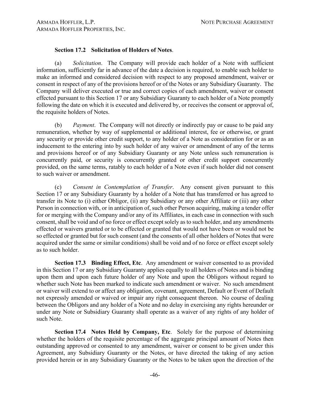ARMADA HOFFLER, L.P. NOTE PURCHASE AGREEMENT ARMADA HOFFLER PROPERTIES, INC. -46- Section 17.2 Solicitation of Holders of Notes. (a) Solicitation. The Company will provide each holder of a Note with sufficient information, sufficiently far in advance of the date a decision is required, to enable such holder to make an informed and considered decision with respect to any proposed amendment, waiver or consent in respect of any of the provisions hereof or of the Notes or any Subsidiary Guaranty. The Company will deliver executed or true and correct copies of each amendment, waiver or consent effected pursuant to this Section 17 or any Subsidiary Guaranty to each holder of a Note promptly following the date on which it is executed and delivered by, or receives the consent or approval of, the requisite holders of Notes. (b) Payment. The Company will not directly or indirectly pay or cause to be paid any remuneration, whether by way of supplemental or additional interest, fee or otherwise, or grant any security or provide other credit support, to any holder of a Note as consideration for or as an inducement to the entering into by such holder of any waiver or amendment of any of the terms and provisions hereof or of any Subsidiary Guaranty or any Note unless such remuneration is concurrently paid, or security is concurrently granted or other credit support concurrently provided, on the same terms, ratably to each holder of a Note even if such holder did not consent to such waiver or amendment. (c) Consent in Contemplation of Transfer. Any consent given pursuant to this Section 17 or any Subsidiary Guaranty by a holder of a Note that has transferred or has agreed to transfer its Note to (i) either Obligor, (ii) any Subsidiary or any other Affiliate or (iii) any other Person in connection with, or in anticipation of, such other Person acquiring, making a tender offer for or merging with the Company and/or any of its Affiliates, in each case in connection with such consent, shall be void and of no force or effect except solely as to such holder, and any amendments effected or waivers granted or to be effected or granted that would not have been or would not be so effected or granted but for such consent (and the consents of all other holders of Notes that were acquired under the same or similar conditions) shall be void and of no force or effect except solely as to such holder. Section 17.3 Binding Effect, Etc. Any amendment or waiver consented to as provided in this Section 17 or any Subsidiary Guaranty applies equally to all holders of Notes and is binding upon them and upon each future holder of any Note and upon the Obligors without regard to whether such Note has been marked to indicate such amendment or waiver. No such amendment or waiver will extend to or affect any obligation, covenant, agreement, Default or Event of Default not expressly amended or waived or impair any right consequent thereon. No course of dealing between the Obligors and any holder of a Note and no delay in exercising any rights hereunder or under any Note or Subsidiary Guaranty shall operate as a waiver of any rights of any holder of such Note. Section 17.4 Notes Held by Company, Etc. Solely for the purpose of determining whether the holders of the requisite percentage of the aggregate principal amount of Notes then outstanding approved or consented to any amendment, waiver or consent to be given under this Agreement, any Subsidiary Guaranty or the Notes, or have directed the taking of any action provided herein or in any Subsidiary Guaranty or the Notes to be taken upon the direction of the