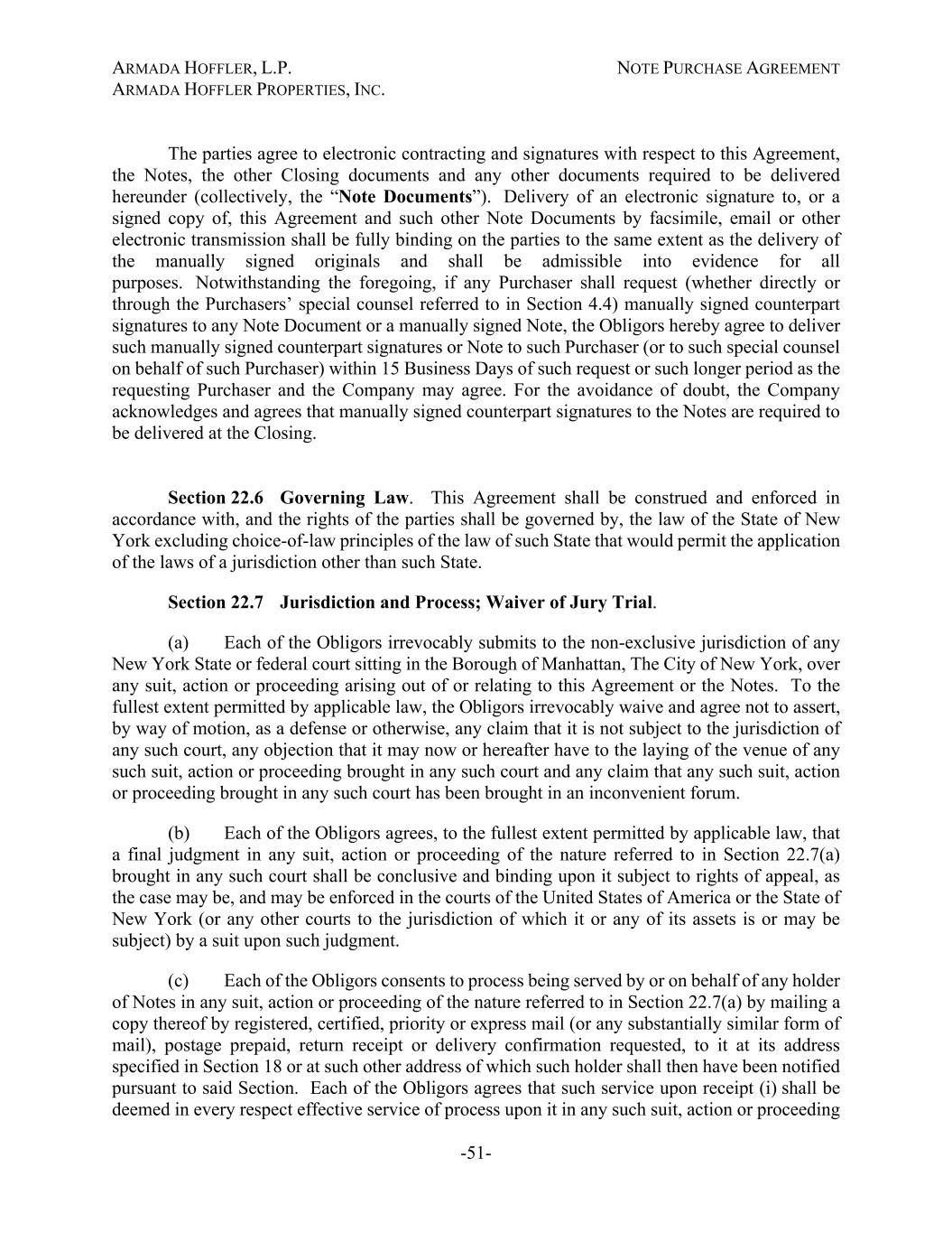 ARMADA HOFFLER, L.P. NOTE PURCHASE AGREEMENT ARMADA HOFFLER PROPERTIES, INC. -51- The parties agree to electronic contracting and signatures with respect to this Agreement, the Notes, the other Closing documents and any other documents required to be delivered hereunder (collectively, the “Note Documents”). Delivery of an electronic signature to, or a signed copy of, this Agreement and such other Note Documents by facsimile, email or other electronic transmission shall be fully binding on the parties to the same extent as the delivery of the manually signed originals and shall be admissible into evidence for all purposes. Notwithstanding the foregoing, if any Purchaser shall request (whether directly or through the Purchasers’ special counsel referred to in Section 4.4) manually signed counterpart signatures to any Note Document or a manually signed Note, the Obligors hereby agree to deliver such manually signed counterpart signatures or Note to such Purchaser (or to such special counsel on behalf of such Purchaser) within 15 Business Days of such request or such longer period as the requesting Purchaser and the Company may agree. For the avoidance of doubt, the Company acknowledges and agrees that manually signed counterpart signatures to the Notes are required to be delivered at the Closing. Section 22.6 Governing Law. This Agreement shall be construed and enforced in accordance with, and the rights of the parties shall be governed by, the law of the State of New York excluding choice-of-law principles of the law of such State that would permit the application of the laws of a jurisdiction other than such State. Section 22.7 Jurisdiction and Process; Waiver of Jury Trial. (a) Each of the Obligors irrevocably submits to the non-exclusive jurisdiction of any New York State or federal court sitting in the Borough of Manhattan, The City of New York, over any suit, action or proceeding arising out of or relating to this Agreement or the Notes. To the fullest extent permitted by applicable law, the Obligors irrevocably waive and agree not to assert, by way of motion, as a defense or otherwise, any claim that it is not subject to the jurisdiction of any such court, any objection that it may now or hereafter have to the laying of the venue of any such suit, action or proceeding brought in any such court and any claim that any such suit, action or proceeding brought in any such court has been brought in an inconvenient forum. (b) Each of the Obligors agrees, to the fullest extent permitted by applicable law, that a final judgment in any suit, action or proceeding of the nature referred to in Section 22.7(a) brought in any such court shall be conclusive and binding upon it subject to rights of appeal, as the case may be, and may be enforced in the courts of the United States of America or the State of New York (or any other courts to the jurisdiction of which it or any of its assets is or may be subject) by a suit upon such judgment. (c) Each of the Obligors consents to process being served by or on behalf of any holder of Notes in any suit, action or proceeding of the nature referred to in Section 22.7(a) by mailing a copy thereof by registered, certified, priority or express mail (or any substantially similar form of mail), postage prepaid, return receipt or delivery confirmation requested, to it at its address specified in Section 18 or at such other address of which such holder shall then have been notified pursuant to said Section. Each of the Obligors agrees that such service upon receipt (i) shall be deemed in every respect effective service of process upon it in any such suit, action or proceeding