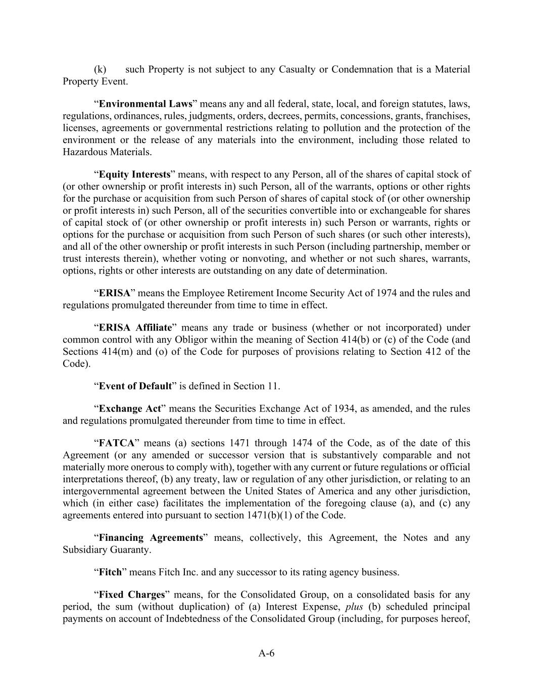 A-6 (k) such Property is not subject to any Casualty or Condemnation that is a Material Property Event. “Environmental Laws” means any and all federal, state, local, and foreign statutes, laws, regulations, ordinances, rules, judgments, orders, decrees, permits, concessions, grants, franchises, licenses, agreements or governmental restrictions relating to pollution and the protection of the environment or the release of any materials into the environment, including those related to Hazardous Materials. “Equity Interests” means, with respect to any Person, all of the shares of capital stock of (or other ownership or profit interests in) such Person, all of the warrants, options or other rights for the purchase or acquisition from such Person of shares of capital stock of (or other ownership or profit interests in) such Person, all of the securities convertible into or exchangeable for shares of capital stock of (or other ownership or profit interests in) such Person or warrants, rights or options for the purchase or acquisition from such Person of such shares (or such other interests), and all of the other ownership or profit interests in such Person (including partnership, member or trust interests therein), whether voting or nonvoting, and whether or not such shares, warrants, options, rights or other interests are outstanding on any date of determination. “ERISA” means the Employee Retirement Income Security Act of 1974 and the rules and regulations promulgated thereunder from time to time in effect. “ERISA Affiliate” means any trade or business (whether or not incorporated) under common control with any Obligor within the meaning of Section 414(b) or (c) of the Code (and Sections 414(m) and (o) of the Code for purposes of provisions relating to Section 412 of the Code). “Event of Default” is defined in Section 11. “Exchange Act” means the Securities Exchange Act of 1934, as amended, and the rules and regulations promulgated thereunder from time to time in effect. “FATCA” means (a) sections 1471 through 1474 of the Code, as of the date of this Agreement (or any amended or successor version that is substantively comparable and not materially more onerous to comply with), together with any current or future regulations or official interpretations thereof, (b) any treaty, law or regulation of any other jurisdiction, or relating to an intergovernmental agreement between the United States of America and any other jurisdiction, which (in either case) facilitates the implementation of the foregoing clause (a), and (c) any agreements entered into pursuant to section 1471(b)(1) of the Code. “Financing Agreements” means, collectively, this Agreement, the Notes and any Subsidiary Guaranty. “Fitch” means Fitch Inc. and any successor to its rating agency business. “Fixed Charges” means, for the Consolidated Group, on a consolidated basis for any period, the sum (without duplication) of (a) Interest Expense, plus (b) scheduled principal payments on account of Indebtedness of the Consolidated Group (including, for purposes hereof,