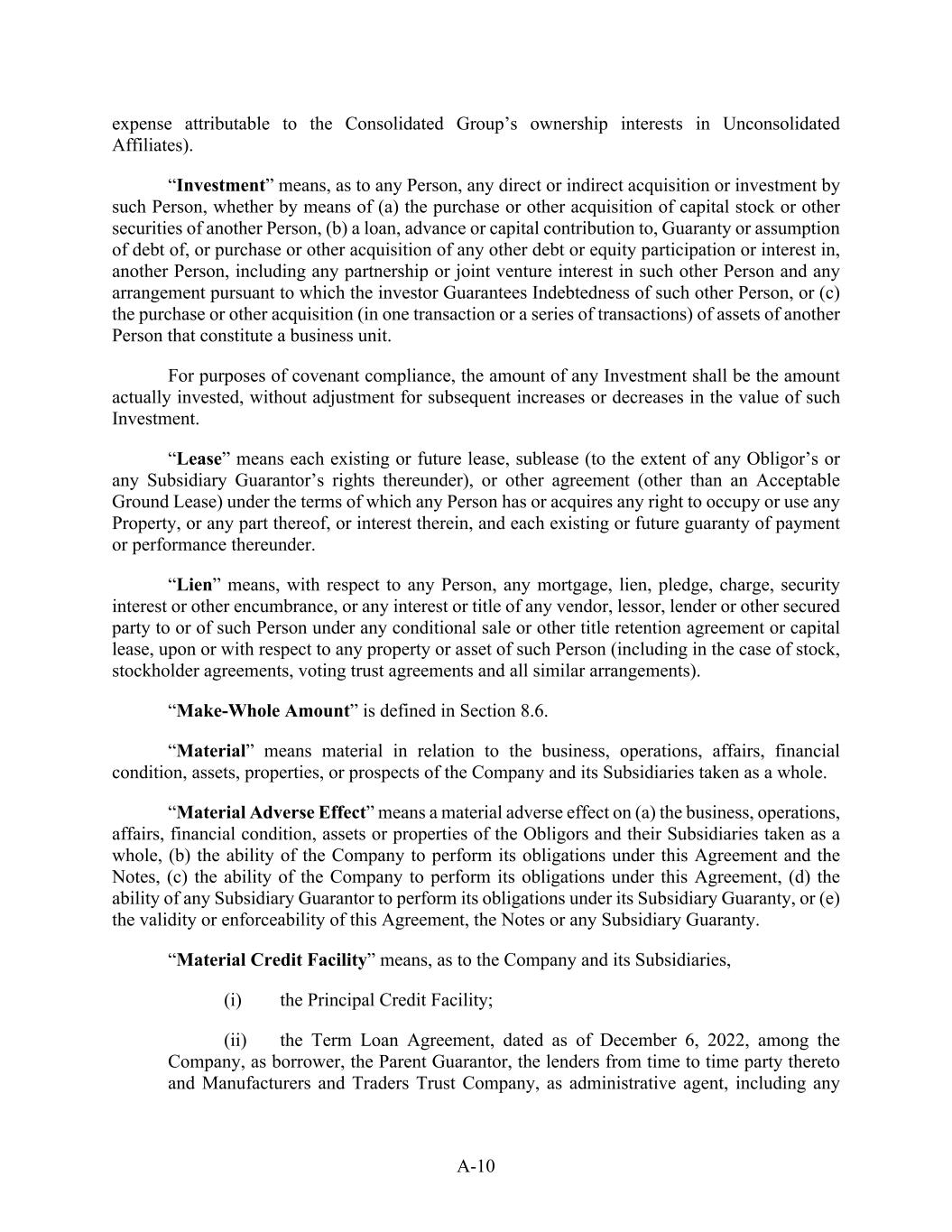 A-10 expense attributable to the Consolidated Group’s ownership interests in Unconsolidated Affiliates). “Investment” means, as to any Person, any direct or indirect acquisition or investment by such Person, whether by means of (a) the purchase or other acquisition of capital stock or other securities of another Person, (b) a loan, advance or capital contribution to, Guaranty or assumption of debt of, or purchase or other acquisition of any other debt or equity participation or interest in, another Person, including any partnership or joint venture interest in such other Person and any arrangement pursuant to which the investor Guarantees Indebtedness of such other Person, or (c) the purchase or other acquisition (in one transaction or a series of transactions) of assets of another Person that constitute a business unit. For purposes of covenant compliance, the amount of any Investment shall be the amount actually invested, without adjustment for subsequent increases or decreases in the value of such Investment. “Lease” means each existing or future lease, sublease (to the extent of any Obligor’s or any Subsidiary Guarantor’s rights thereunder), or other agreement (other than an Acceptable Ground Lease) under the terms of which any Person has or acquires any right to occupy or use any Property, or any part thereof, or interest therein, and each existing or future guaranty of payment or performance thereunder. “Lien” means, with respect to any Person, any mortgage, lien, pledge, charge, security interest or other encumbrance, or any interest or title of any vendor, lessor, lender or other secured party to or of such Person under any conditional sale or other title retention agreement or capital lease, upon or with respect to any property or asset of such Person (including in the case of stock, stockholder agreements, voting trust agreements and all similar arrangements). “Make-Whole Amount” is defined in Section 8.6. “Material” means material in relation to the business, operations, affairs, financial condition, assets, properties, or prospects of the Company and its Subsidiaries taken as a whole. “Material Adverse Effect” means a material adverse effect on (a) the business, operations, affairs, financial condition, assets or properties of the Obligors and their Subsidiaries taken as a whole, (b) the ability of the Company to perform its obligations under this Agreement and the Notes, (c) the ability of the Company to perform its obligations under this Agreement, (d) the ability of any Subsidiary Guarantor to perform its obligations under its Subsidiary Guaranty, or (e) the validity or enforceability of this Agreement, the Notes or any Subsidiary Guaranty. “Material Credit Facility” means, as to the Company and its Subsidiaries, (i) the Principal Credit Facility; (ii) the Term Loan Agreement, dated as of December 6, 2022, among the Company, as borrower, the Parent Guarantor, the lenders from time to time party thereto and Manufacturers and Traders Trust Company, as administrative agent, including any