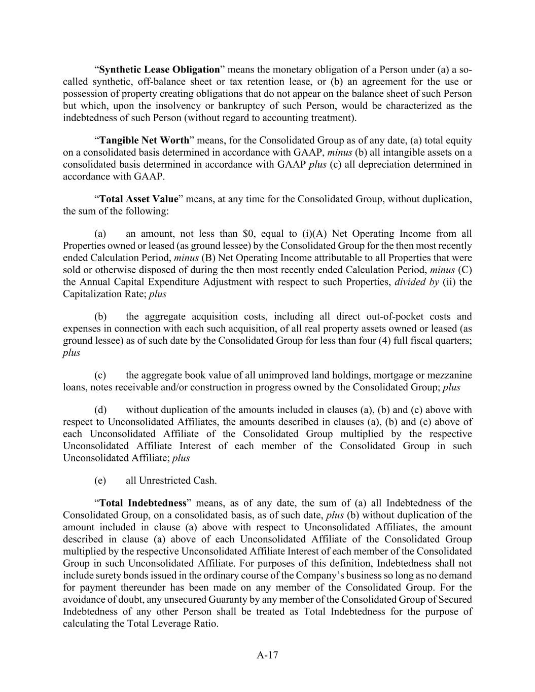 A-17 “Synthetic Lease Obligation” means the monetary obligation of a Person under (a) a so- called synthetic, off-balance sheet or tax retention lease, or (b) an agreement for the use or possession of property creating obligations that do not appear on the balance sheet of such Person but which, upon the insolvency or bankruptcy of such Person, would be characterized as the indebtedness of such Person (without regard to accounting treatment). “Tangible Net Worth” means, for the Consolidated Group as of any date, (a) total equity on a consolidated basis determined in accordance with GAAP, minus (b) all intangible assets on a consolidated basis determined in accordance with GAAP plus (c) all depreciation determined in accordance with GAAP. “Total Asset Value” means, at any time for the Consolidated Group, without duplication, the sum of the following: (a) an amount, not less than $0, equal to (i)(A) Net Operating Income from all Properties owned or leased (as ground lessee) by the Consolidated Group for the then most recently ended Calculation Period, minus (B) Net Operating Income attributable to all Properties that were sold or otherwise disposed of during the then most recently ended Calculation Period, minus (C) the Annual Capital Expenditure Adjustment with respect to such Properties, divided by (ii) the Capitalization Rate; plus (b) the aggregate acquisition costs, including all direct out-of-pocket costs and expenses in connection with each such acquisition, of all real property assets owned or leased (as ground lessee) as of such date by the Consolidated Group for less than four (4) full fiscal quarters; plus (c) the aggregate book value of all unimproved land holdings, mortgage or mezzanine loans, notes receivable and/or construction in progress owned by the Consolidated Group; plus (d) without duplication of the amounts included in clauses (a), (b) and (c) above with respect to Unconsolidated Affiliates, the amounts described in clauses (a), (b) and (c) above of each Unconsolidated Affiliate of the Consolidated Group multiplied by the respective Unconsolidated Affiliate Interest of each member of the Consolidated Group in such Unconsolidated Affiliate; plus (e) all Unrestricted Cash. “Total Indebtedness” means, as of any date, the sum of (a) all Indebtedness of the Consolidated Group, on a consolidated basis, as of such date, plus (b) without duplication of the amount included in clause (a) above with respect to Unconsolidated Affiliates, the amount described in clause (a) above of each Unconsolidated Affiliate of the Consolidated Group multiplied by the respective Unconsolidated Affiliate Interest of each member of the Consolidated Group in such Unconsolidated Affiliate. For purposes of this definition, Indebtedness shall not include surety bonds issued in the ordinary course of the Company’s business so long as no demand for payment thereunder has been made on any member of the Consolidated Group. For the avoidance of doubt, any unsecured Guaranty by any member of the Consolidated Group of Secured Indebtedness of any other Person shall be treated as Total Indebtedness for the purpose of calculating the Total Leverage Ratio.