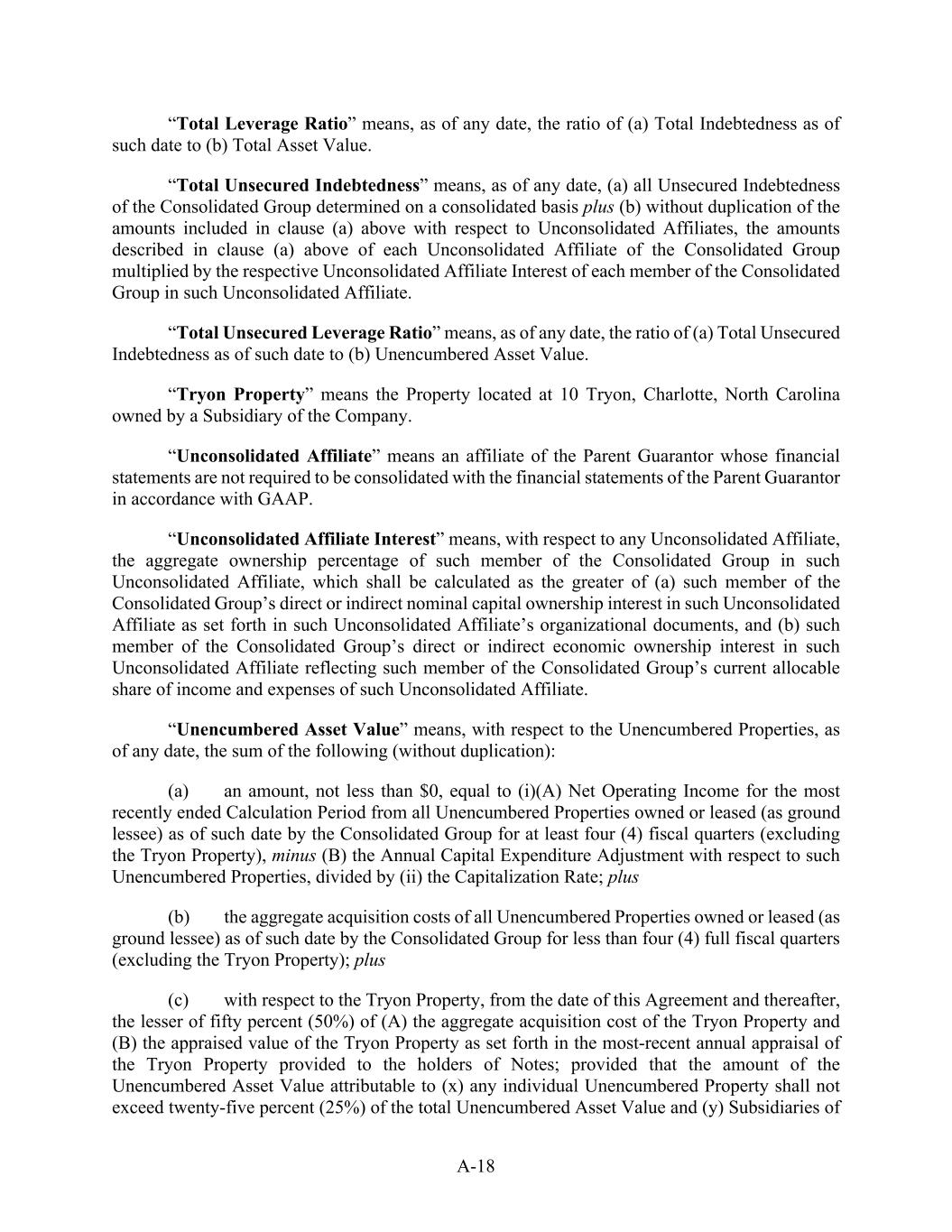 A-18 “Total Leverage Ratio” means, as of any date, the ratio of (a) Total Indebtedness as of such date to (b) Total Asset Value. “Total Unsecured Indebtedness” means, as of any date, (a) all Unsecured Indebtedness of the Consolidated Group determined on a consolidated basis plus (b) without duplication of the amounts included in clause (a) above with respect to Unconsolidated Affiliates, the amounts described in clause (a) above of each Unconsolidated Affiliate of the Consolidated Group multiplied by the respective Unconsolidated Affiliate Interest of each member of the Consolidated Group in such Unconsolidated Affiliate. “Total Unsecured Leverage Ratio” means, as of any date, the ratio of (a) Total Unsecured Indebtedness as of such date to (b) Unencumbered Asset Value. “Tryon Property” means the Property located at 10 Tryon, Charlotte, North Carolina owned by a Subsidiary of the Company. “Unconsolidated Affiliate” means an affiliate of the Parent Guarantor whose financial statements are not required to be consolidated with the financial statements of the Parent Guarantor in accordance with GAAP. “Unconsolidated Affiliate Interest” means, with respect to any Unconsolidated Affiliate, the aggregate ownership percentage of such member of the Consolidated Group in such Unconsolidated Affiliate, which shall be calculated as the greater of (a) such member of the Consolidated Group’s direct or indirect nominal capital ownership interest in such Unconsolidated Affiliate as set forth in such Unconsolidated Affiliate’s organizational documents, and (b) such member of the Consolidated Group’s direct or indirect economic ownership interest in such Unconsolidated Affiliate reflecting such member of the Consolidated Group’s current allocable share of income and expenses of such Unconsolidated Affiliate. “Unencumbered Asset Value” means, with respect to the Unencumbered Properties, as of any date, the sum of the following (without duplication): (a) an amount, not less than $0, equal to (i)(A) Net Operating Income for the most recently ended Calculation Period from all Unencumbered Properties owned or leased (as ground lessee) as of such date by the Consolidated Group for at least four (4) fiscal quarters (excluding the Tryon Property), minus (B) the Annual Capital Expenditure Adjustment with respect to such Unencumbered Properties, divided by (ii) the Capitalization Rate; plus (b) the aggregate acquisition costs of all Unencumbered Properties owned or leased (as ground lessee) as of such date by the Consolidated Group for less than four (4) full fiscal quarters (excluding the Tryon Property); plus (c) with respect to the Tryon Property, from the date of this Agreement and thereafter, the lesser of fifty percent (50%) of (A) the aggregate acquisition cost of the Tryon Property and (B) the appraised value of the Tryon Property as set forth in the most-recent annual appraisal of the Tryon Property provided to the holders of Notes; provided that the amount of the Unencumbered Asset Value attributable to (x) any individual Unencumbered Property shall not exceed twenty-five percent (25%) of the total Unencumbered Asset Value and (y) Subsidiaries of