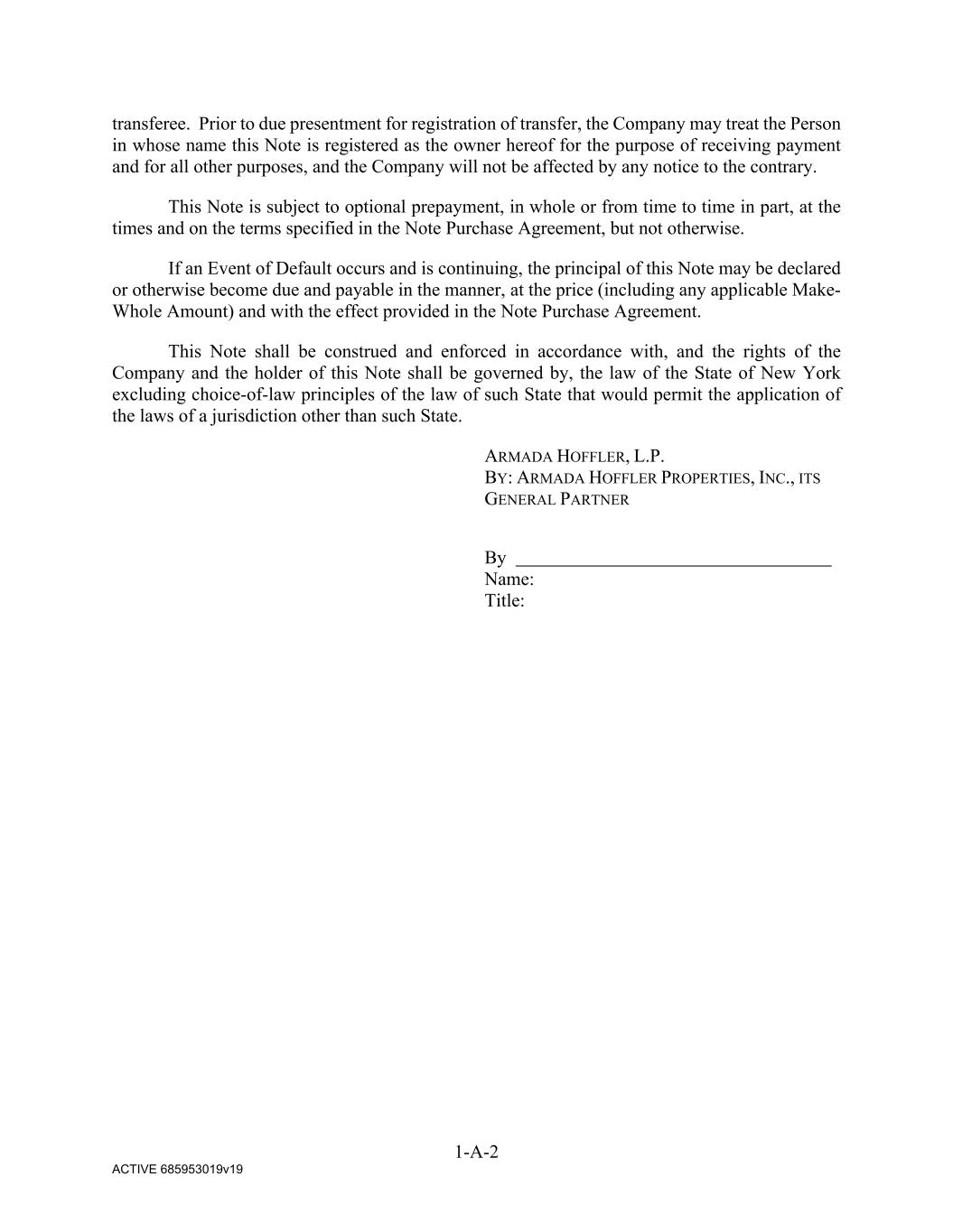 1-C-2 transferee. Prior to due presentment for registration of transfer, the Company may treat the Person in whose name this Note is registered as the owner hereof for the purpose of receiving payment and for all other purposes, and the Company will not be affected by any notice to the contrary. This Note is subject to optional prepayment, in whole or from time to time in part, at the times and on the terms specified in the Note Purchase Agreement, but not otherwise. If an Event of Default occurs and is continuing, the principal of this Note may be declared or otherwise become due and payable in the manner, at the price (including any applicable Make- Whole Amount) and with the effect provided in the Note Purchase Agreement. This Note shall be construed and enforced in accordance with, and the rights of the Company and the holder of this Note shall be governed by, the law of the State of New York excluding choice-of-law principles of the law of such State that would permit the application of the laws of a jurisdiction other than such State. ARMADA HOFFLER, L.P. BY: ARMADA HOFFLER PROPERTIES, INC., ITS GENERAL PARTNER By Name: Title: