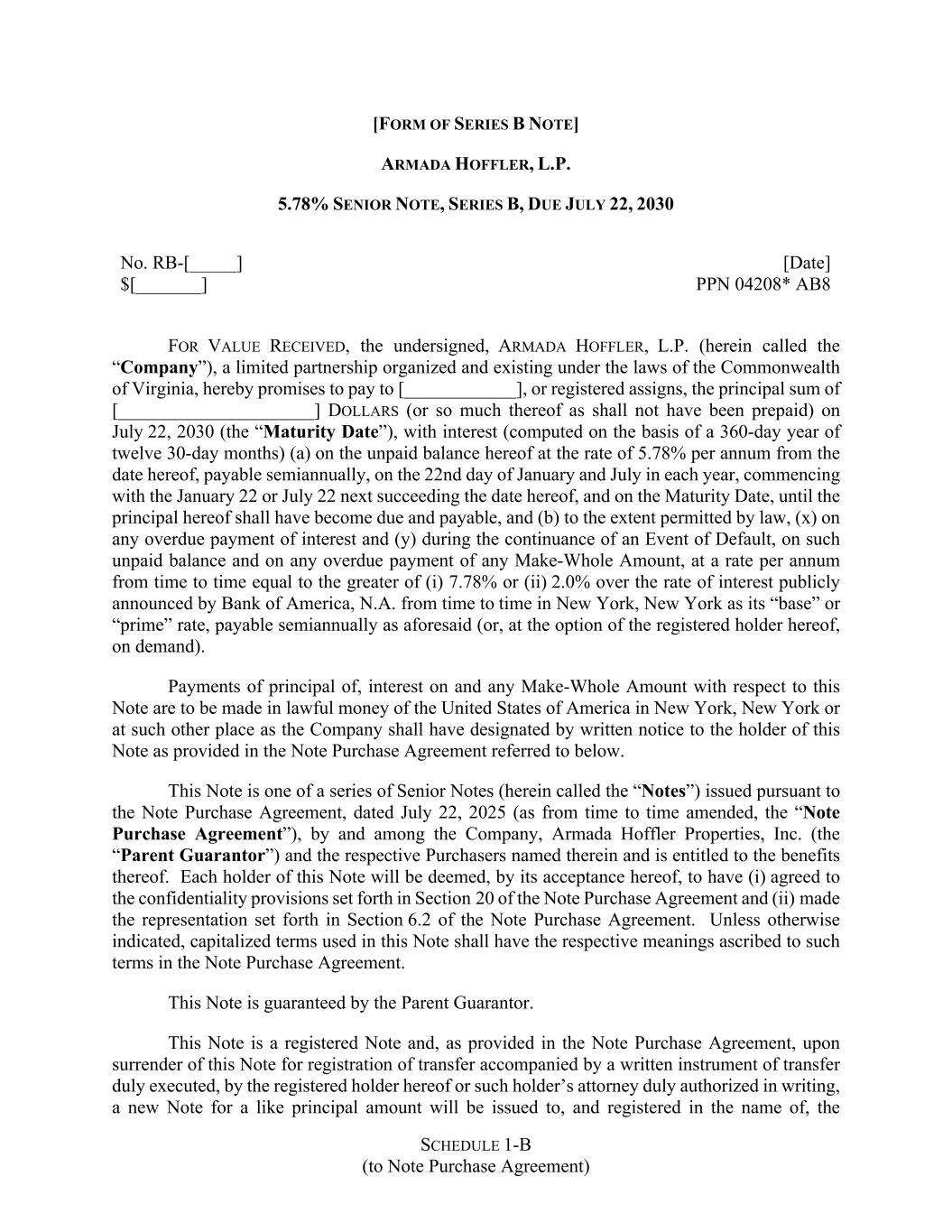SCHEDULE 1-B (to Note Purchase Agreement) [FORM OF SERIES B NOTE] ARMADA HOFFLER, L.P. 5.78% SENIOR NOTE, SERIES B, DUE JULY 22, 2030 No. RB-[_____] [Date] $[_______] PPN 04208* AB8 FOR VALUE RECEIVED, the undersigned, ARMADA HOFFLER, L.P. (herein called the “Company”), a limited partnership organized and existing under the laws of the Commonwealth of Virginia, hereby promises to pay to [____________], or registered assigns, the principal sum of [_____________________] DOLLARS (or so much thereof as shall not have been prepaid) on July 22, 2030 (the “Maturity Date”), with interest (computed on the basis of a 360-day year of twelve 30-day months) (a) on the unpaid balance hereof at the rate of 5.78% per annum from the date hereof, payable semiannually, on the 22nd day of January and July in each year, commencing with the January 22 or July 22 next succeeding the date hereof, and on the Maturity Date, until the principal hereof shall have become due and payable, and (b) to the extent permitted by law, (x) on any overdue payment of interest and (y) during the continuance of an Event of Default, on such unpaid balance and on any overdue payment of any Make-Whole Amount, at a rate per annum from time to time equal to the greater of (i) 7.78% or (ii) 2.0% over the rate of interest publicly announced by Bank of America, N.A. from time to time in New York, New York as its “base” or “prime” rate, payable semiannually as aforesaid (or, at the option of the registered holder hereof, on demand). Payments of principal of, interest on and any Make-Whole Amount with respect to this Note are to be made in lawful money of the United States of America in New York, New York or at such other place as the Company shall have designated by written notice to the holder of this Note as provided in the Note Purchase Agreement referred to below. This Note is one of a series of Senior Notes (herein called the “Notes”) issued pursuant to the Note Purchase Agreement, dated July 22, 2025 (as from time to time amended, the “Note Purchase Agreement”), by and among the Company, Armada Hoffler Properties, Inc. (the “Parent Guarantor”) and the respective Purchasers named therein and is entitled to the benefits thereof. Each holder of this Note will be deemed, by its acceptance hereof, to have (i) agreed to the confidentiality provisions set forth in Section 20 of the Note Purchase Agreement and (ii) made the representation set forth in Section 6.2 of the Note Purchase Agreement. Unless otherwise indicated, capitalized terms used in this Note shall have the respective meanings ascribed to such terms in the Note Purchase Agreement. This Note is guaranteed by the Parent Guarantor. This Note is a registered Note and, as provided in the Note Purchase Agreement, upon surrender of this Note for registration of transfer accompanied by a written instrument of transfer duly executed, by the registered holder hereof or such holder’s attorney duly authorized in writing, a new Note for a like principal amount will be issued to, and registered in the name of, the