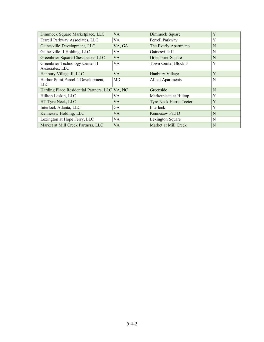5.4-2 Dimmock Square Marketplace, LLC VA Dimmock Square Y Ferrell Parkway Associates, LLC VA Ferrell Parkway Y Gainesville Development, LLC VA, GA The Everly Apartments N Gainesville II Holding, LLC VA Gainesville II N Greenbrier Square Chesapeake, LLC VA Greenbrier Square N Greenbrier Technology Center II Associates, LLC VA Town Center Block 3 Y Hanbury Village II, LLC VA Hanbury Village Y Harbor Point Parcel 4 Development, LLC MD Allied Apartments N Harding Place Residential Partners, LLC VA, NC Greenside N Hilltop Laskin, LLC VA Marketplace at Hilltop Y HT Tyre Neck, LLC VA Tyre Neck Harris Teeter Y Interlock Atlanta, LLC GA Interlock Y Kennesaw Holding, LLC VA Kennesaw Pad D N Lexington at Hope Ferry, LLC VA Lexington Square N Market at Mill Creek Partners, LLC VA Market at Mill Creek N
