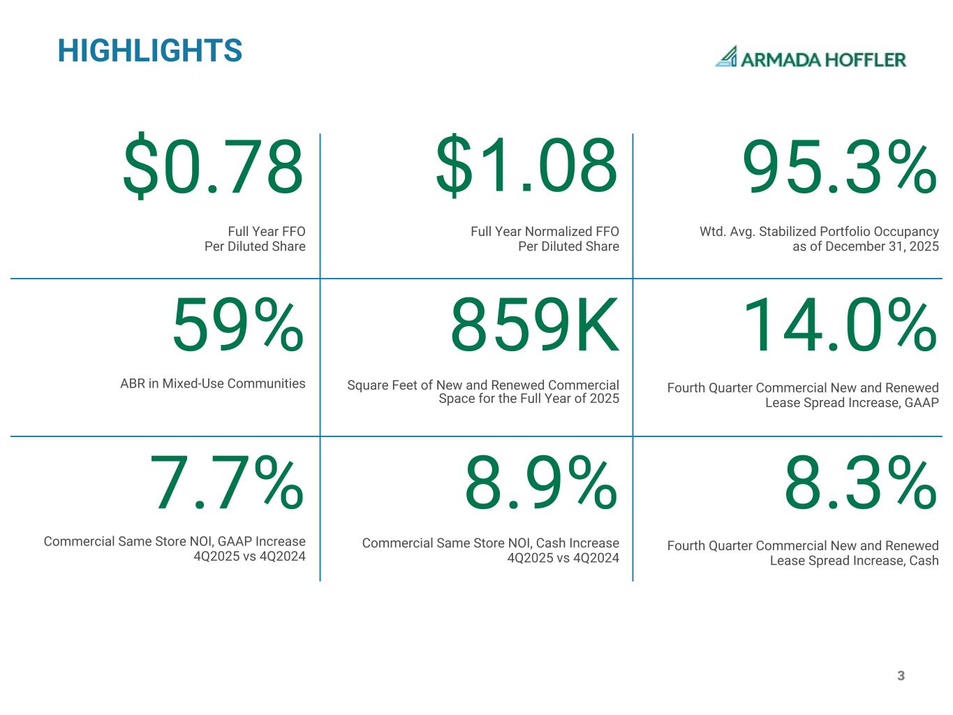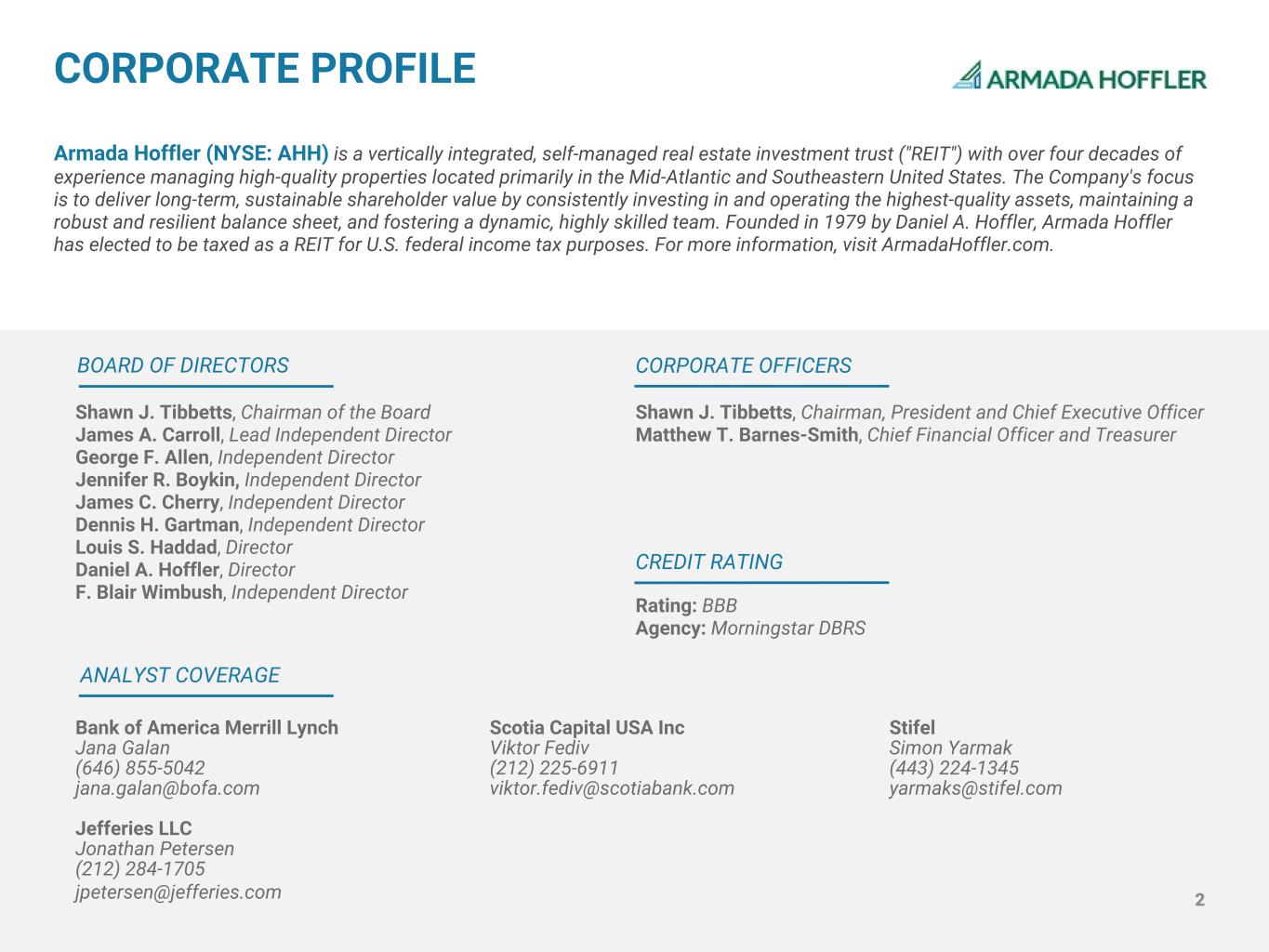 2 BOARD OF DIRECTORS Shawn J. Tibbetts, Chairman of the Board James A. Carroll, Lead Independent Director George F. Allen, Independent Director Jennifer R. Boykin, Independent Director James C. Cherry, Independent Director Dennis H. Gartman, Independent Director Louis S. Haddad, Director Daniel A. Hoffler, Director F. Blair Wimbush, Independent Director CORPORATE OFFICERS Shawn J. Tibbetts, Chairman, President and Chief Executive Officer Matthew T. Barnes-Smith, Chief Financial Officer and Treasurer Scotia Capital USA Inc Viktor Fediv (212) 225-6911 viktor.fediv@scotiabank.com Bank of America Merrill Lynch Jana Galan (646) 855-5042 jana.galan@bofa.com Jefferies LLC Jonathan Petersen (212) 284-1705 jpetersen@jefferies.com ANALYST COVERAGE Armada Hoffler (NYSE: AHH) is a vertically integrated, self-managed real estate investment trust ("REIT") with over four decades of experience managing high-quality properties located primarily in the Mid-Atlantic and Southeastern United States. The Company's focus is to deliver long-term, sustainable shareholder value by consistently investing in and operating the highest-quality assets, maintaining a robust and resilient balance sheet, and fostering a dynamic, highly skilled team. Founded in 1979 by Daniel A. Hoffler, Armada Hoffler has elected to be taxed as a REIT for U.S. federal income tax purposes. For more information, visit ArmadaHoffler.com. CORPORATE PROFILE CREDIT RATING Rating: BBB Agency: Morningstar DBRS Stifel Simon Yarmak (443) 224-1345 yarmaks@stifel.com