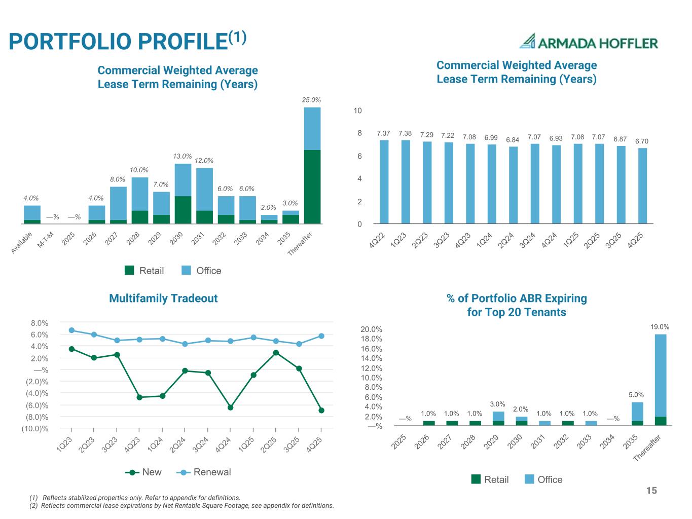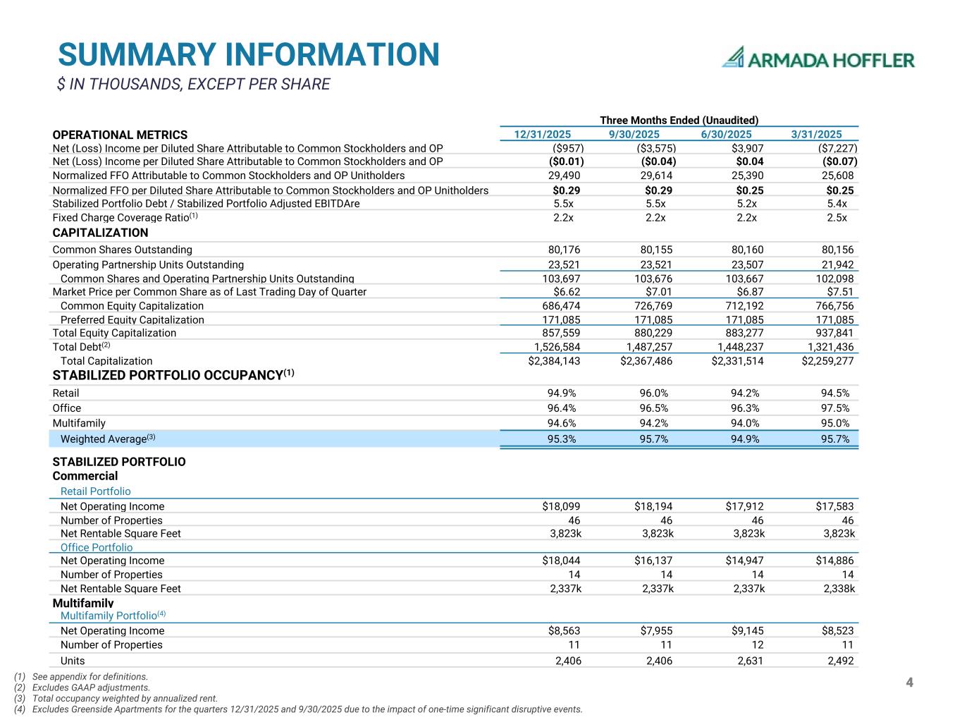 4(1) See appendix for definitions. (2) Excludes GAAP adjustments. (3) Total occupancy weighted by annualized rent. (4) Excludes Greenside Apartments for the quarters 12/31/2025 and 9/30/2025 due to the impact of one-time significant disruptive events. SUMMARY INFORMATION $ IN THOUSANDS, EXCEPT PER SHARE Three Months Ended (Unaudited) OPERATIONAL METRICS 12/31/2025 9/30/2025 6/30/2025 3/31/2025 Net (Loss) Income per Diluted Share Attributable to Common Stockholders and OP ($957) ($3,575) $3,907 ($7,227) Net (Loss) Income per Diluted Share Attributable to Common Stockholders and OP ($0.01) ($0.04) $0.04 ($0.07) Normalized FFO Attributable to Common Stockholders and OP Unitholders 29,490 29,614 25,390 25,608 Normalized FFO per Diluted Share Attributable to Common Stockholders and OP Unitholders $0.29 $0.29 $0.25 $0.25 Stabilized Portfolio Debt / Stabilized Portfolio Adjusted EBITDAre 5.5x 5.5x 5.2x 5.4x Fixed Charge Coverage Ratio(1) 2.2x 2.2x 2.2x 2.5x CAPITALIZATION Common Shares Outstanding 80,176 80,155 80,160 80,156 Operating Partnership Units Outstanding 23,521 23,521 23,507 21,942 Common Shares and Operating Partnership Units Outstanding 103,697 103,676 103,667 102,098 Market Price per Common Share as of Last Trading Day of Quarter $6.62 $7.01 $6.87 $7.51 Common Equity Capitalization 686,474 726,769 712,192 766,756 Preferred Equity Capitalization 171,085 171,085 171,085 171,085 Total Equity Capitalization 857,559 880,229 883,277 937,841 Total Debt(2) 1,526,584 1,487,257 1,448,237 1,321,436 Total Capitalization $2,384,143 $2,367,486 $2,331,514 $2,259,277 STABILIZED PORTFOLIO OCCUPANCY(1) Retail 94.9 % 96.0 % 94.2 % 94.5 % Office 96.4 % 96.5 % 96.3 % 97.5 % Multifamily 94.6 % 94.2 % 94.0 % 95.0 % Weighted Average(3) 95.3 % 95.7 % 94.9 % 95.7 % STABILIZED PORTFOLIO Commercial Retail Portfolio Net Operating Income $18,099 $18,194 $17,912 $17,583 Number of Properties 46 46 46 46 Net Rentable Square Feet 3,823k 3,823k 3,823k 3,823k Office Portfolio Net Operating Income $18,044 $16,137 $14,947 $14,886 Number of Properties 14 14 14 14 Net Rentable Square Feet 2,337k 2,337k 2,337k 2,338k Multifamily Multifamily Portfolio(4) Net Operating Income $8,563 $7,955 $9,145 $8,523 Number of Properties 11 11 12 11 Units 2,406 2,406 2,631 2,492