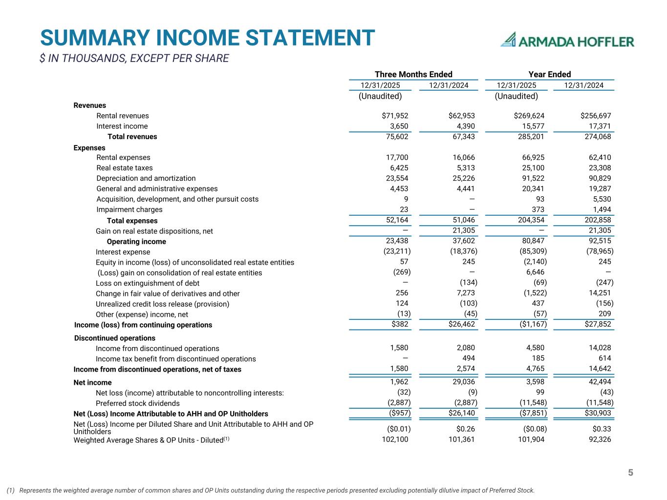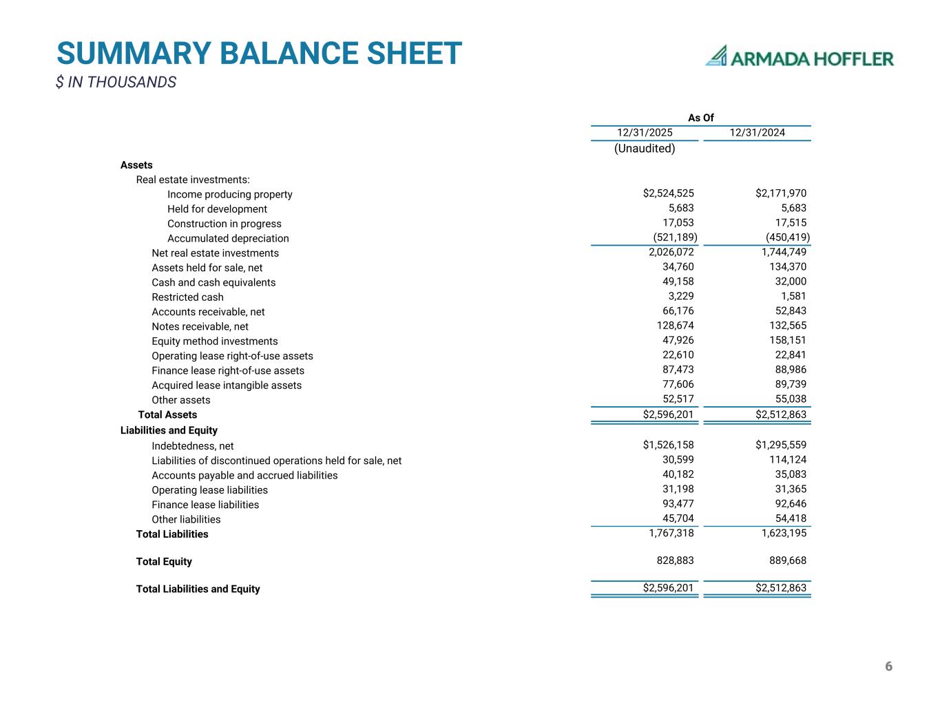 5 Three Months Ended Year Ended 12/31/2025 12/31/2024 12/31/2025 12/31/2024 (Unaudited) (Unaudited) Revenues Rental revenues $71,952 $62,953 $269,624 $256,697 Interest income 3,650 4,390 15,577 17,371 Total revenues 75,602 67,343 285,201 274,068 Expenses Rental expenses 17,700 16,066 66,925 62,410 Real estate taxes 6,425 5,313 25,100 23,308 Depreciation and amortization 23,554 25,226 91,522 90,829 General and administrative expenses 4,453 4,441 20,341 19,287 Acquisition, development, and other pursuit costs 9 — 93 5,530 Impairment charges 23 — 373 1,494 Total expenses 52,164 51,046 204,354 202,858 Gain on real estate dispositions, net — 21,305 — 21,305 Operating income 23,438 37,602 80,847 92,515 Interest expense (23,211) (18,376) (85,309) (78,965) Equity in income (loss) of unconsolidated real estate entities 57 245 (2,140) 245 (Loss) gain on consolidation of real estate entities (269) — 6,646 — Loss on extinguishment of debt — (134) (69) (247) Change in fair value of derivatives and other 256 7,273 (1,522) 14,251 Unrealized credit loss release (provision) 124 (103) 437 (156) Other (expense) income, net (13) (45) (57) 209 Income (loss) from continuing operations $382 $26,462 ($1,167) $27,852 Discontinued operations Income from discontinued operations 1,580 2,080 4,580 14,028 Income tax benefit from discontinued operations — 494 185 614 Income from discontinued operations, net of taxes 1,580 2,574 4,765 14,642 Net income 1,962 29,036 3,598 42,494 Net loss (income) attributable to noncontrolling interests: (32) (9) 99 (43) Preferred stock dividends (2,887) (2,887) (11,548) (11,548) Net (Loss) Income Attributable to AHH and OP Unitholders ($957) $26,140 ($7,851) $30,903 Net (Loss) Income per Diluted Share and Unit Attributable to AHH and OP Unitholders ($0.01) $0.26 ($0.08) $0.33 Weighted Average Shares & OP Units - Diluted(1) 102,100 101,361 101,904 92,326 SUMMARY INCOME STATEMENT $ IN THOUSANDS, EXCEPT PER SHARE (1) Represents the weighted average number of common shares and OP Units outstanding during the respective periods presented excluding potentially dilutive impact of Preferred Stock.