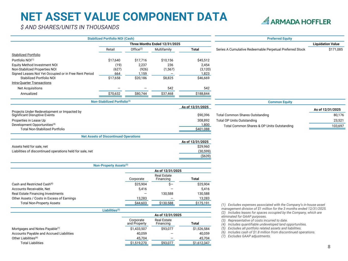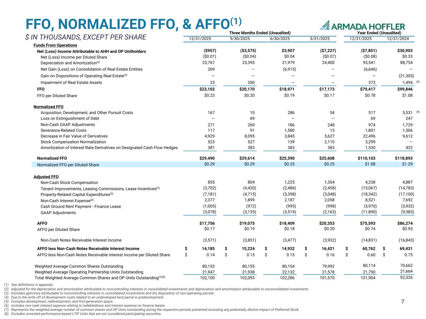 7 FFO, NORMALIZED FFO, & AFFO(1) $ IN THOUSANDS, EXCEPT PER SHARE Three Months Ended (Unaudited) Year Ended (Unaudited) 12/31/2025 9/30/2025 6/30/2025 3/31/2025 12/31/2025 12/31/2024 Funds From Operations Net (Loss) Income Attributable to AHH and OP Unitholders ($957) ($3,575) $3,907 ($7,227) ($7,851) $30,903 Net (Loss) Income per Diluted Share ($0.01) ($0.04) $0.04 ($0.07) ($0.08) $0.33 Depreciation and Amortization(2) 23,767 23,395 21,979 24,400 93,541 88,754 Net Gain (Loss) on Consolidation of Real Estate Entities 269 — (6,915) — (6,646) — Gain on Dispositions of Operating Real Estate(3) — — — — — (21,305) Impairment of Real Estate Assets 23 350 — — 373 1,494 (4) FFO $23,102 $20,170 $18,971 $17,173 $79,417 $99,846 FFO per Diluted Share $0.23 $0.20 $0.19 $0.17 $0.78 $1.08 Normalized FFO Acquisition, Development, and Other Pursuit Costs 167 10 286 54 517 5,531 (4) Loss on Extinguishment of Debt — 69 — — 69 247 Non-Cash GAAP Adjustments 271 269 186 248 974 1,729 Severance-Related Costs 117 91 1,580 13 1,801 1,506 Decrease in Fair Value of Derivatives 4,929 8,095 3,845 5,627 22,496 9,612 Stock Compensation Normalization 523 527 139 2,110 3,299 — Amortization of Interest Rate Derivatives on Designated Cash Flow Hedges 381 383 383 383 1,530 422 Normalized FFO $29,490 $29,614 $25,390 $25,608 $110,103 $118,893 Normalized FFO per Diluted Share $0.29 $0.29 $0.25 $0.25 $1.08 $1.29 Adjusted FFO Non-Cash Stock Compensation 855 804 1,225 1,354 4,238 4,887 Tenant Improvements, Leasing Commissions, Lease Incentives(5) (3,702) (4,420) (2,486) (2,458) (13,067) (14,783) Property-Related Capital Expenditures(5) (7,181) (4,715) (3,398) (3,048) (18,342) (17,100) Non-Cash Interest Expense(6) 2,377 1,899 2,187 2,058 8,521 7,692 Cash Ground Rent Payment - Finance Lease (1,005) (972) (995) (998) (3,970) (3,932) GAAP Adjustments (3,078) (3,135) (3,514) (2,163) (11,890) (9,383) AFFO $17,756 $19,075 $18,409 $20,353 $75,593 $86,274 AFFO per Diluted Share $0.17 $0.19 $0.18 $0.20 $0.74 $0.93 Non-Cash Notes Receivable Interest Income (3,571) (3,851) (3,477) (3,932) (14,831) (16,843) AFFO less Non-Cash Notes Receivable Interest Income $ 14,185 $ 15,224 $ 14,932 $ 16,421 $ 60,762 $ 69,431 AFFO less Non-Cash Notes Receivable Interest Income per Diluted Share $ 0.14 $ 0.15 $ 0.15 $ 0.16 $ 0.60 $ 0.75 Weighted Average Common Shares Outstanding 80,153 80,155 80,154 79,992 80,114 70,662 Weighted Average Operating Partnership Units Outstanding 21,947 21,938 22,132 21,578 21,790 21,664 Total Weighted Average Common Shares and OP Units Outstanding(7)(8) 102,100 102,093 102,286 101,570 101,904 92,326 (1) See definitions in appendix. (2) Adjusted for the depreciation and amortization attributable to noncontrolling interests in consolidated investments and depreciation and amortization attributable to unconsolidated investments. (3) Excludes gain/loss attributable to noncontrolling interests in consolidated investments and the disposition of non-operating parcels. (4) Due to the write off of development costs related to an undeveloped land parcel in predevelopment. (5) Excludes development, redevelopment, and first-generation space. (6) Includes non-cash interest expense relating to indebtedness and interest expense on finance leases. (7) Represents the weighted average number of common shares and OP Units outstanding during the respective periods presented excluding any potentially dilutive impact of Preferred Stock. (8) Excludes unvested performance-based LTIP Units that are not considered participating securities.
