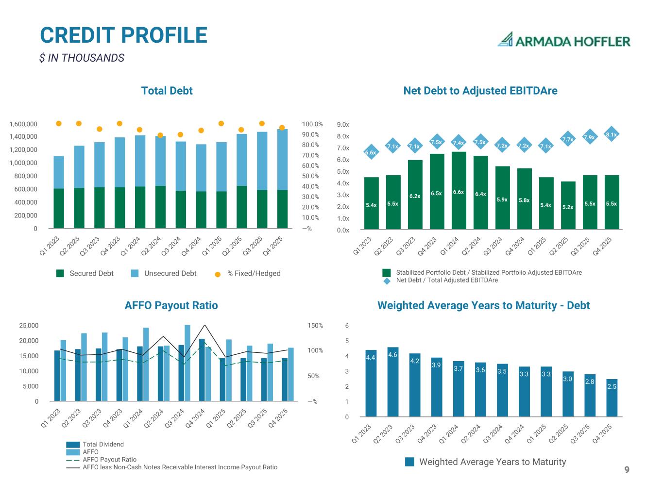 8 NET ASSET VALUE COMPONENT DATA (1) Excludes expenses associated with the Company’s in-house asset management division of $1 million for the 3 months ended 12/31/2025. (2) Includes leases for spaces occupied by the Company, which are eliminated for GAAP purposes. (3) Representative of costs incurred to date. (4) Includes quantifiable undeveloped land opportunities. (5) Excludes all portfolio related assets and liabilities. (6) Includes cash of $1.8 million from discontinued operations. (7) Excludes GAAP adjustments. $ AND SHARES/UNITS IN THOUSANDS Stabilized Portfolio NOI (Cash) Three Months Ended 12/31/2025 Retail Office(2) Multifamily Total Stabilized Portfolio Portfolio NOI(1) $17,640 $17,716 $10,156 $45,512 Equity Method Investment NOI (19) 2,237 236 2,454 Non-Stabilized Properties NOI (627) (926) (1,567) (3,120) Signed Leases Not Yet Occupied or in Free Rent Period 664 1,159 — 1,823 Stabilized Portfolio NOI $17,658 $20,186 $8,825 $46,669 Intra-Quarter Transactions Net Acquisitions — — 542 542 Annualized $70,632 $80,744 $37,468 $188,844 Non-Stabilized Portfolio(3) As of 12/31/2025 Projects Under Redevelopment or Impacted by Significant Disruptive Events $90,396 Properties in Lease Up 308,892 Development Opportunities(4) 1,800 Total Non-Stabilized Portfolio $401,088 Net Assets of Discontinued Operations As of 12/31/2025 Assets held for sale, net $29,960 Liabilities of discontinued operations held for sale, net (30,599) ($639) Non-Property Assets(5) As of 12/31/2025 Corporate Real Estate Financing Total Cash and Restricted Cash(6) $25,904 $— $25,904 Accounts Receivable, Net 5,416 — 5,416 Real Estate Financing Investments — 130,588 130,588 Other Assets / Costs in Excess of Earnings 13,283 — 13,283 Total Non-Property Assets $44,603 $130,588 $175,191 Liabilities(5) As of 12/31/2025 Corporate and Property Real Estate Financing Total Mortgages and Notes Payable(7) $1,433,507 $93,077 $1,526,584 Accounts Payable and Accrued Liabilities 40,059 — 40,059 Other Liabilities(6) 45,704 — 45,704 Total Liabilities $1,519,270 $93,077 $1,612,347 Preferred Equity Liquidation Value Series A Cumulative Redeemable Perpetual Preferred Stock $171,085 Common Equity As of 12/31/2025 Total Common Shares Outstanding 80,176 Total OP Units Outstanding 23,521 Total Common Shares & OP Units Outstanding 103,697