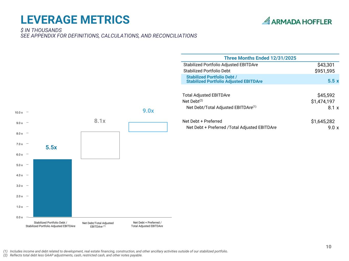 9 CREDIT PROFILE $ IN THOUSANDS Net Debt to Adjusted EBITDAre 5.4x 5.5x 6.2x 6.5x 6.6x 6.4x 5.9x 5.8x 5.4x 5.2x 5.5x 5.5x 6.6x 7.1x 7.1x 7.5x 7.4x 7.5x 7.2x 7.2x 7.1x 7.7x 7.9x 8.1x Stabilized Portfolio Debt / Stabilized Portfolio Adjusted EBITDAre Net Debt / Total Adjusted EBITDAre Q1 2 023 Q2 2023 Q3 2023 Q4 2023 Q1 2 024 Q2 2024 Q3 2024 Q4 2024 Q1 2 025 Q2 2025 Q3 2025 Q4 2025 0.0x 1.0x 2.0x 3.0x 4.0x 5.0x 6.0x 7.0x 8.0x 9.0x Total Debt Secured Debt Unsecured Debt % Fixed/Hedged Q1 2 02 3 Q2 2 02 3 Q3 2 02 3 Q4 2 02 3 Q1 2 02 4 Q2 2 02 4 Q3 2 02 4 Q4 2 02 4 Q1 2 02 5 Q2 2 02 5 Q3 2 02 5 Q4 2 02 5 0 200,000 400,000 600,000 800,000 1,000,000 1,200,000 1,400,000 1,600,000 —% 10.0% 20.0% 30.0% 40.0% 50.0% 60.0% 70.0% 80.0% 90.0% 100.0% AFFO Payout Ratio Total Dividend AFFO AFFO Payout Ratio AFFO less Non-Cash Notes Receivable Interest Income Payout Ratio Q1 2023 Q2 2023 Q3 2023 Q4 2023 Q1 2024 Q2 2024 Q3 2024 Q4 2024 Q1 2025 Q2 2025 Q3 2025 Q4 2025 0 5,000 10,000 15,000 20,000 25,000 —% 50% 100% 150% Weighted Average Years to Maturity - Debt 4.4 4.6 4.2 3.9 3.7 3.6 3.5 3.3 3.3 3.0 2.8 2.5 Weighted Average Years to Maturity Q1 2023 Q2 2023 Q3 2023 Q4 2023 Q1 2024 Q2 2024 Q3 2024 Q4 2024 Q1 2025 Q2 2025 Q3 2025 Q4 2025 0 1 2 3 4 5 6