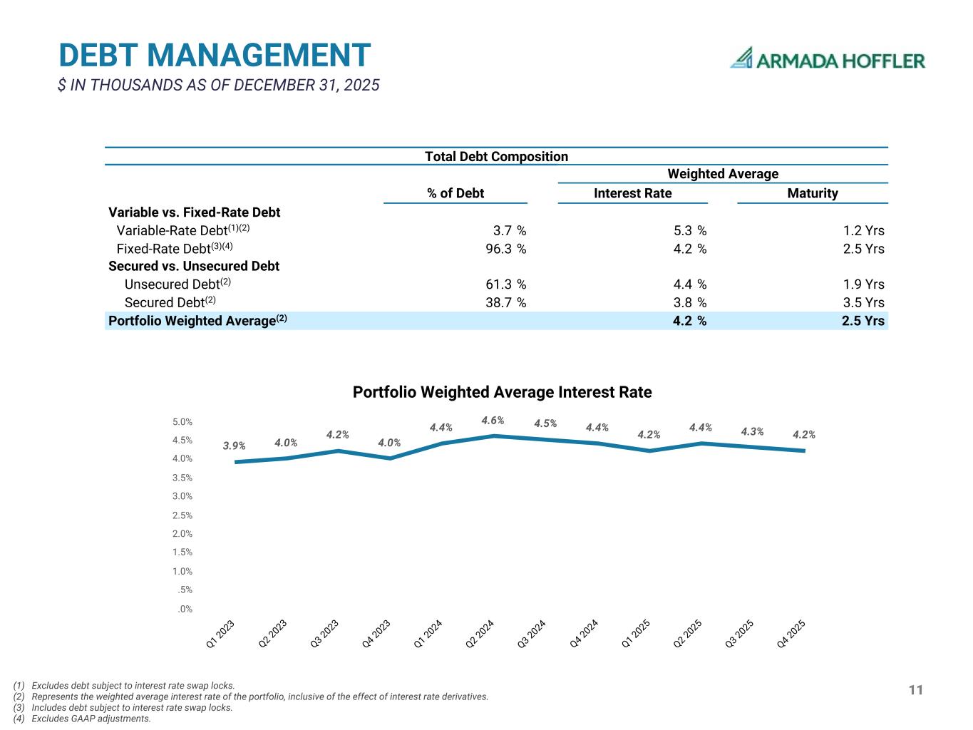 10 LEVERAGE METRICS $ IN THOUSANDS SEE APPENDIX FOR DEFINITIONS, CALCULATIONS, AND RECONCILIATIONS (1) Includes income and debt related to development, real estate financing, construction, and other ancillary activities outside of our stabilized portfolio. (2) Reflects total debt less GAAP adjustments, cash, restricted cash, and other notes payable. Three Months Ended 12/31/2025 Stabilized Portfolio Adjusted EBITDAre $43,301 Stabilized Portfolio Debt $951,595 Stabilized Portfolio Debt / Stabilized Portfolio Adjusted EBITDAre 5.5 x Total Adjusted EBITDAre $45,592 Net Debt(2) $1,474,197 Net Debt/Total Adjusted EBITDAre(1) 8.1 x Net Debt + Preferred $1,645,282 Net Debt + Preferred /Total Adjusted EBITDAre 9.0 x 0.0 x 1.0 x 2.0 x 3.0 x 4.0 x 5.0 x 6.0 x 7.0 x 8.0 x 9.0 x 10.0 x 5.5x 8.1x 9.0x Stabilized Portfolio Debt / Stabilized Portfolio Adjusted EBITDAre Net Debt/Total Adjusted EBITDAre (1) Net Debt + Preferred / Total Adjusted EBITDAre