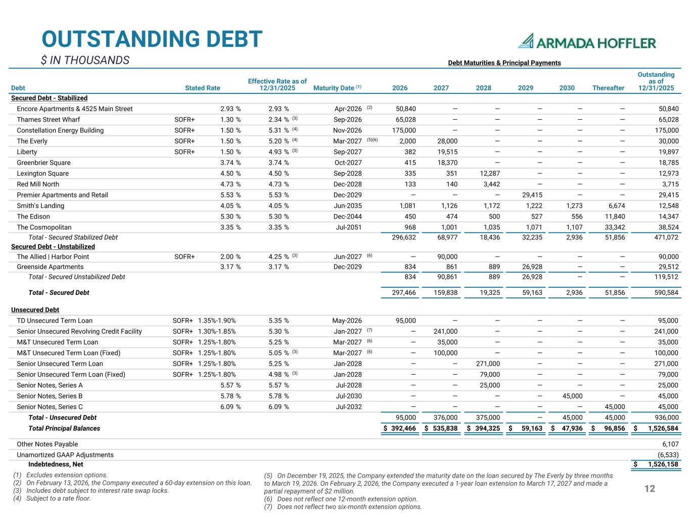 12 OUTSTANDING DEBT $ IN THOUSANDS (1) Excludes extension options. (2) On February 13, 2026, the Company executed a 60-day extension on this loan. (3) Includes debt subject to interest rate swap locks. (4) Subject to a rate floor. Debt Maturities & Principal Payments Debt Stated Rate Effective Rate as of 12/31/2025 Maturity Date (1) 2026 2027 2028 2029 2030 Thereafter Outstanding as of 12/31/2025 Secured Debt - Stabilized Encore Apartments & 4525 Main Street 2.93 % 2.93 % Apr-2026 (2) 50,840 — — — — — 50,840 Thames Street Wharf SOFR+ 1.30 % 2.34 % (3) Sep-2026 65,028 — — — — — 65,028 Constellation Energy Building SOFR+ 1.50 % 5.31 % (4) Nov-2026 175,000 — — — — — 175,000 The Everly SOFR+ 1.50 % 5.20 % (4) Mar-2027 (5)(6) 2,000 28,000 — — — — 30,000 Liberty SOFR+ 1.50 % 4.93 % (3) Sep-2027 382 19,515 — — — — 19,897 Greenbrier Square 3.74 % 3.74 % Oct-2027 415 18,370 — — — — 18,785 Lexington Square 4.50 % 4.50 % Sep-2028 335 351 12,287 — — — 12,973 Red Mill North 4.73 % 4.73 % Dec-2028 133 140 3,442 — — — 3,715 Premier Apartments and Retail 5.53 % 5.53 % Dec-2029 — — — 29,415 — — 29,415 Smith's Landing 4.05 % 4.05 % Jun-2035 1,081 1,126 1,172 1,222 1,273 6,674 12,548 The Edison 5.30 % 5.30 % Dec-2044 450 474 500 527 556 11,840 14,347 The Cosmopolitan 3.35 % 3.35 % Jul-2051 968 1,001 1,035 1,071 1,107 33,342 38,524 Total - Secured Stabilized Debt 296,632 68,977 18,436 32,235 2,936 51,856 471,072 Secured Debt - Unstabilized The Allied | Harbor Point SOFR+ 2.00 % 4.25 % (3) Jun-2027 (6) — 90,000 — — — — 90,000 Greenside Apartments 3.17 % 3.17 % Dec-2029 834 861 889 26,928 — — 29,512 Total - Secured Unstabilized Debt 834 90,861 889 26,928 — — 119,512 Total - Secured Debt 297,466 159,838 19,325 59,163 2,936 51,856 590,584 Unsecured Debt TD Unsecured Term Loan SOFR+ 1.35%-1.90% 5.35 % May-2026 95,000 — — — — — 95,000 Senior Unsecured Revolving Credit Facility SOFR+ 1.30%-1.85% 5.30 % Jan-2027 (7) — 241,000 — — — — 241,000 M&T Unsecured Term Loan SOFR+ 1.25%-1.80% 5.25 % Mar-2027 (6) — 35,000 — — — — 35,000 M&T Unsecured Term Loan (Fixed) SOFR+ 1.25%-1.80% 5.05 % (3) Mar-2027 (6) — 100,000 — — — — 100,000 Senior Unsecured Term Loan SOFR+ 1.25%-1.80% 5.25 % Jan-2028 — — 271,000 — — — 271,000 Senior Unsecured Term Loan (Fixed) SOFR+ 1.25%-1.80% 4.98 % (3) Jan-2028 — — 79,000 — — — 79,000 Senior Notes, Series A 5.57 % 5.57 % Jul-2028 — — 25,000 — — — 25,000 Senior Notes, Series B 5.78 % 5.78 % Jul-2030 — — — — 45,000 — 45,000 Senior Notes, Series C 6.09 % 6.09 % Jul-2032 — — — — — 45,000 45,000 Total - Unsecured Debt 95,000 376,000 375,000 — 45,000 45,000 936,000 Total Principal Balances $ 392,466 $ 535,838 $ 394,325 $ 59,163 $ 47,936 $ 96,856 $ 1,526,584 Other Notes Payable 6,107 Unamortized GAAP Adjustments (6,533) Indebtedness, Net $ 1,526,158 (5) On December 19, 2025, the Company extended the maturity date on the loan secured by The Everly by three months to March 19, 2026. On February 2, 2026, the Company executed a 1-year loan extension to March 17, 2027 and made a partial repayment of $2 million. (6) Does not reflect one 12-month extension option. (7) Does not reflect two six-month extension options.