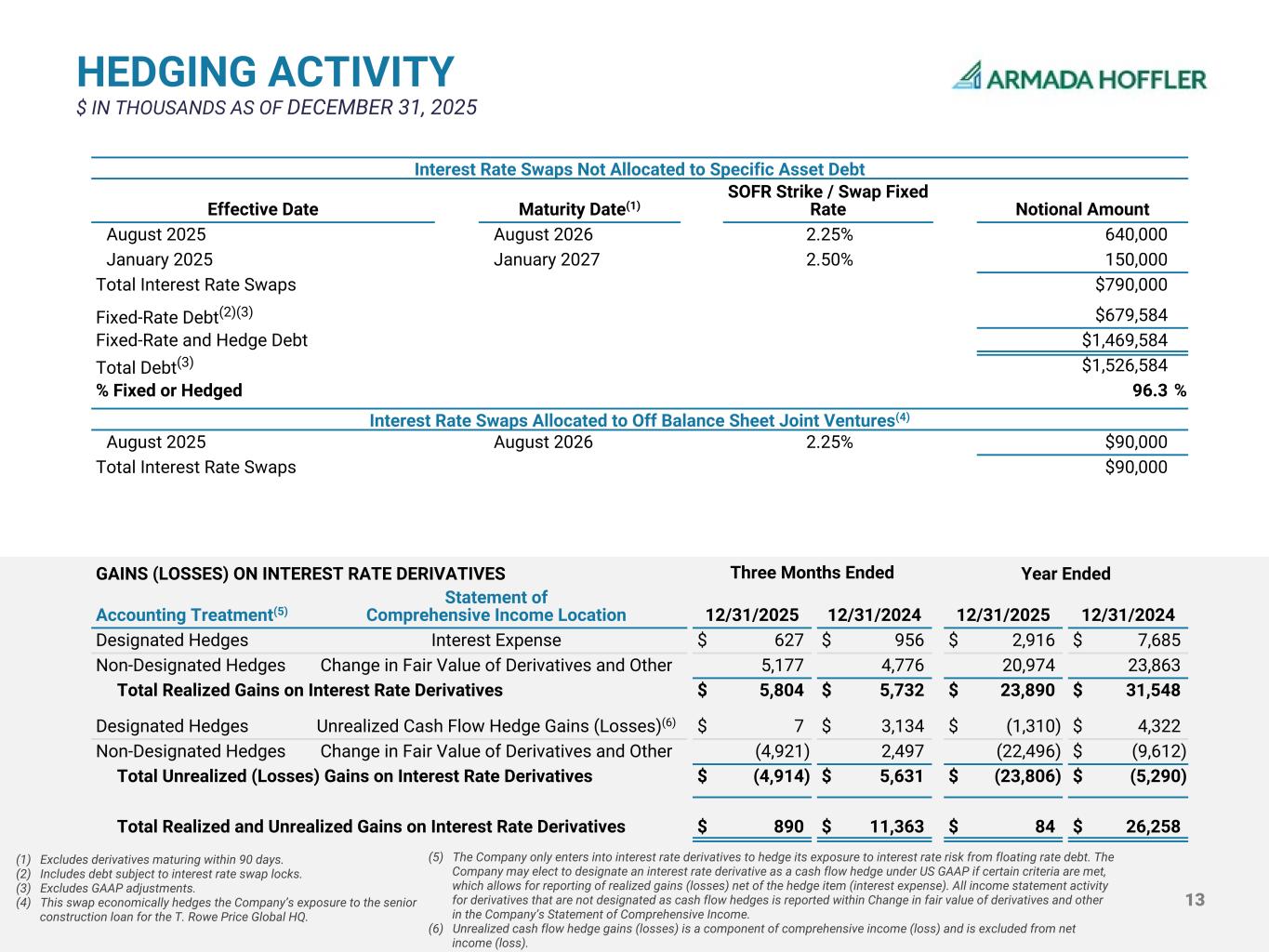 13 (1) Excludes derivatives maturing within 90 days. (2) Includes debt subject to interest rate swap locks. (3) Excludes GAAP adjustments. (4) This swap economically hedges the Company’s exposure to the senior construction loan for the T. Rowe Price Global HQ. HEDGING ACTIVITY GAINS (LOSSES) ON INTEREST RATE DERIVATIVES Three Months Ended Year Ended Accounting Treatment(5) Statement of Comprehensive Income Location 12/31/2025 12/31/2024 12/31/2025 12/31/2024 Designated Hedges Interest Expense $ 627 $ 956 $ 2,916 $ 7,685 Non-Designated Hedges Change in Fair Value of Derivatives and Other 5,177 4,776 20,974 23,863 Total Realized Gains on Interest Rate Derivatives $ 5,804 $ 5,732 $ 23,890 $ 31,548 Designated Hedges Unrealized Cash Flow Hedge Gains (Losses)(6) $ 7 $ 3,134 $ (1,310) $ 4,322 Non-Designated Hedges Change in Fair Value of Derivatives and Other (4,921) 2,497 (22,496) $ (9,612) Total Unrealized (Losses) Gains on Interest Rate Derivatives $ (4,914) $ 5,631 $ (23,806) $ (5,290) Total Realized and Unrealized Gains on Interest Rate Derivatives $ 890 $ 11,363 $ 84 $ 26,258 Interest Rate Swaps Not Allocated to Specific Asset Debt Effective Date Maturity Date(1) SOFR Strike / Swap Fixed Rate Notional Amount August 2025 August 2026 2.25% 640,000 January 2025 January 2027 2.50% 150,000 Total Interest Rate Swaps $790,000 Fixed-Rate Debt(2)(3) $679,584 Fixed-Rate and Hedge Debt $1,469,584 Total Debt(3) $1,526,584 % Fixed or Hedged 96.3 % Interest Rate Swaps Allocated to Off Balance Sheet Joint Ventures(4) August 2025 August 2026 2.25% $90,000 Total Interest Rate Swaps $90,000 $ IN THOUSANDS AS OF DECEMBER 31, 2025 (5) The Company only enters into interest rate derivatives to hedge its exposure to interest rate risk from floating rate debt. The Company may elect to designate an interest rate derivative as a cash flow hedge under US GAAP if certain criteria are met, which allows for reporting of realized gains (losses) net of the hedge item (interest expense). All income statement activity for derivatives that are not designated as cash flow hedges is reported within Change in fair value of derivatives and other in the Company’s Statement of Comprehensive Income. (6) Unrealized cash flow hedge gains (losses) is a component of comprehensive income (loss) and is excluded from net income (loss).