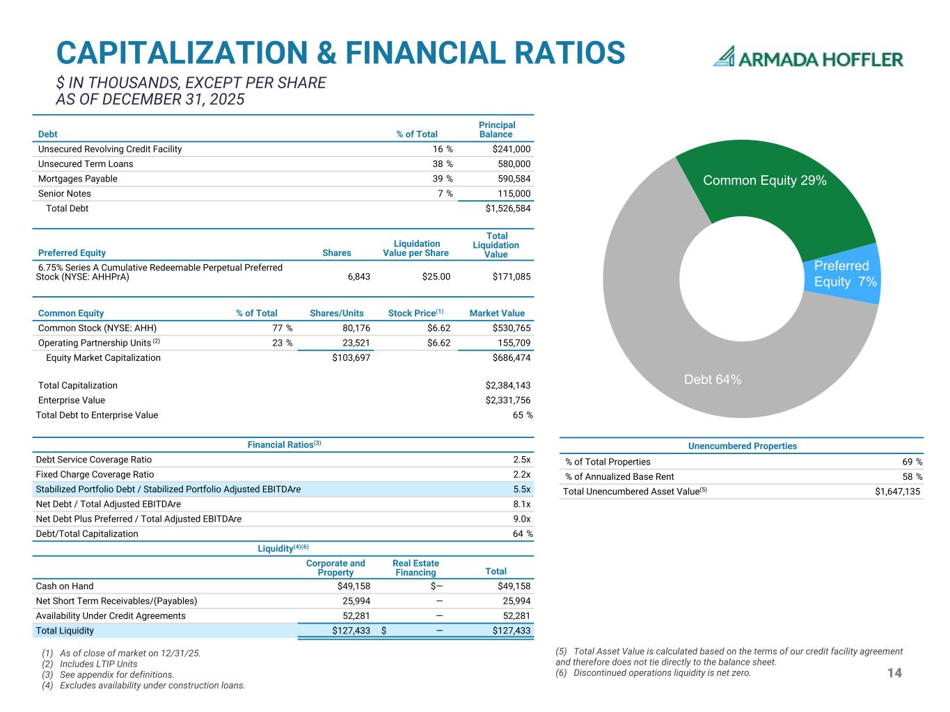 14 CAPITALIZATION & FINANCIAL RATIOS $ IN THOUSANDS, EXCEPT PER SHARE AS OF DECEMBER 31, 2025 (1) As of close of market on 12/31/25. (2) Includes LTIP Units (3) See appendix for definitions. (4) Excludes availability under construction loans. Debt % of Total Principal Balance Unsecured Revolving Credit Facility 16 % $241,000 Unsecured Term Loans 38 % 580,000 Mortgages Payable 39 % 590,584 Senior Notes 7 % 115,000 Total Debt $1,526,584 Preferred Equity Shares Liquidation Value per Share Total Liquidation Value 6.75% Series A Cumulative Redeemable Perpetual Preferred Stock (NYSE: AHHPrA) 6,843 $25.00 $171,085 Common Equity % of Total Shares/Units Stock Price(1) Market Value Common Stock (NYSE: AHH) 77 % 80,176 $6.62 $530,765 Operating Partnership Units (2) 23 % 23,521 $6.62 155,709 Equity Market Capitalization $103,697 $686,474 Total Capitalization $2,384,143 Enterprise Value $2,331,756 Total Debt to Enterprise Value 65 % Financial Ratios(3) Debt Service Coverage Ratio 2.5x Fixed Charge Coverage Ratio 2.2x Stabilized Portfolio Debt / Stabilized Portfolio Adjusted EBITDAre 5.5x Net Debt / Total Adjusted EBITDAre 8.1x Net Debt Plus Preferred / Total Adjusted EBITDAre 9.0x Debt/Total Capitalization 64 % Liquidity(4)(6) Corporate and Property Real Estate Financing Total Cash on Hand $49,158 $— $49,158 Net Short Term Receivables/(Payables) 25,994 — 25,994 Availability Under Credit Agreements 52,281 — 52,281 Total Liquidity $127,433 $ — $127,433 Unencumbered Properties % of Total Properties 69 % % of Annualized Base Rent 58 % Total Unencumbered Asset Value(5) $1,647,135 Preferred Equity 7% Debt 64% Common Equity 29% (5) Total Asset Value is calculated based on the terms of our credit facility agreement and therefore does not tie directly to the balance sheet. (6) Discontinued operations liquidity is net zero.