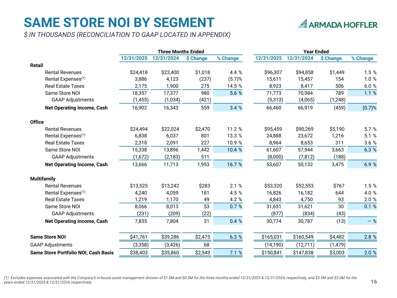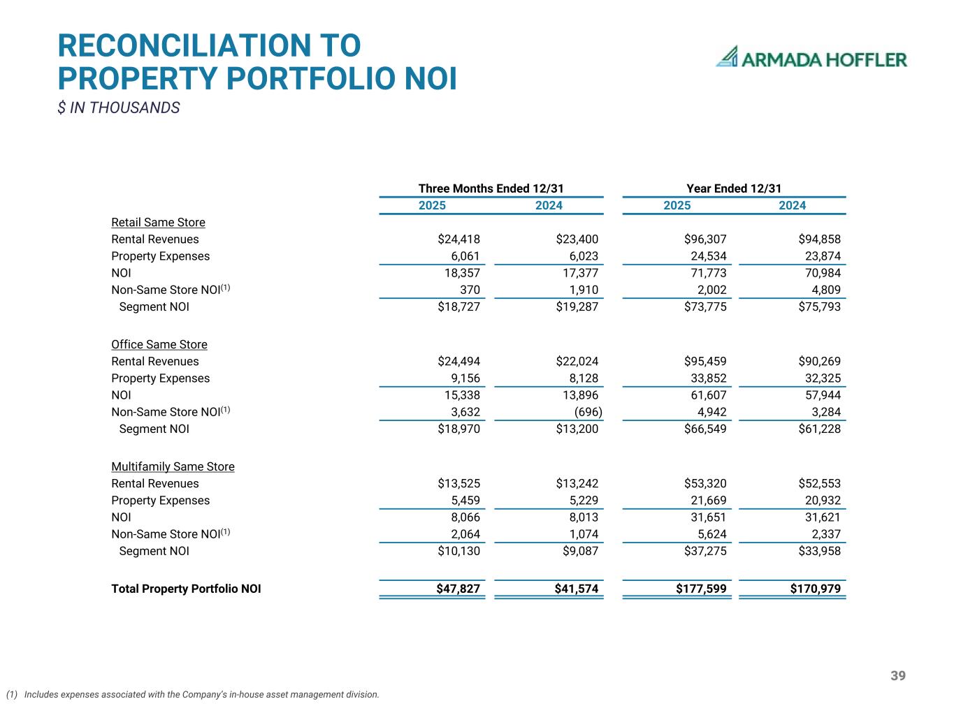 39 RECONCILIATION TO PROPERTY PORTFOLIO NOI $ IN THOUSANDS (1) Includes expenses associated with the Company’s in-house asset management division. Three Months Ended 12/31 Year Ended 12/31 2025 2024 2025 2024 Retail Same Store Rental Revenues $24,418 $23,400 $96,307 $94,858 Property Expenses 6,061 6,023 24,534 23,874 NOI 18,357 17,377 71,773 70,984 Non-Same Store NOI(1) 370 1,910 2,002 4,809 Segment NOI $18,727 $19,287 $73,775 $75,793 Office Same Store Rental Revenues $24,494 $22,024 $95,459 $90,269 Property Expenses 9,156 8,128 33,852 32,325 NOI 15,338 13,896 61,607 57,944 Non-Same Store NOI(1) 3,632 (696) 4,942 3,284 Segment NOI $18,970 $13,200 $66,549 $61,228 Multifamily Same Store Rental Revenues $13,525 $13,242 $53,320 $52,553 Property Expenses 5,459 5,229 21,669 20,932 NOI 8,066 8,013 31,651 31,621 Non-Same Store NOI(1) 2,064 1,074 5,624 2,337 Segment NOI $10,130 $9,087 $37,275 $33,958 Total Property Portfolio NOI $47,827 $41,574 $177,599 $170,979