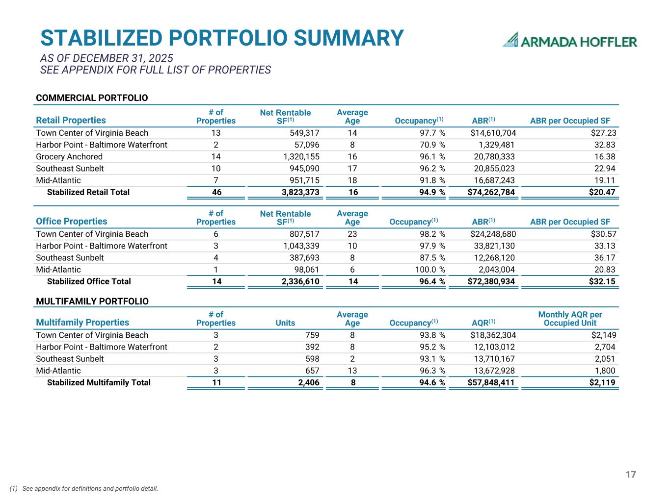 36 PROPERTY PORTFOLIO CONT. AS OF DECEMBER 31, 2025 Multifamily Properties - Stabilized Location Ownership % Year Built / Redeveloped Units Occupancy(1) AQR (1) Monthly AQR per Occupied Unit(1) Town Center of Virginia Beach Encore Apartments Virginia Beach, VA 100% 2014 286 94.4 % $6,077,041 $1,876 Premier Apartments Virginia Beach, VA 100% 2018 131 91.6 % 3,092,764 2,148 The Cosmopolitan Virginia Beach, VA 100% 2020 342 94.2 % 9,192,499 2,379 Harbor Point - Baltimore Waterfront 1305 Dock Street Baltimore, MD 90% 2016 103 97.1 % $3,165,430 $2,638 1405 Point(2) Baltimore, MD 100% 2018 289 94.5 % 8,937,582 2,728 Southeast Sunbelt Chandler Residences Roswell, GA 100% 2024 137 88.3 % $4,059,612 $2,796 Chronicle Mill Belmont, NC 85%(3) 2022 238 96.2 % 5,201,291 1,893 The Everly Gainesville, GA 100% 2022 223 92.8 % 4,449,264 1,791 Mid-Atlantic Liberty Apartments Newport News, VA 100% 2013 199 95.0 % $4,168,458 $1,838 Smith's Landing(2) Blacksburg, VA 100% 2009 284 100.0 % 6,203,040 1,820 The Edison Richmond, VA 100% 2014 174 92.0 % 3,301,430 1,719 Stabilized Multifamily Total 2,406 94.6 % $57,848,411 $2,119 Properties under Redevelopment or Impacted by Significant Disruptive Events Location Ownership % Year Built / Redeveloped Net Rentable SF (1) / Units Occupancy(1) ABR/AQR (1) ABR per Occupied SF/ Monthly AQR per Occupied Unit(1) Greenside Apartments Charlotte, NC 100% 2018 225 80.4 % $3,671,389 $1,690 Columbus Village II Virginia Beach, VA 100% 1996/2023 91,790 95.3 % 1,435,302 16.41 Equity Method Investments Location Ownership % Year Built/ Redeveloped Net Rentable SF (1) Occupancy(1) ABR (1)(4) ABR per Occupied SF(1) Harbor Point - Baltimore Waterfront T. Rowe Price Baltimore, MD 50% 2025 553,000 100.0 % $7,900,064 $14.29 Parcel 3 Retail Baltimore, MD 50% 2025 20,200 — % — — Equity Method Investments Total 573,200 96.5 % $7,900,064 $14 (1) See appendix for definitions. (2) The Company leases all or a portion of the land underlying this property pursuant to a ground lease. (3) The Company is entitled to a preferred return on its investment in this property. (4) Represents the Company’s 50% share of ABR. .