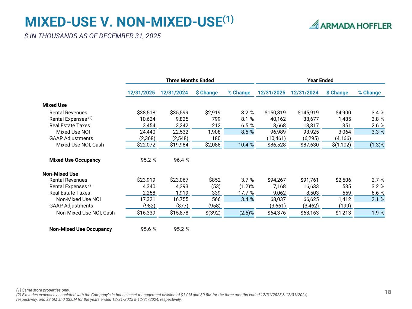 16 (1) Excludes expenses associated with the Company’s in-house asset management division of $1.0M and $0.5M for the three months ended 12/31/2025 & 12/31/2024, respectively, and $3.5M and $3.0M for the years ended 12/31/2025 & 12/31/2024, respectively. SAME STORE NOI BY SEGMENT $ IN THOUSANDS (RECONCILIATION TO GAAP LOCATED IN APPENDIX) Three Months Ended Year Ended 12/31/2025 12/31/2024 $ Change % Change 12/31/2025 12/31/2024 $ Change % Change Retail Rental Revenues $24,418 $23,400 $1,018 4.4 % $96,307 $94,858 $1,449 1.5 % Rental Expenses(1) 3,886 4,123 (237) (5.7) % 15,611 15,457 154 1.0 % Real Estate Taxes 2,175 1,900 275 14.5 % 8,923 8,417 506 6.0 % Same Store NOI 18,357 17,377 980 5.6 % 71,773 70,984 789 1.1 % GAAP Adjustments (1,455) (1,034) (421) (5,313) (4,065) (1,248) Net Operating Income, Cash 16,902 16,343 559 3.4 % 66,460 66,919 (459) (0.7) % Office Rental Revenues $24,494 $22,024 $2,470 11.2 % $95,459 $90,269 $5,190 5.7 % Rental Expenses(1) 6,838 6,037 801 13.3 % 24,888 23,672 1,216 5.1 % Real Estate Taxes 2,318 2,091 227 10.9 % 8,964 8,653 311 3.6 % Same Store NOI 15,338 13,896 1,442 10.4 % 61,607 57,944 3,663 6.3 % GAAP Adjustments (1,672) (2,183) 511 (8,000) (7,812) (188) Net Operating Income, Cash 13,666 11,713 1,953 16.7 % 53,607 50,132 3,475 6.9 % Multifamily Rental Revenues $13,525 $13,242 $283 2.1 % $53,320 $52,553 $767 1.5 % Rental Expenses(1) 4,240 4,059 181 4.5 % 16,826 16,182 644 4.0 % Real Estate Taxes 1,219 1,170 49 4.2 % 4,843 4,750 93 2.0 % Same Store NOI 8,066 8,013 53 0.7 % 31,651 31,621 30 0.1 % GAAP Adjustments (231) (209) (22) (877) (834) (43) Net Operating Income, Cash 7,835 7,804 31 0.4 % 30,774 30,787 (13) — % Same Store NOI $41,761 $39,286 $2,475 6.3 % $165,031 $160,549 $4,482 2.8 % GAAP Adjustments (3,358) (3,426) 0 68 (14,190) (12,711) 0 (1,479) Same Store Portfolio NOI, Cash Basis $38,403 $35,860 $2,543 7.1 % $150,841 $147,838 $3,003 2.0 %