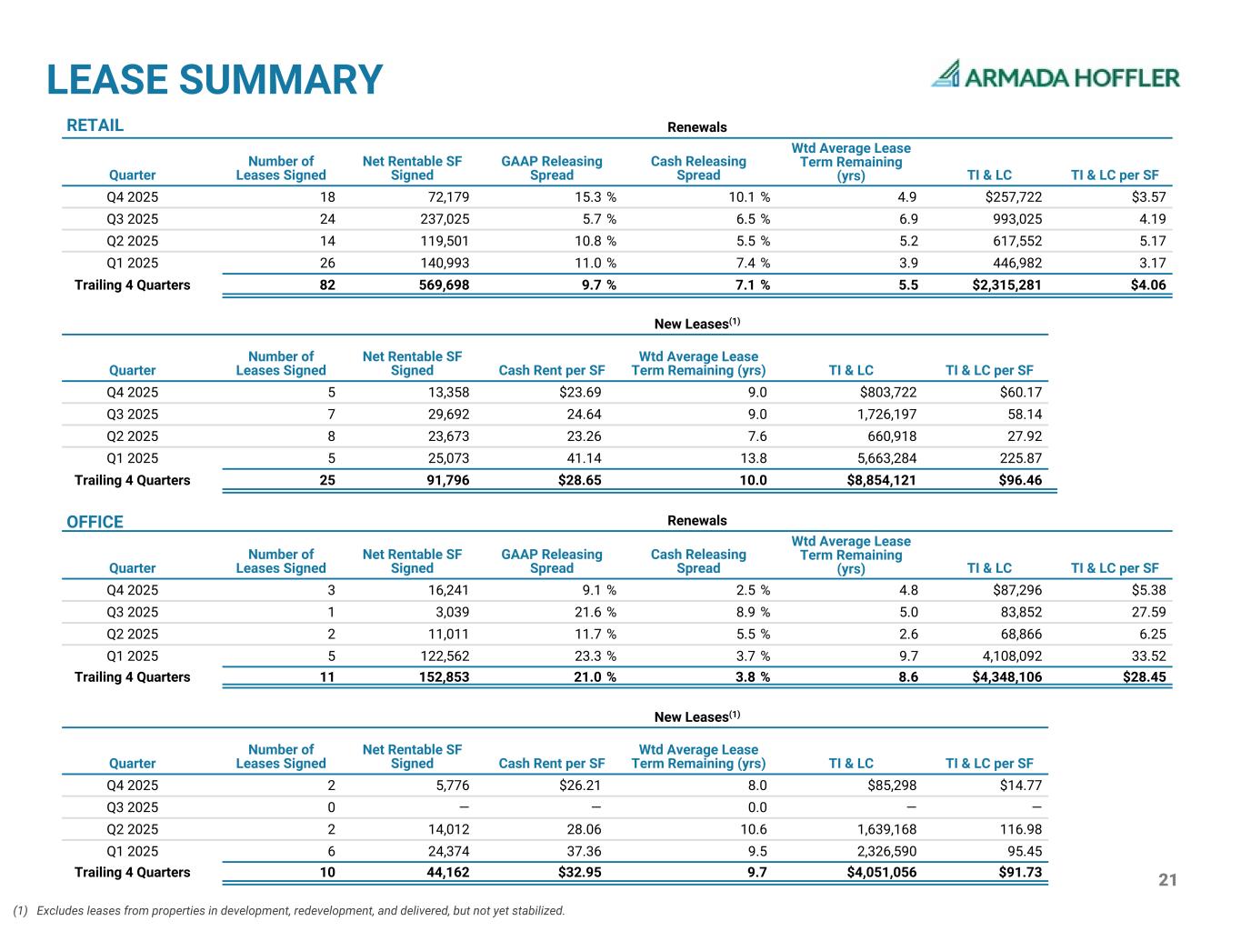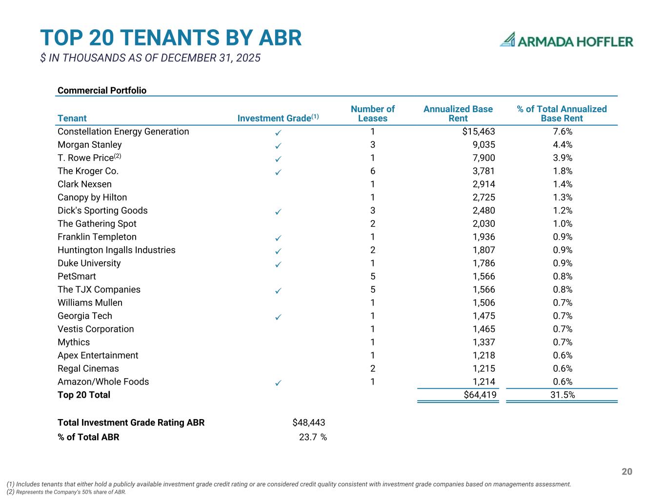 20 TOP 20 TENANTS BY ABR $ IN THOUSANDS AS OF DECEMBER 31, 2025 Commercial Portfolio Tenant Investment Grade(1) Number of Leases Annualized Base Rent % of Total Annualized Base Rent Constellation Energy Generation ü 1 $15,463 7.6% Morgan Stanley ü 3 9,035 4.4% T. Rowe Price(2) ü 1 7,900 3.9% The Kroger Co. ü 6 3,781 1.8% Clark Nexsen 1 2,914 1.4% Canopy by Hilton 1 2,725 1.3% Dick's Sporting Goods ü 3 2,480 1.2% The Gathering Spot 2 2,030 1.0% Franklin Templeton ü 1 1,936 0.9% Huntington Ingalls Industries ü 2 1,807 0.9% Duke University ü 1 1,786 0.9% PetSmart 5 1,566 0.8% The TJX Companies ü 5 1,566 0.8% Williams Mullen 1 1,506 0.7% Georgia Tech ü 1 1,475 0.7% Vestis Corporation 1 1,465 0.7% Mythics 1 1,337 0.7% Apex Entertainment 1 1,218 0.6% Regal Cinemas 2 1,215 0.6% Amazon/Whole Foods ü 1 1,214 0.6% Top 20 Total $64,419 31.5% Total Investment Grade Rating ABR $48,443 % of Total ABR 23.7 % (1) Includes tenants that either hold a publicly available investment grade credit rating or are considered credit quality consistent with investment grade companies based on managements assessment. (2) Represents the Company’s 50% share of ABR.