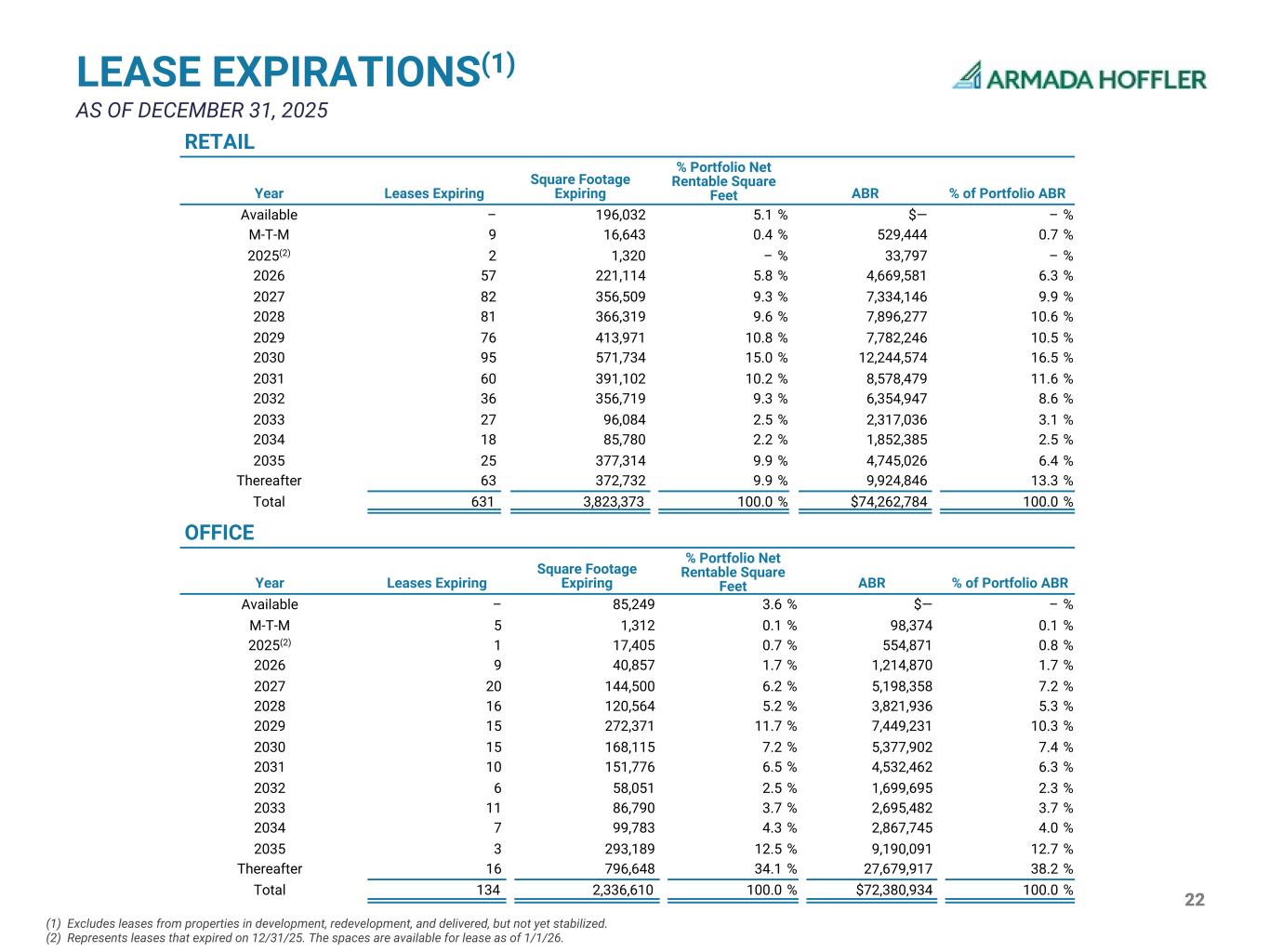 21 LEASE SUMMARY (1) Excludes leases from properties in development, redevelopment, and delivered, but not yet stabilized. RETAIL Renewals Quarter Number of Leases Signed Net Rentable SF Signed GAAP Releasing Spread Cash Releasing Spread Wtd Average Lease Term Remaining (yrs) TI & LC TI & LC per SF Q4 2025 18 72,179 15.3 % 10.1 % 4.9 $257,722 $3.57 Q3 2025 24 237,025 5.7 % 6.5 % 6.9 993,025 4.19 Q2 2025 14 119,501 10.8 % 5.5 % 5.2 617,552 5.17 Q1 2025 26 140,993 11.0 % 7.4 % 3.9 446,982 3.17 Trailing 4 Quarters 82 569,698 9.7 % 7.1 % 5.5 $2,315,281 $4.06 New Leases(1) Quarter Number of Leases Signed Net Rentable SF Signed Cash Rent per SF Wtd Average Lease Term Remaining (yrs) TI & LC TI & LC per SF Q4 2025 5 13,358 $23.69 9.0 $803,722 $60.17 Q3 2025 7 29,692 24.64 9.0 1,726,197 58.14 Q2 2025 8 23,673 23.26 7.6 660,918 27.92 Q1 2025 5 25,073 41.14 13.8 5,663,284 225.87 Trailing 4 Quarters 25 91,796 $28.65 10.0 $8,854,121 $96.46 OFFICE Renewals Quarter Number of Leases Signed Net Rentable SF Signed GAAP Releasing Spread Cash Releasing Spread Wtd Average Lease Term Remaining (yrs) TI & LC TI & LC per SF Q4 2025 3 16,241 9.1 % 2.5 % 4.8 $87,296 $5.38 Q3 2025 1 3,039 21.6 % 8.9 % 5.0 83,852 27.59 Q2 2025 2 11,011 11.7 % 5.5 % 2.6 68,866 6.25 Q1 2025 5 122,562 23.3 % 3.7 % 9.7 4,108,092 33.52 Trailing 4 Quarters 11 152,853 21.0 % 3.8 % 8.6 $4,348,106 $28.45 New Leases(1) Quarter Number of Leases Signed Net Rentable SF Signed Cash Rent per SF Wtd Average Lease Term Remaining (yrs) TI & LC TI & LC per SF Q4 2025 2 5,776 $26.21 8.0 $85,298 $14.77 Q3 2025 0 — — 0.0 — — Q2 2025 2 14,012 28.06 10.6 1,639,168 116.98 Q1 2025 6 24,374 37.36 9.5 2,326,590 95.45 Trailing 4 Quarters 10 44,162 $32.95 9.7 $4,051,056 $91.73