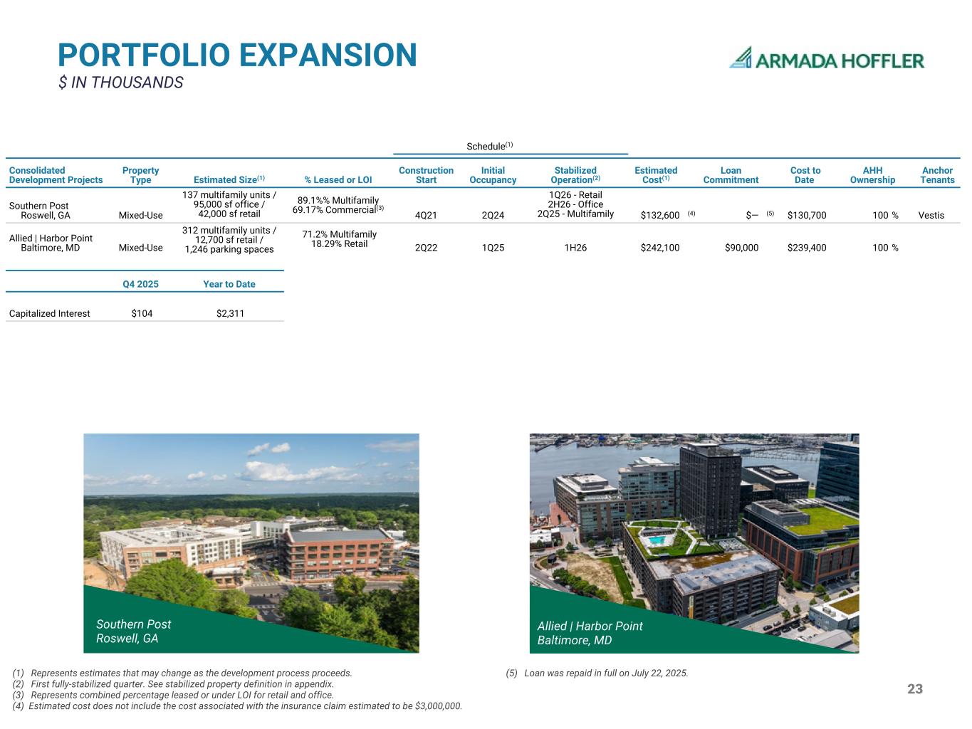 23 PORTFOLIO EXPANSION $ IN THOUSANDS Schedule(1) Consolidated Development Projects Property Type Estimated Size(1) % Leased or LOI Construction Start Initial Occupancy Stabilized Operation(2) Estimated Cost(1) Loan Commitment Cost to Date AHH Ownership Anchor Tenants Southern Post Roswell, GA Mixed-Use 137 multifamily units / 95,000 sf office / 42,000 sf retail 89.1%% Multifamily 69.17% Commercial(3) 4Q21 2Q24 1Q26 - Retail 2H26 - Office 2Q25 - Multifamily $132,600 (4) $— (5) $130,700 100 % Vestis Allied | Harbor Point Baltimore, MD Mixed-Use 312 multifamily units / 12,700 sf retail / 1,246 parking spaces 71.2% Multifamily 18.29% Retail 2Q22 1Q25 1H26 $242,100 $90,000 $239,400 100 % Q4 2025 Year to Date Capitalized Interest $104 $2,311 (1) Represents estimates that may change as the development process proceeds. (2) First fully-stabilized quarter. See stabilized property definition in appendix. (3) Represents combined percentage leased or under LOI for retail and office. (4) Estimated cost does not include the cost associated with the insurance claim estimated to be $3,000,000. (5) Loan was repaid in full on July 22, 2025. Allied | Harbor Point Baltimore, MD Southern Post Roswell, GA