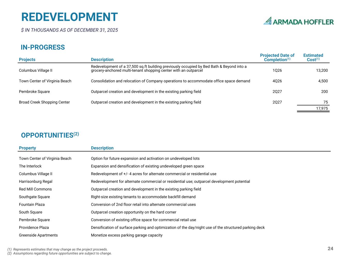 24 REDEVELOPMENT Projects Description Projected Date of Completion(1) Estimated Cost(1) Columbus Village II Redevelopment of a 37,500 sq.ft building previously occupied by Bed Bath & Beyond into a grocery-anchored multi-tenant shopping center with an outparcel 1Q26 13,200 Town Center of Virginia Beach Consolidation and relocation of Company operations to accommodate office space demand 4Q26 4,500 Pembroke Square Outparcel creation and development in the existing parking field 2Q27 200 Broad Creek Shopping Center Outparcel creation and development in the existing parking field 2Q27 75 17,975 $ IN THOUSANDS AS OF DECEMBER 31, 2025 Property Description Town Center of Virginia Beach Option for future expansion and activation on undeveloped lots The Interlock Expansion and densification of existing undeveloped green space Columbus Village II Redevelopment of +/- 4 acres for alternate commercial or residential use Harrisonburg Regal Redevelopment for alternate commercial or residential use; outparcel development potential Red Mill Commons Outparcel creation and development in the existing parking field Southgate Square Right-size existing tenants to accommodate backfill demand Fountain Plaza Conversion of 2nd floor retail into alternate commercial uses South Square Outparcel creation opportunity on the hard corner Pembroke Square Conversion of existing office space for commercial retail use Providence Plaza Densification of surface parking and optimization of the day/night use of the structured parking deck Greenside Apartments Monetize excess parking garage capacity IN-PROGRESS OPPORTUNITIES(2) (1) Represents estimates that may change as the project proceeds. (2) Assumptions regarding future opportunities are subject to change.