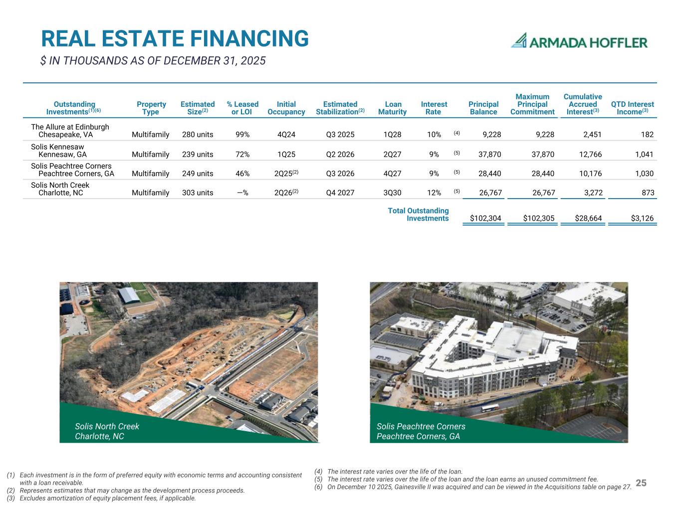 25 REAL ESTATE FINANCING $ IN THOUSANDS AS OF DECEMBER 31, 2025 The Interlock Atlanta, GA (1) Each investment is in the form of preferred equity with economic terms and accounting consistent with a loan receivable. (2) Represents estimates that may change as the development process proceeds. (3) Excludes amortization of equity placement fees, if applicable. Outstanding Investments(1)(6) Property Type Estimated Size(2) % Leased or LOI Initial Occupancy Estimated Stabilization(2) Loan Maturity Interest Rate Principal Balance Maximum Principal Commitment Cumulative Accrued Interest(3) QTD Interest Income(3) The Allure at Edinburgh Chesapeake, VA Multifamily 280 units 99% 4Q24 Q3 2025 1Q28 10% (4) 9,228 9,228 2,451 182 Solis Kennesaw Kennesaw, GA Multifamily 239 units 72% 1Q25 Q2 2026 2Q27 9% (5) 37,870 37,870 12,766 1,041 Solis Peachtree Corners Peachtree Corners, GA Multifamily 249 units 46% 2Q25(2) Q3 2026 4Q27 9% (5) 28,440 28,440 10,176 1,030 Solis North Creek Charlotte, NC Multifamily 303 units —% 2Q26(2) Q4 2027 3Q30 12% (5) 26,767 26,767 3,272 873 Total Outstanding Investments $102,304 $102,305 $28,664 $3,126 (4) The interest rate varies over the life of the loan. (5) The interest rate varies over the life of the loan and the loan earns an unused commitment fee. (6) On December 10 2025, Gainesville II was acquired and can be viewed in the Acquisitions table on page 27. Solis North Creek Charlotte, NC Solis Peachtree Corners Peachtr e Corners, GA