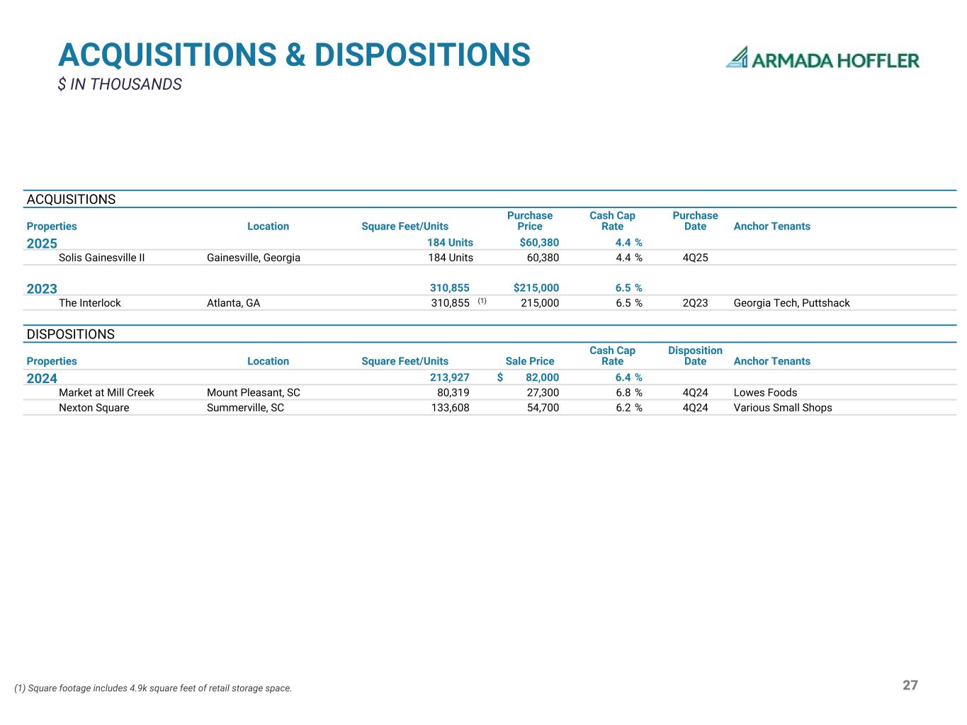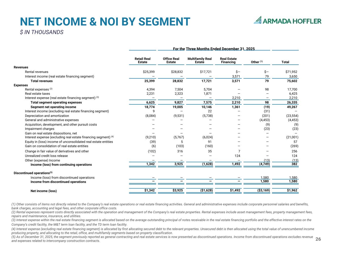 26 NET INCOME & NOI BY SEGMENT $ IN THOUSANDS For the Three Months Ended December 31, 2025 Retail Real Estate Office Real Estate Multifamily Real Estate Real Estate Financing Other (1) Total Revenues Rental revenues $25,399 $28,832 $17,721 $— $— $71,952 Interest income (real estate financing segment) — — — 3,571 79 3,650 Total revenues 25,399 28,832 17,721 3,571 79 75,602 Expenses Rental expenses (2) 4,394 7,504 5,704 — 98 17,700 Real estate taxes 2,231 2,323 1,871 — — 6,425 Interest expense (real estate financing segment) (3) — — — 2,210 — 2,210 Total segment operating expenses 6,625 9,827 7,575 2,210 98 26,335 Segment net operating income 18,774 19,005 10,146 1,361 (19) 49,267 Interest income (excluding real estate financing segment) 9 — 22 — (31) — Depreciation and amortization (8,084) (9,531) (5,738) — (201) (23,554) General and administrative expenses — — — — (4,453) (4,453) Acquisition, development, and other pursuit costs — — — — (9) (9) Impairment charges — — — — (23) (23) Gain on real estate dispositions, net — — — — — — Interest expense (excluding real estate financing segment) (4) (9,210) (5,767) (6,024) — — (21,001) Equity in (loss) income of unconsolidated real estate entities (39) 5 91 — — 57 Gain on consolidation of real estate entities (6) (103) (160) — — (269) Change in fair value of derivatives and other (102) 316 35 7 — 256 Unrealized credit loss release — — — 124 — 124 Other (expense) Income — — — — (13) (13) Income (loss) from continuing operations 1,342 3,925 (1,628) 1,492 (4,749) 382 Discontinued operations(5) Income (loss) from discontinued operations — — — — 1,580 1,580 Income from discontinued operations — — — — 1,580 1,580 Net income (loss) $1,342 $3,925 ($1,628) $1,492 ($3,169) $1,962 (1) Other consists of items not directly related to the Company’s real estate operations or real estate financing activities. General and administrative expenses include corporate personnel salaries and benefits, bank charges, accounting and legal fees, and other corporate office costs. (2) Rental expenses represent costs directly associated with the operation and management of the Company’s real estate properties. Rental expenses include asset management fees, property management fees, repairs and maintenance, insurance, and utilities. (3) Interest expense within the real estate financing segment is allocated based on the average outstanding principal of notes receivable in the real estate financing portfolio and the effective interest rates on the Company’s credit facility, the M&T term loan facility, and the TD term loan facility. (4) Interest expense (excluding real estate financing segment) is allocated by first allocating secured debt to the relevant properties. Unsecured debt is then allocated using the total value of unencumbered income producing property, and allocating to the retail, office, and multifamily segments based on property classification. (5) As of December 31, 2025, the segment previously reported as general contracting and real estate services is now presented as discontinued operations. Income from discontinued operations excludes revenue and expenses related to intercompany construction contracts.