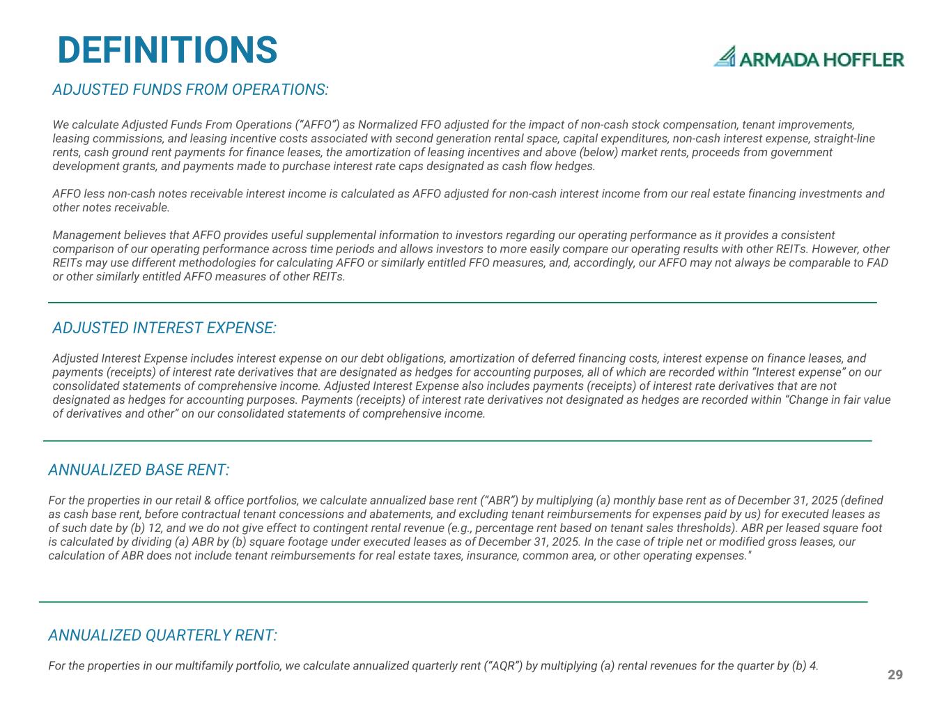 29 ANNUALIZED BASE RENT: For the properties in our retail & office portfolios, we calculate annualized base rent (“ABR”) by multiplying (a) monthly base rent as of December 31, 2025 (defined as cash base rent, before contractual tenant concessions and abatements, and excluding tenant reimbursements for expenses paid by us) for executed leases as of such date by (b) 12, and we do not give effect to contingent rental revenue (e.g., percentage rent based on tenant sales thresholds). ABR per leased square foot is calculated by dividing (a) ABR by (b) square footage under executed leases as of December 31, 2025. In the case of triple net or modified gross leases, our calculation of ABR does not include tenant reimbursements for real estate taxes, insurance, common area, or other operating expenses." DEFINITIONS ANNUALIZED QUARTERLY RENT: For the properties in our multifamily portfolio, we calculate annualized quarterly rent (“AQR”) by multiplying (a) rental revenues for the quarter by (b) 4. ADJUSTED INTEREST EXPENSE: Adjusted Interest Expense includes interest expense on our debt obligations, amortization of deferred financing costs, interest expense on finance leases, and payments (receipts) of interest rate derivatives that are designated as hedges for accounting purposes, all of which are recorded within “Interest expense” on our consolidated statements of comprehensive income. Adjusted Interest Expense also includes payments (receipts) of interest rate derivatives that are not designated as hedges for accounting purposes. Payments (receipts) of interest rate derivatives not designated as hedges are recorded within “Change in fair value of derivatives and other” on our consolidated statements of comprehensive income. ADJUSTED FUNDS FROM OPERATIONS: We calculate Adjusted Funds From Operations (“AFFO”) as Normalized FFO adjusted for the impact of non-cash stock compensation, tenant improvements, leasing commissions, and leasing incentive costs associated with second generation rental space, capital expenditures, non-cash interest expense, straight-line rents, cash ground rent payments for finance leases, the amortization of leasing incentives and above (below) market rents, proceeds from government development grants, and payments made to purchase interest rate caps designated as cash flow hedges. AFFO less non-cash notes receivable interest income is calculated as AFFO adjusted for non-cash interest income from our real estate financing investments and other notes receivable. Management believes that AFFO provides useful supplemental information to investors regarding our operating performance as it provides a consistent comparison of our operating performance across time periods and allows investors to more easily compare our operating results with other REITs. However, other REITs may use different methodologies for calculating AFFO or similarly entitled FFO measures, and, accordingly, our AFFO may not always be comparable to FAD or other similarly entitled AFFO measures of other REITs.
