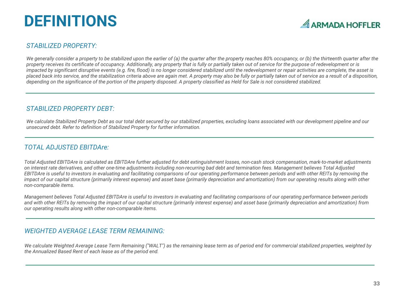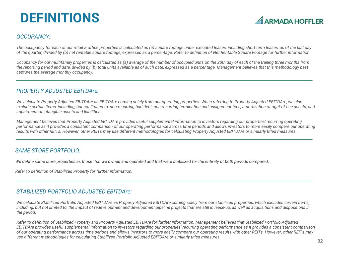32 PROPERTY ADJUSTED EBITDAre: We calculate Property Adjusted EBITDAre as EBITDAre coming solely from our operating properties. When referring to Property Adjusted EBITDAre, we also exclude certain items, including, but not limited to, non-recurring bad debt, non-recurring termination and assignment fees, amortization of right-of-use assets, and impairment of intangible assets and liabilities. Management believes that Property Adjusted EBITDAre provides useful supplemental information to investors regarding our properties’ recurring operating performance as it provides a consistent comparison of our operating performance across time periods and allows investors to more easily compare our operating results with other REITs. However, other REITs may use different methodologies for calculating Property Adjusted EBITDAre or similarly titled measures. DEFINITIONS OCCUPANCY: The occupancy for each of our retail & office properties is calculated as (a) square footage under executed leases, including short term leases, as of the last day of the quarter, divided by (b) net rentable square footage, expressed as a percentage. Refer to definition of Net Rentable Square Footage for further information. Occupancy for our multifamily properties is calculated as (a) average of the number of occupied units on the 20th day of each of the trailing three months from the reporting period end date, divided by (b) total units available as of such date, expressed as a percentage. Management believes that this methodology best captures the average monthly occupancy. SAME STORE PORTFOLIO: We define same store properties as those that we owned and operated and that were stabilized for the entirety of both periods compared. Refer to definition of Stabilized Property for further information. STABILIZED PORTFOLIO ADJUSTED EBITDAre: We calculate Stabilized Portfolio Adjusted EBITDAre as Property Adjusted EBITDAre coming solely from our stabilized properties, which excludes certain items, including, but not limited to, the impact of redevelopment and development pipeline projects that are still in lease-up, as well as acquisitions and dispositions in the period. Refer to definition of Stabilized Property and Property Adjusted EBITDAre for further information. Management believes that Stabilized Portfolio Adjusted EBITDAre provides useful supplemental information to investors regarding our properties’ recurring operating performance as it provides a consistent comparison of our operating performance across time periods and allows investors to more easily compare our operating results with other REITs. However, other REITs may use different methodologies for calculating Stabilized Portfolio Adjusted EBITDAre or similarly titled measures.