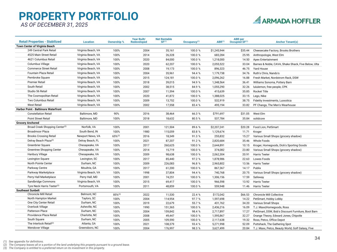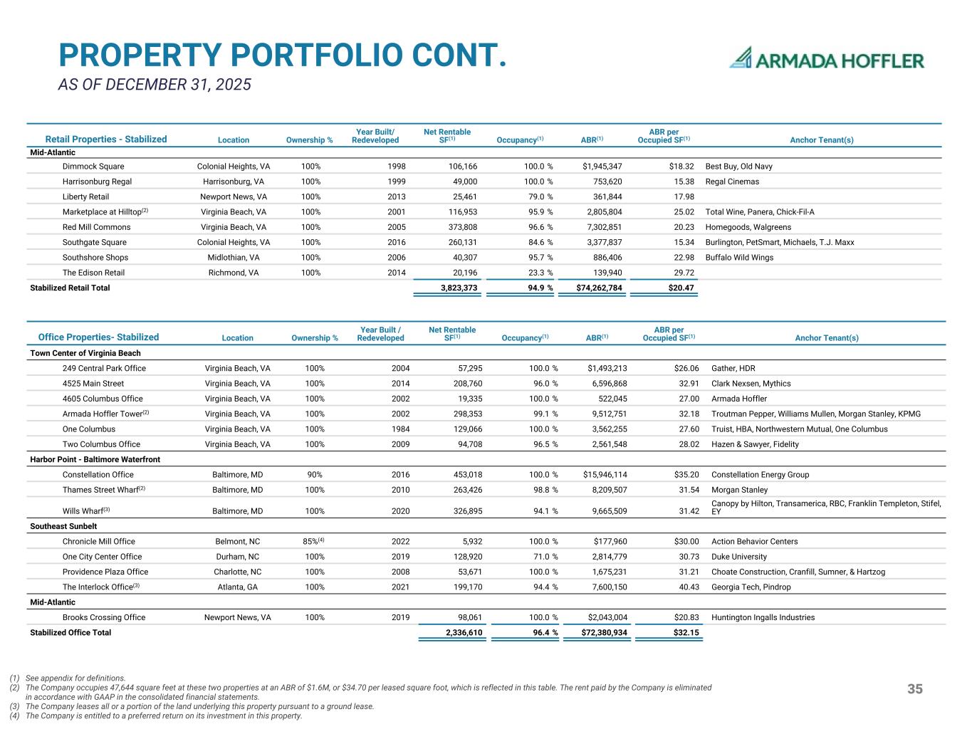 34 PROPERTY PORTFOLIO AS OF DECEMBER 31, 2025 Retail Properties - Stabilized Location Ownership % Year Built/ Redeveloped Net Rentable SF(1) Occupancy(1) ABR(1) ABR per Occupied SF(1) Anchor Tenant(s) Town Center of Virginia Beach 249 Central Park Retail Virginia Beach, VA 100% 2004 35,161 100.0 % $1,245,944 $35.44 Cheesecake Factory, Brooks Brothers 4525 Main Street Retail Virginia Beach, VA 100% 2014 26,328 100.0 % 683,284 25.95 Anthropologie, West Elm 4621 Columbus Retail Virginia Beach, VA 100% 2020 84,000 100.0 % 1,218,000 14.50 Apex Entertainment Columbus Village Virginia Beach, VA 100% 2020 62,207 100.0 % 2,055,522 33.04 Barnes & Noble, CAVA, Shake Shack, Five Below, Ulta Commerce Street Retail Virginia Beach, VA 100% 2008 19,173 100.0 % 896,323 46.75 Yard House Fountain Plaza Retail Virginia Beach, VA 100% 2004 35,961 94.4 % 1,179,738 34.76 Ruth's Chris, Nando's Pembroke Square Virginia Beach, VA 100% 2015 124,181 100.0 % 2,096,262 16.88 Fresh Market, Nordstrom Rack, DSW Premier Retail Virginia Beach, VA 100% 2018 39,015 94.9 % 1,348,564 36.41 Williams Sonoma, Pottery Barn South Retail Virginia Beach, VA 100% 2002 38,515 84.9 % 1,055,290 32.26 lululemon, free people, CPK Studio 56 Retail Virginia Beach, VA 100% 2007 11,594 100.0 % 415,639 35.85 Rocket Title The Cosmopolitan Retail Virginia Beach, VA 100% 2020 41,872 100.0 % 1,388,025 33.15 Lego, Nike Two Columbus Retail Virginia Beach, VA 100% 2009 13,752 100.0 % 532,919 38.75 Fidelity Investments, Luxxotica West Retail Virginia Beach, VA 100% 2002 17,558 83.4 % 495,194 33.82 PF Changs, The Men's Wearhouse Harbor Point - Baltimore Waterfront Constellation Retail Baltimore, MD 90% 2016 38,464 66.3 % $791,697 $31.05 West Elm Point Street Retail Baltimore, MD 100% 2018 18,632 80.5 % 537,784 35.84 solidcore Grocery Anchored Broad Creek Shopping Center(2) Norfolk, VA 100% 2001 121,504 89.6 % $2,207,241 $20.28 Food Lion, PetSmart Broadmoor Plaza South Bend, IN 100% 1980 115,059 83.8 % 1,129,674 11.71 Kroger Brooks Crossing Retail Newport News, VA 65%(3) 2016 18,349 91.3 % 255,832 15.27 Various Small Shops (grocery shadow) Delray Beach Plaza(2) Delray Beach, FL 100% 2021 87,207 91.2 % 2,820,684 35.46 Whole Foods Greenbrier Square Chesapeake, VA 100% 2017 260,625 100.0 % 2,644,891 10.15 Kroger, Homegoods, Dick's Sporting Goods Greentree Shopping Center Chesapeake, VA 100% 2014 15,719 100.0 % 374,082 23.80 Various Small Shops (grocery shadow) Hanbury Village Chesapeake, VA 100% 2009 98,638 100.0 % 2,062,304 20.91 Harris Teeter Lexington Square Lexington, SC 100% 2017 85,440 97.2 % 1,878,986 22.63 Lowes Foods North Pointe Center Durham, NC 100% 2009 226,083 96.8 % 2,965,802 13.56 Harris Teeter Parkway Centre Moultrie, GA 100% 2017 61,200 100.0 % 867,367 14.17 Publix Parkway Marketplace Virginia Beach, VA 100% 1998 37,804 94.4 % 740,768 20.75 Various Small Shops (grocery shadow) Perry Hall Marketplace Perry Hall, MD 100% 2001 74,251 100.0 % 1,306,156 17.59 Safeway Sandbridge Commons Virginia Beach, VA 100% 2015 69,417 100.0 % 966,598 13.92 Harris Teeter Tyre Neck Harris Teeter(2) Portsmouth, VA 100% 2011 48,859 100.0 % 559,948 11.46 Harris Teeter Southeast Sunbelt Chronicle Mill Retail Belmont, NC 85%(3) 2022 11,530 22.4 % $172,042 $66.53 Chronicle Mill Collective North Hampton Market Taylors, SC 100% 2004 114,954 97.7 % 1,597,698 14.22 PetSmart, Hobby Lobby One City Center Retail Durham, NC 100% 2019 22,679 55.7 % 431,762 34.20 Various Small Shops Overlook Village Asheville, NC 100% 1990 151,365 100.0 % 2,436,216 16.09 T.J. Maxx|Homegoods, Ross Patterson Place Durham, NC 100% 2004 159,842 98.4 % 2,717,897 17.27 PetSmart, DSW, Bob's Discount Furniture, Boot Barn Providence Plaza Retail Charlotte, NC 100% 2008 49,447 100.0 % 1,595,867 32.27 Orange Theory, Edward Jones, Chipotle South Square Durham, NC 100% 2005 109,590 100.0 % 2,117,638 19.32 Ross, Petco, Office Depot The Interlock Retail(2) Atlanta, GA 100% 2021 108,379 93.4 % 5,271,998 52.09 Puttshack, The Gathering Spot Wendover Village Greensboro, NC 100% 2004 176,997 98.3 % 3,627,499 20.84 T.J. Maxx, Petco, Beauty World, Golf Galaxy, Five Below (1) See appendix for definitions. (2) The Company leases all or a portion of the land underlying this property pursuant to a ground lease. (3) The Company is entitled to a preferred return on its investment in this property.