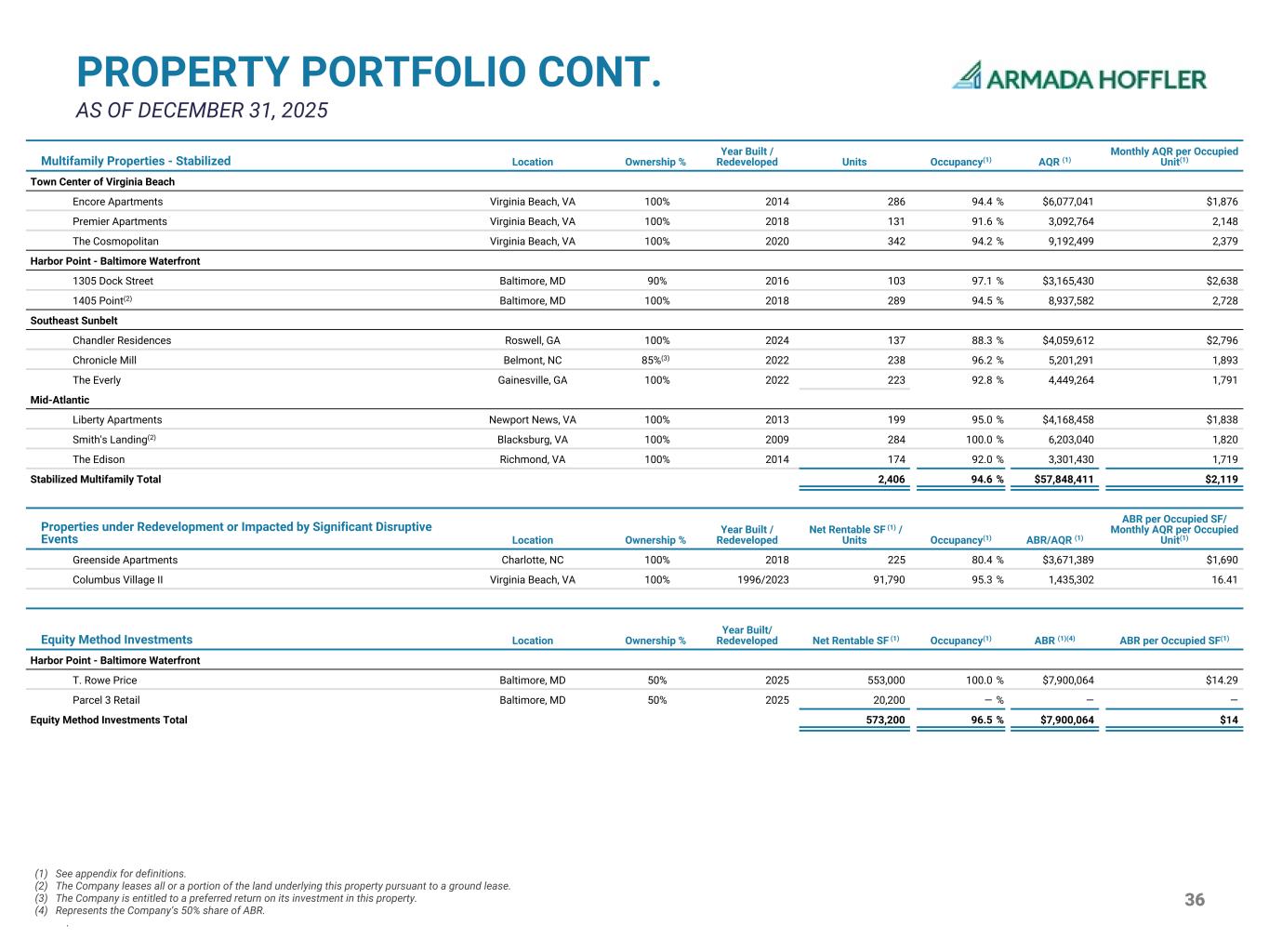 35 PROPERTY PORTFOLIO CONT. AS OF DECEMBER 31, 2025 Retail Properties - Stabilized Location Ownership % Year Built/ Redeveloped Net Rentable SF(1) Occupancy(1) ABR(1) ABR per Occupied SF(1) Anchor Tenant(s) Mid-Atlantic Dimmock Square Colonial Heights, VA 100% 1998 106,166 100.0 % $1,945,347 $18.32 Best Buy, Old Navy Harrisonburg Regal Harrisonburg, VA 100% 1999 49,000 100.0 % 753,620 15.38 Regal Cinemas Liberty Retail Newport News, VA 100% 2013 25,461 79.0 % 361,844 17.98 Marketplace at Hilltop(2) Virginia Beach, VA 100% 2001 116,953 95.9 % 2,805,804 25.02 Total Wine, Panera, Chick-Fil-A Red Mill Commons Virginia Beach, VA 100% 2005 373,808 96.6 % 7,302,851 20.23 Homegoods, Walgreens Southgate Square Colonial Heights, VA 100% 2016 260,131 84.6 % 3,377,837 15.34 Burlington, PetSmart, Michaels, T.J. Maxx Southshore Shops Midlothian, VA 100% 2006 40,307 95.7 % 886,406 22.98 Buffalo Wild Wings The Edison Retail Richmond, VA 100% 2014 20,196 23.3 % 139,940 29.72 Stabilized Retail Total 3,823,373 94.9 % $74,262,784 $20.47 (1) See appendix for definitions. (2) The Company occupies 47,644 square feet at these two properties at an ABR of $1.6M, or $34.70 per leased square foot, which is reflected in this table. The rent paid by the Company is eliminated in accordance with GAAP in the consolidated financial statements. (3) The Company leases all or a portion of the land underlying this property pursuant to a ground lease. (4) The Company is entitled to a preferred return on its investment in this property. Office Properties- Stabilized Location Ownership % Year Built / Redeveloped Net Rentable SF(1) Occupancy(1) ABR(1) ABR per Occupied SF(1) Anchor Tenant(s) Town Center of Virginia Beach 249 Central Park Office Virginia Beach, VA 100% 2004 57,295 100.0 % $1,493,213 $26.06 Gather, HDR 4525 Main Street Virginia Beach, VA 100% 2014 208,760 96.0 % 6,596,868 32.91 Clark Nexsen, Mythics 4605 Columbus Office Virginia Beach, VA 100% 2002 19,335 100.0 % 522,045 27.00 Armada Hoffler Armada Hoffler Tower(2) Virginia Beach, VA 100% 2002 298,353 99.1 % 9,512,751 32.18 Troutman Pepper, Williams Mullen, Morgan Stanley, KPMG One Columbus Virginia Beach, VA 100% 1984 129,066 100.0 % 3,562,255 27.60 Truist, HBA, Northwestern Mutual, One Columbus Two Columbus Office Virginia Beach, VA 100% 2009 94,708 96.5 % 2,561,548 28.02 Hazen & Sawyer, Fidelity Harbor Point - Baltimore Waterfront Constellation Office Baltimore, MD 90% 2016 453,018 100.0 % $15,946,114 $35.20 Constellation Energy Group Thames Street Wharf(2) Baltimore, MD 100% 2010 263,426 98.8 % 8,209,507 31.54 Morgan Stanley Wills Wharf(3) Baltimore, MD 100% 2020 326,895 94.1 % 9,665,509 31.42 Canopy by Hilton, Transamerica, RBC, Franklin Templeton, Stifel, EY Southeast Sunbelt Chronicle Mill Office Belmont, NC 85%(4) 2022 5,932 100.0 % $177,960 $30.00 Action Behavior Centers One City Center Office Durham, NC 100% 2019 128,920 71.0 % 2,814,779 30.73 Duke University Providence Plaza Office Charlotte, NC 100% 2008 53,671 100.0 % 1,675,231 31.21 Choate Construction, Cranfill, Sumner, & Hartzog The Interlock Office(3) Atlanta, GA 100% 2021 199,170 94.4 % 7,600,150 40.43 Georgia Tech, Pindrop Mid-Atlantic Brooks Crossing Office Newport News, VA 100% 2019 98,061 100.0 % $2,043,004 $20.83 Huntington Ingalls Industries Stabilized Office Total 2,336,610 96.4 % $72,380,934 $32.15