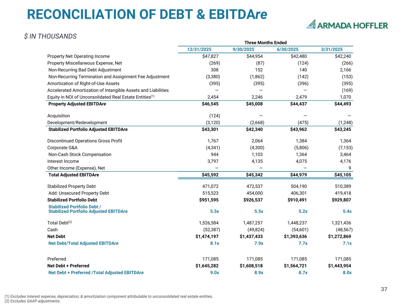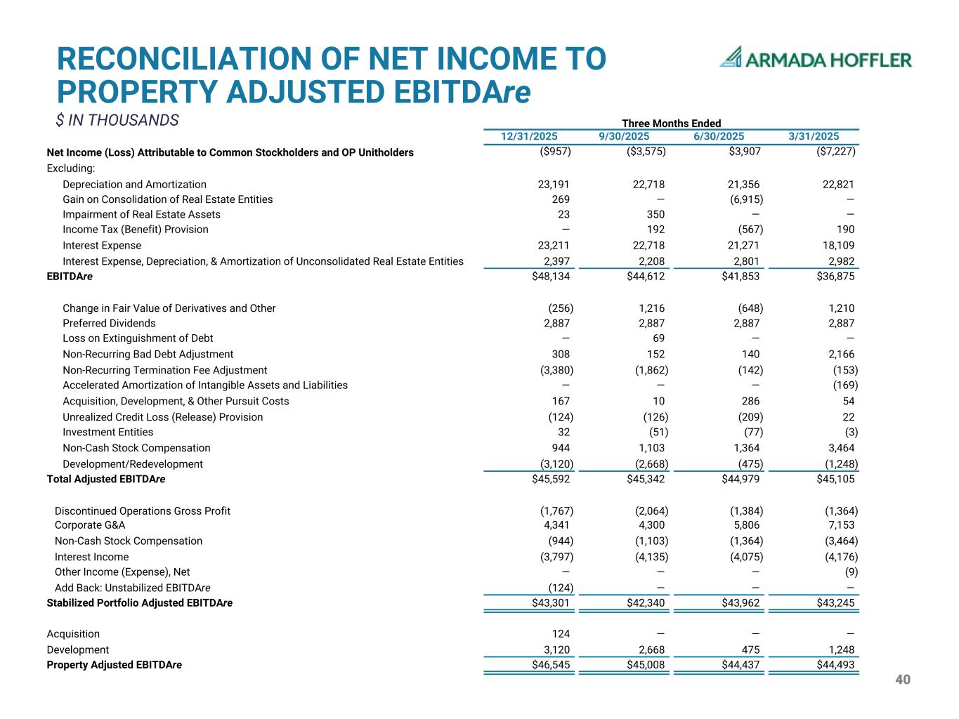40 Three Months Ended 12/31/2025 9/30/2025 6/30/2025 3/31/2025 Net Income (Loss) Attributable to Common Stockholders and OP Unitholders ($957) ($3,575) $3,907 ($7,227) Excluding: Depreciation and Amortization 23,191 22,718 21,356 22,821 Gain on Consolidation of Real Estate Entities 269 — (6,915) — Impairment of Real Estate Assets 23 350 — — Income Tax (Benefit) Provision — 192 (567) 190 Interest Expense 23,211 22,718 21,271 18,109 Interest Expense, Depreciation, & Amortization of Unconsolidated Real Estate Entities 2,397 2,208 2,801 2,982 EBITDAre $48,134 $44,612 $41,853 $36,875 Change in Fair Value of Derivatives and Other (256) 1,216 (648) 1,210 Preferred Dividends 2,887 2,887 2,887 2,887 Loss on Extinguishment of Debt — 69 — — Non-Recurring Bad Debt Adjustment 308 152 140 2,166 Non-Recurring Termination Fee Adjustment (3,380) (1,862) (142) (153) Accelerated Amortization of Intangible Assets and Liabilities — — — (169) Acquisition, Development, & Other Pursuit Costs 167 10 286 54 Unrealized Credit Loss (Release) Provision (124) (126) (209) 22 Investment Entities 32 (51) (77) (3) Non-Cash Stock Compensation 944 1,103 1,364 3,464 Development/Redevelopment (3,120) (2,668) (475) (1,248) Total Adjusted EBITDAre $45,592 $45,342 $44,979 $45,105 Discontinued Operations Gross Profit (1,767) (2,064) (1,384) (1,364) Corporate G&A 4,341 4,300 5,806 7,153 Non-Cash Stock Compensation (944) (1,103) (1,364) (3,464) Interest Income (3,797) (4,135) (4,075) (4,176) Other Income (Expense), Net — — — (9) Add Back: Unstabilized EBITDAre (124) — — — Stabilized Portfolio Adjusted EBITDAre $43,301 $42,340 $43,962 $43,245 Acquisition 124 — — — Development 3,120 2,668 475 1,248 Property Adjusted EBITDAre $46,545 $45,008 $44,437 $44,493 RECONCILIATION OF NET INCOME TO PROPERTY ADJUSTED EBITDAre $ IN THOUSANDS