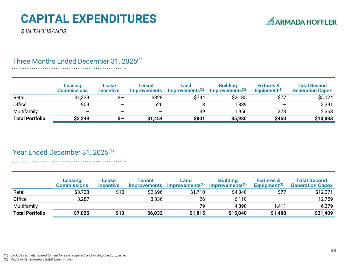 38 $ IN THOUSANDS CAPITAL EXPENDITURES (1) Excludes activity related to held for sale, acquired, and/or disposed properties. (2) Represents recurring capital expenditures. Leasing Commissions Lease Incentive Tenant Improvements Land Improvements(2) Building Improvements(2) Fixtures & Equipment(2) Total Second Generation Capex Retail $1,339 $— $828 $744 $2,135 $77 $5,124 Office 909 — 626 18 1,839 — 3,391 Multifamily — — — 39 1,956 373 2,368 Total Portfolio $2,249 $— $1,454 $801 $5,930 $450 $10,883 Three Months Ended December 31, 2025(1) Year Ended December 31, 2025(1) Leasing Commissions Lease Incentive Tenant Improvements Land Improvements(2) Building Improvements(2) Fixtures & Equipment(2) Total Second Generation Capex Retail $3,738 $10 $2,696 $1,710 $4,040 $77 $12,271 Office 3,287 — 3,336 26 6,110 — 12,759 Multifamily — — — 79 4,890 1,411 6,379 Total Portfolio $7,025 $10 $6,032 $1,815 $15,040 $1,488 $31,409