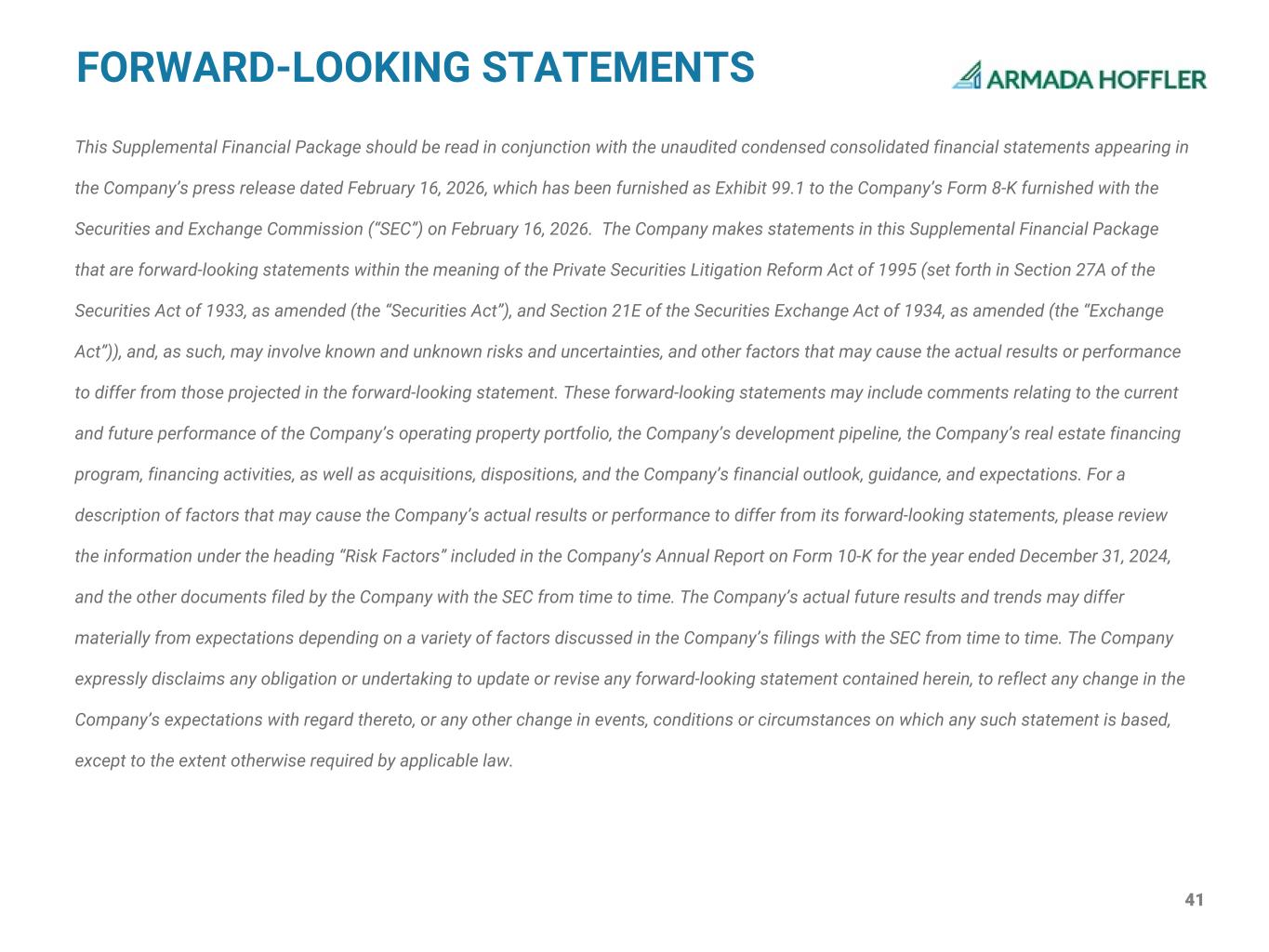 41 This Supplemental Financial Package should be read in conjunction with the unaudited condensed consolidated financial statements appearing in the Company’s press release dated February 16, 2026, which has been furnished as to the Company’s Form 8-K furnished with the Securities and Exchange Commission (“SEC”) on February 16, 2026. The Company makes statements in this Supplemental Financial Package that are forward-looking statements within the meaning of the Private Securities Litigation Reform Act of 1995 (set forth in Section 27A of the Securities Act of 1933, as amended (the “Securities Act”), and Section 21E of the Securities Exchange Act of 1934, as amended (the “Exchange Act”)), and, as such, may involve known and unknown risks and uncertainties, and other factors that may cause the actual results or performance to differ from those projected in the forward-looking statement. These forward-looking statements may include comments relating to the current and future performance of the Company’s operating property portfolio, the Company’s development pipeline, the Company’s real estate financing program, financing activities, as well as acquisitions, dispositions, and the Company’s financial outlook, guidance, and expectations. For a description of factors that may cause the Company’s actual results or performance to differ from its forward-looking statements, please review the information under the heading “Risk Factors” included in the Company’s Annual Report on Form 10-K for the year ended December 31, 2024, and the other documents filed by the Company with the SEC from time to time. The Company’s actual future results and trends may differ materially from expectations depending on a variety of factors discussed in the Company’s filings with the SEC from time to time. The Company expressly disclaims any obligation or undertaking to update or revise any forward-looking statement contained herein, to reflect any change in the Company’s expectations with regard thereto, or any other change in events, conditions or circumstances on which any such statement is based, except to the extent otherwise required by applicable law. FORWARD-LOOKING STATEMENTS