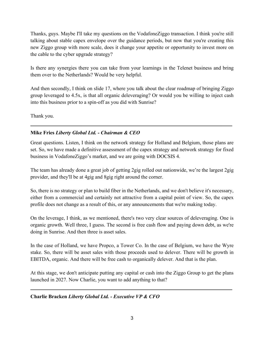 3 Thanks, guys. Maybe I'll take my questions on the VodafoneZiggo transaction. I think you're still talking about stable capex envelope over the guidance periods, but now that you're creating this new Ziggo group with more scale, does it change your appetite or opportunity to invest more on the cable to the cyber upgrade strategy? Is there any synergies there you can take from your learnings in the Telenet business and bring them over to the Netherlands? Would be very helpful. And then secondly, I think on slide 17, where you talk about the clear roadmap of bringing Ziggo group leveraged to 4.5x, is that all organic deleveraging? Or would you be willing to inject cash into this business prior to a spin-off as you did with Sunrise? Thank you. ─────────────────────────────────────────────────────── Mike Fries Liberty Global Ltd. - Chairman & CEO Great questions. Listen, I think on the network strategy for Holland and Belgium, those plans are set. So, we have made a definitive assessment of the capex strategy and network strategy for fixed business in VodafoneZiggo’s market, and we are going with DOCSIS 4. The team has already done a great job of getting 2gig rolled out nationwide, we’re the largest 2gig provider, and they'll be at 4gig and 8gig right around the corner. So, there is no strategy or plan to build fiber in the Netherlands, and we don't believe it's necessary, either from a commercial and certainly not attractive from a capital point of view. So, the capex profile does not change as a result of this, or any announcements that we're making today. On the leverage, I think, as we mentioned, there's two very clear sources of deleveraging. One is organic growth. Well three, I guess. The second is free cash flow and paying down debt, as we're doing in Sunrise. And then three is asset sales. In the case of Holland, we have Propco, a Tower Co. In the case of Belgium, we have the Wyre stake. So, there will be asset sales with those proceeds used to delever. There will be growth in EBITDA, organic. And there will be free cash to organically delever. And that is the plan. At this stage, we don't anticipate putting any capital or cash into the Ziggo Group to get the plans launched in 2027. Now Charlie, you want to add anything to that? ─────────────────────────────────────────────────────── Charlie Bracken Liberty Global Ltd. - Executive VP & CFO