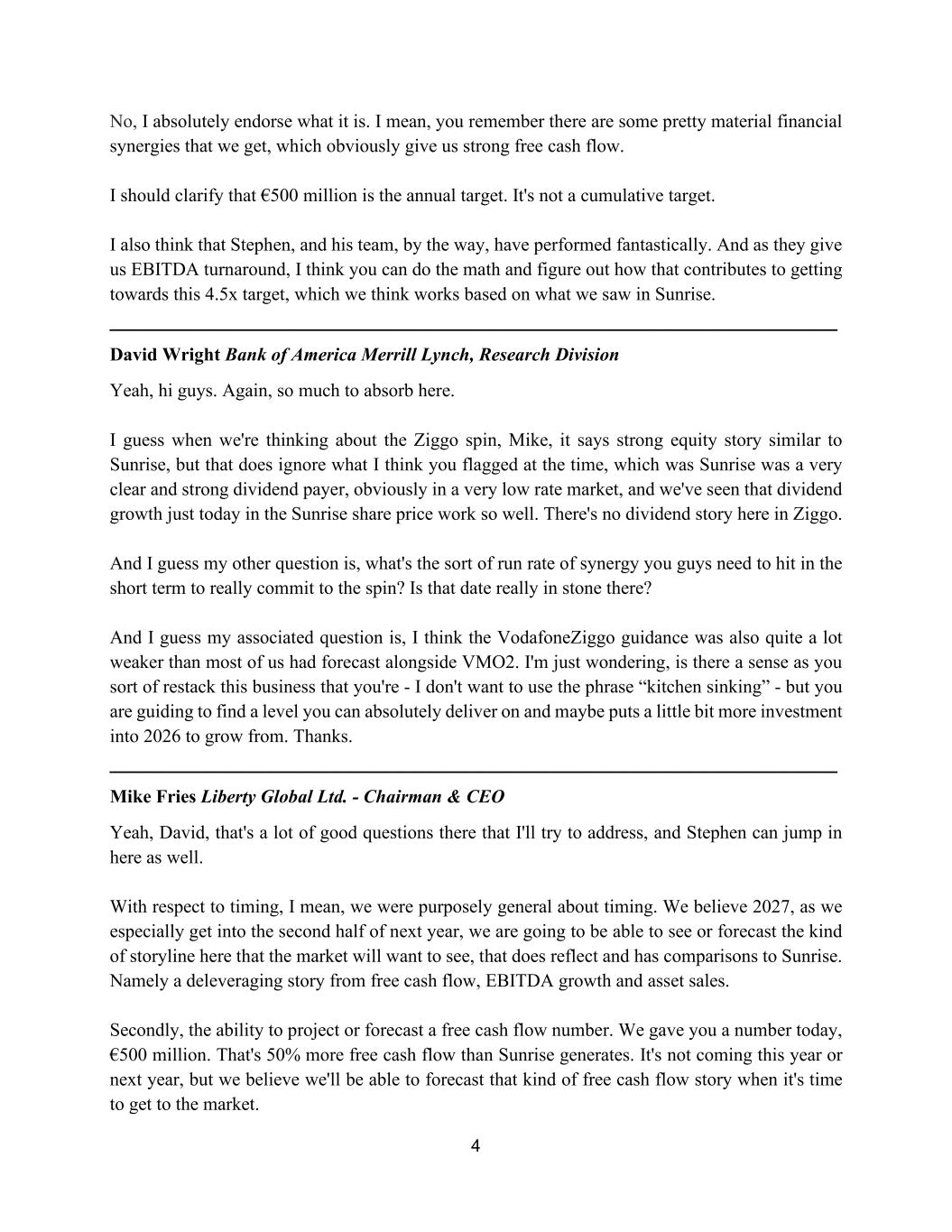 4 No, I absolutely endorse what it is. I mean, you remember there are some pretty material financial synergies that we get, which obviously give us strong free cash flow. I should clarify that €500 million is the annual target. It's not a cumulative target. I also think that Stephen, and his team, by the way, have performed fantastically. And as they give us EBITDA turnaround, I think you can do the math and figure out how that contributes to getting towards this 4.5x target, which we think works based on what we saw in Sunrise. ─────────────────────────────────────────────────────── David Wright Bank of America Merrill Lynch, Research Division Yeah, hi guys. Again, so much to absorb here. I guess when we're thinking about the Ziggo spin, Mike, it says strong equity story similar to Sunrise, but that does ignore what I think you flagged at the time, which was Sunrise was a very clear and strong dividend payer, obviously in a very low rate market, and we've seen that dividend growth just today in the Sunrise share price work so well. There's no dividend story here in Ziggo. And I guess my other question is, what's the sort of run rate of synergy you guys need to hit in the short term to really commit to the spin? Is that date really in stone there? And I guess my associated question is, I think the VodafoneZiggo guidance was also quite a lot weaker than most of us had forecast alongside VMO2. I'm just wondering, is there a sense as you sort of restack this business that you're - I don't want to use the phrase “kitchen sinking” - but you are guiding to find a level you can absolutely deliver on and maybe puts a little bit more investment into 2026 to grow from. Thanks. ─────────────────────────────────────────────────────── Mike Fries Liberty Global Ltd. - Chairman & CEO Yeah, David, that's a lot of good questions there that I'll try to address, and Stephen can jump in here as well. With respect to timing, I mean, we were purposely general about timing. We believe 2027, as we especially get into the second half of next year, we are going to be able to see or forecast the kind of storyline here that the market will want to see, that does reflect and has comparisons to Sunrise. Namely a deleveraging story from free cash flow, EBITDA growth and asset sales. Secondly, the ability to project or forecast a free cash flow number. We gave you a number today, €500 million. That's 50% more free cash flow than Sunrise generates. It's not coming this year or next year, but we believe we'll be able to forecast that kind of free cash flow story when it's time to get to the market.