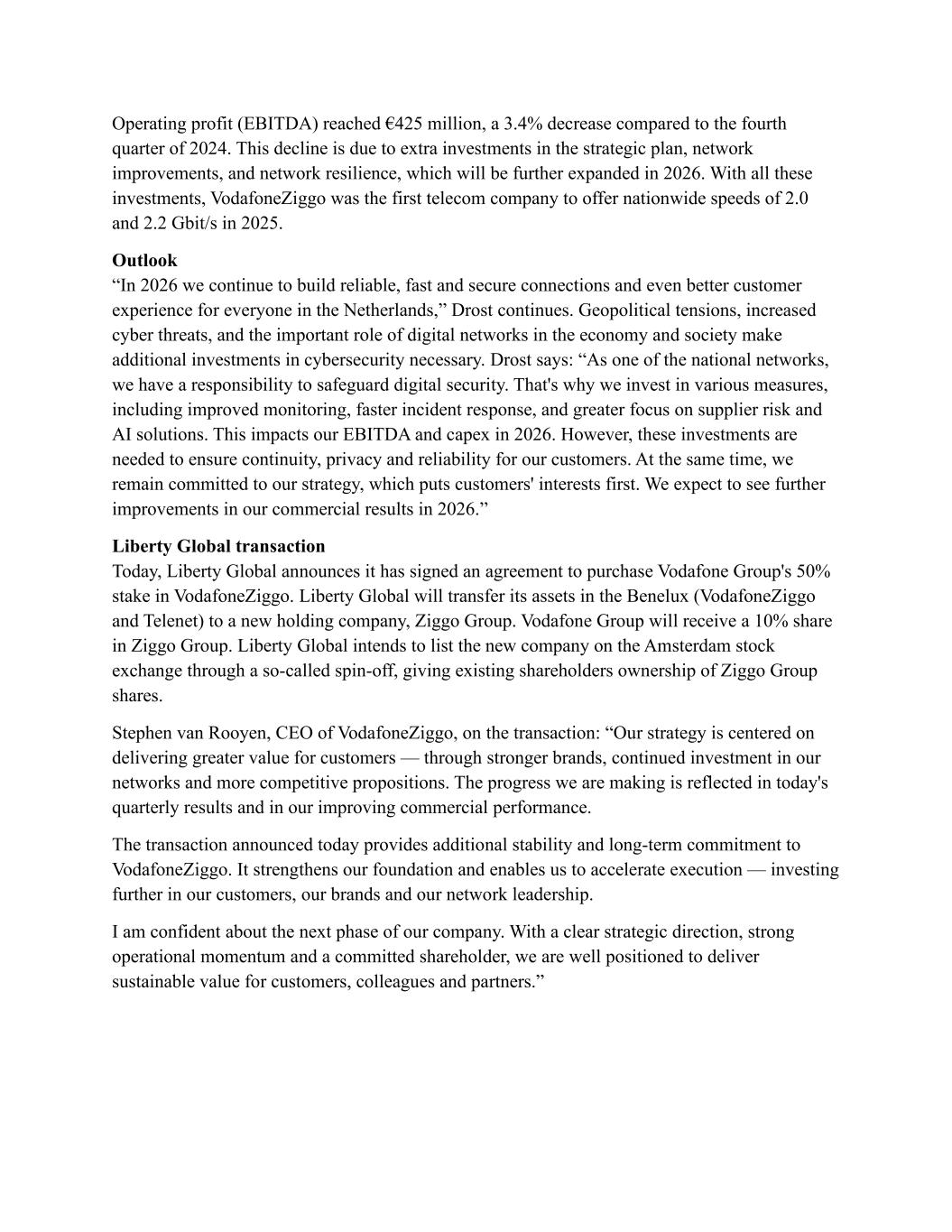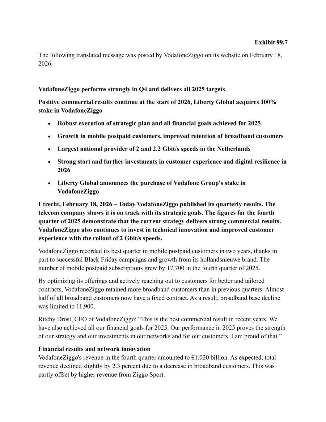 .7 The following translated message was posted by VodafoneZiggo on its website on February 18, 2026. VodafoneZiggo performs strongly in Q4 and delivers all 2025 targets Positive commercial results continue at the start of 2026, Liberty Global acquires 100% stake in VodafoneZiggo • Robust execution of strategic plan and all financial goals achieved for 2025 • Growth in mobile postpaid customers, improved retention of broadband customers • Largest national provider of 2 and 2.2 Gbit/s speeds in the Netherlands • Strong start and further investments in customer experience and digital resilience in 2026 • Liberty Global announces the purchase of Vodafone Group's stake in VodafoneZiggo Utrecht, February 18, 2026 – Today VodafoneZiggo published its quarterly results. The telecom company shows it is on track with its strategic goals. The figures for the fourth quarter of 2025 demonstrate that the current strategy delivers strong commercial results. VodafoneZiggo also continues to invest in technical innovation and improved customer experience with the rollout of 2 Gbit/s speeds. VodafoneZiggo recorded its best quarter in mobile postpaid customers in two years, thanks in part to successful Black Friday campaigns and growth from its hollandsnieuwe brand. The number of mobile postpaid subscriptions grew by 17,700 in the fourth quarter of 2025. By optimizing its offerings and actively reaching out to customers for better and tailored contracts, VodafoneZiggo retained more broadband customers than in previous quarters. Almost half of all broadband customers now have a fixed contract. As a result, broadband base decline was limited to 11,900. Ritchy Drost, CFO of VodafoneZiggo: “This is the best commercial result in recent years. We have also achieved all our financial goals for 2025. Our performance in 2025 proves the strength of our strategy and our investments in our networks and for our customers. I am proud of that.” Financial results and network innovation VodafoneZiggo's revenue in the fourth quarter amounted to €1.020 billion. As expected, total revenue declined slightly by 2.3 percent due to a decrease in broadband customers. This was partly offset by higher revenue from Ziggo Sport.