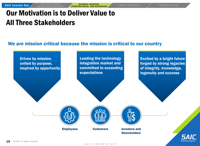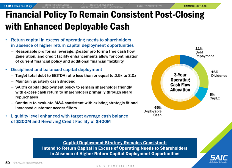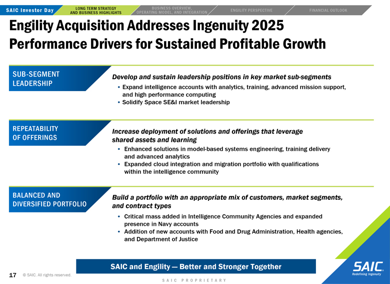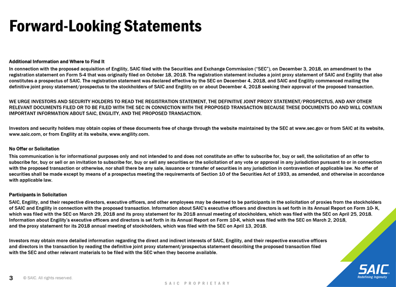 actual results or changes in SAIC’s or Engility’s expectations. SAIC and Engility also disclaims any duty to comment upon or correct information that may be contained in reports published by investment analysts or others. 2