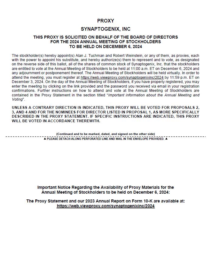 PROXY SYNAPTOGENIX, INC THIS PROXY IS SOLICITED ON BEHALF OF THE BOARD OF DIRECTORS FOR THE 2024 ANNUAL MEETING OF STOCKHOLDERS TO BE HELD ON DECEMBER 6, 2024 The stockholder(s) hereby appoint(s) Alan J. Tuchman and Robert Weinstein, or any of them, as proxies, each with the power to appoint his substitute, and hereby authorize(s) them to represent and to vote, as designated on the reverse side of this ballot, all of the shares of common stock of Synaptogenix, Inc. that the stockholders are entitled to vote at the Annual Meeting of Stockholders to be held at 11:00 a.m. ET on December 6, 2024 and any adjournment or postponement thereof. The Annual Meeting of Stockholders will be held virtually. In order to attend the meeting, you must register at https://web.viewproxy.com/synaptogenixinc/2024 by 11:59 p.m. ET on December 3, 2024. On the day of the Annual Meeting of Stockholders, if you have properly registered, you may enter the meeting by clicking on the link provided and the password you received via email in your registration confirmations. Further instructions on how to attend and vote at the Annual Meeting of Stockholders are contained in the Proxy Statement in the section titled “Important information about the Annual Meeting and Voting”. UNLESS A CONTRARY DIRECTION IS INDICATED, THIS PROXY WILL BE VOTED FOR PROPOSALS 2, 3, AND 4 AND FOR THE NOMINEES FOR DIRECTOR LISTED IN PROPOSAL 1, AS MORE SPECIFICALLY DESCRIBED IN THE PROXY STATEMENT. IF SPECIFIC INSTRUCTIONS ARE INDICATED, THIS PROXY WILL BE VOTED IN ACCORDANCE THEREWITH. Important Notice Regarding the Availability of Proxy Materials for the Annual Meeting of Stockholders to be held on December 6, 2024: The Proxy Statement and our 2023 Annual Report on Form 10-K are available at: https://web.viewproxy.com/synaptogenixinc/2024