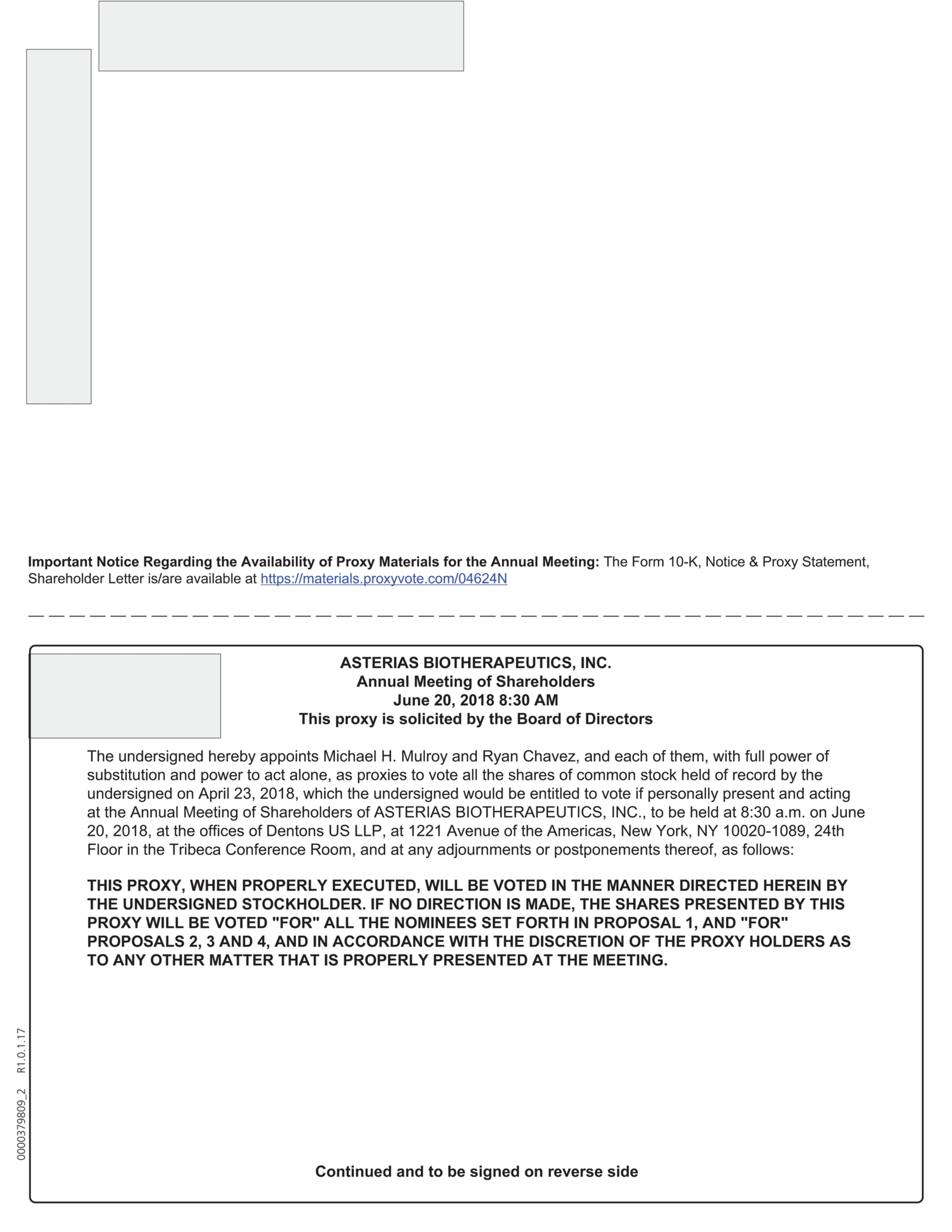 You are cordially invited to attend the 2018 Annual Meeting of Shareholders of Asterias Biotherapeutics, Inc., which will be held on June 20, 2018 at 8:30 a.m. eastern time at the offices of Dentons US LLP, at 1221 Avenue of the Americas, New York, NY 10020-1089. The meeting will be held at the 24th Floor in the Tribeca Conference Room.